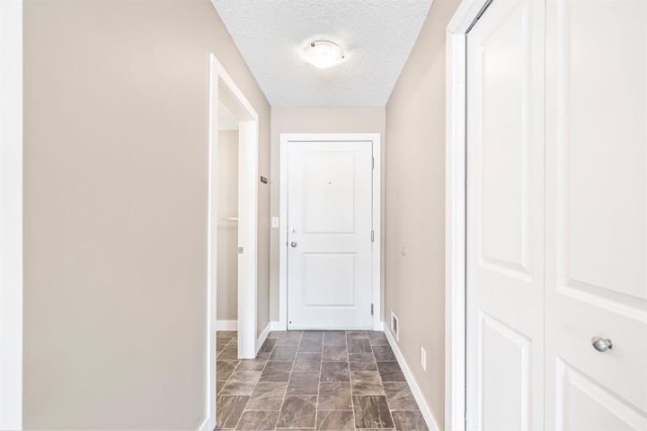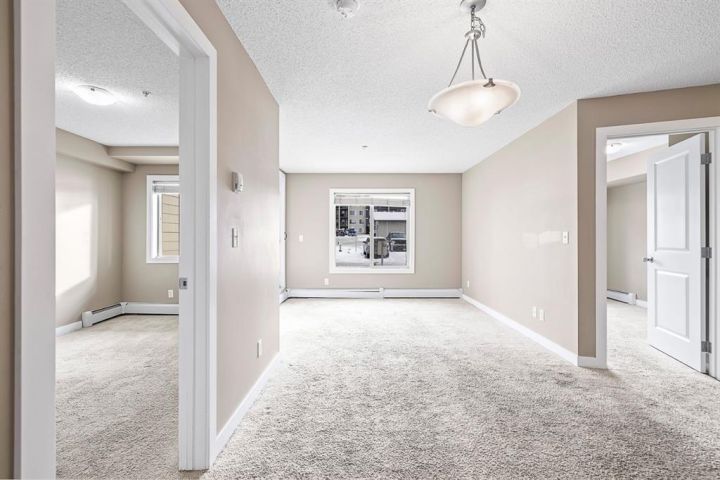Welcome to comfort, convenience and true walkability in the heart of Cochrane. This bright and inviting 2 bedroom, 2 full bathroom ground floor suite in Glenbow Landing offers an ideal blend of accessibility and modern living, complete with one titled underground parking stall and one assigned surface stall. This SE facing home features a smart, open layout with large windows and bedrooms thoughtfully positioned on opposite sides of the unit perfect for first time buyers, downsizers or investors looking for a functional and highly rentable floor plan. The kitchen is well appointed with stainless steel appliances, granite counters, tile backsplash, abundant cabinetry, a breakfast bar and a generous pantry closet. The living and dining area provides comfortable space for full sized furniture and opens onto the enclosed ground level balcony, offering privacy, security and an extended outdoor living area you can enjoy through multiple seasons. The spacious primary bedroom includes a walk through closet and a 3 piece ensuite with granite counters and a large stand up shower. The second bedroom is located beside the 4 piece main bath, making it ideal for guests, a home office or a roommate setup. An in suite laundry room with extra storage adds everyday convenience. Additional features include a welcoming front entry with a full sized coat closet and the ease of ground floor access, perfect for those who prefer no stairs. Condo fees include heat and water, adding value and simplicity to your monthly expenses. Situated just steps from Cochrane’s restaurants, coffee shops, grocery stores, parks and pathways, this move in ready home offers an easy, walkable lifestyle in one of the community’s most convenient locations. A fantastic opportunity for ownership or investment in sought after Glenbow Landing.