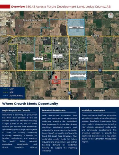 Click brochure link for more details** 80.43 acres ± of future development land. Land neighbours City of Beaumont, located in Leduc County. Ideal for current agricultural use, agri-business ventures, or as a strategic investment for future value growth. Quick access to amenities and major transportation routes from Highway 625 (Township Road 504). Close proximity to Beaumont, Nisku, and the EIA