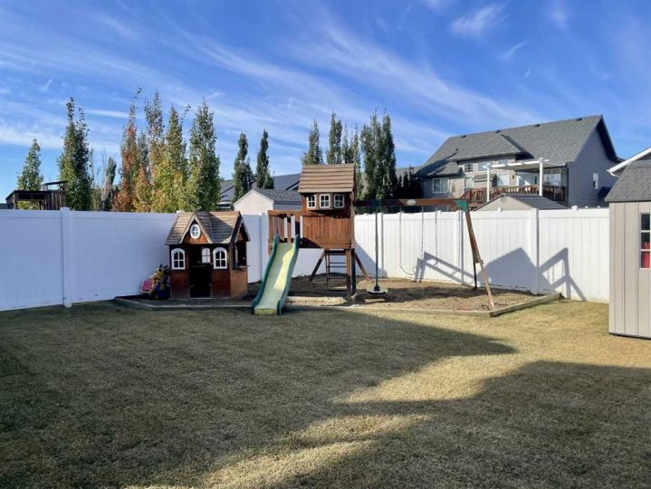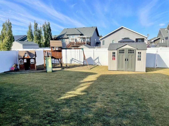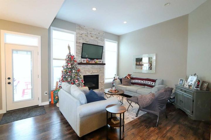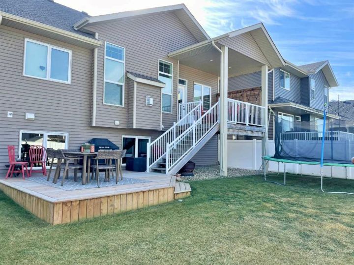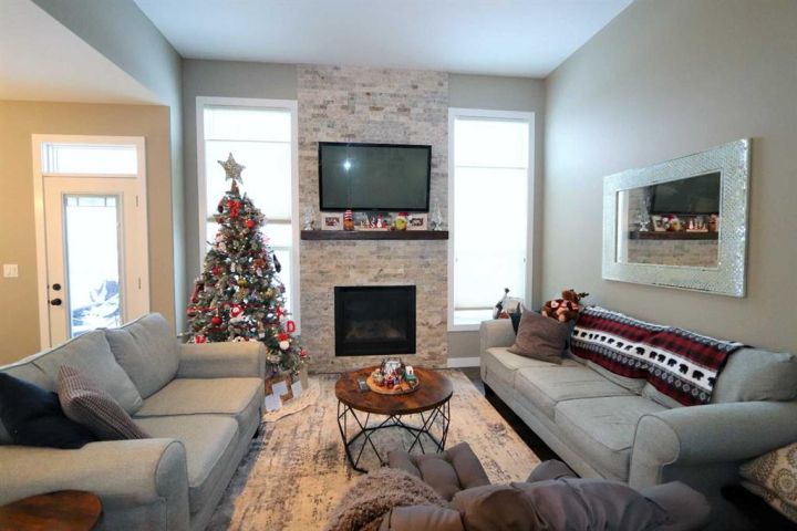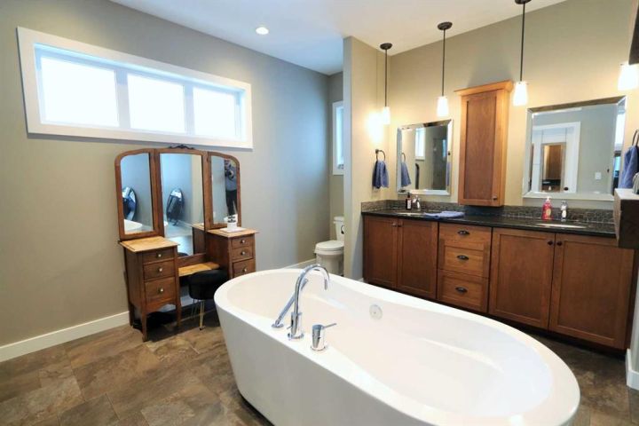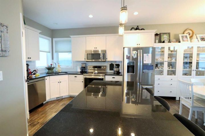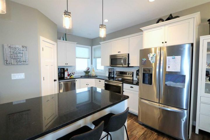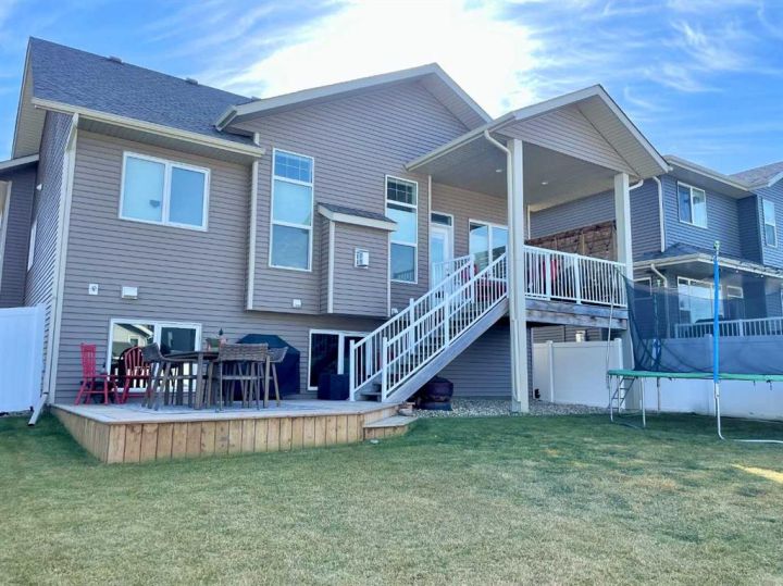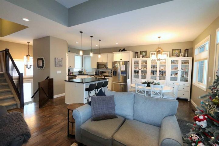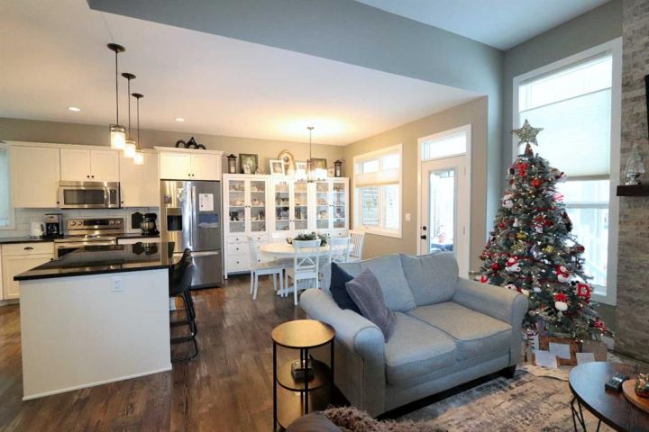 Discover this impressive modified bi-level situated in a highly desirable Riverside location. Designed with comfort and functionality in mind, the open-concept main living area features 9-ft ceilings throughout and a raised ceiling in the living room, adding to the sense of space and showcasing the striking floor-to-ceiling stone fireplace. The kitchen offers an ideal layout for everyday living and entertaining, complete with a large island, quality granite countertops, pantry and stainless steel appliances. The main floor includes two well-appointed bedrooms and a full bathroom, while the stunning primary suite is set just a few steps up for added privacy. This retreat features barn-style tracked doors, a spacious walk-in shower, large vanity, walk-in closet, and a beautiful freestanding tub positioned as the focal point of the spacious ensuite. The fully finished basement with in-floor heat expands the living space with a bright family/rec room, thanks to generous windows that fill the area with natural light. In-floor heat adds welcome comfort and efficiency. A fourth bedroom and an additional full bathroom complete the lower level. Enjoy the back yard with maintenance-free vinyl fencing, a large play area for kids, and relax or entertain on lower deck or covered deck off the dining area. The 24×26 heated attached garage has an epoxy floor coating, other recent upgrades include new shingles and siding in 2023. There's an additional electrical and gas services should you wish to build a second garage. This property combines thoughtful design, modern comfort, and an unbeatable location—truly a place to call home.