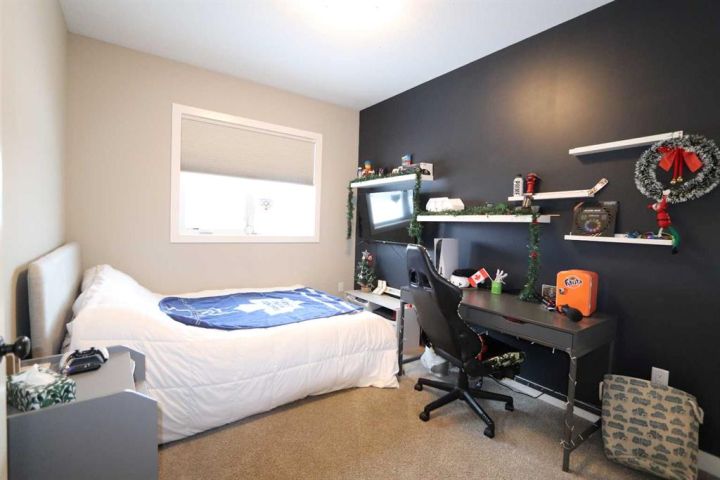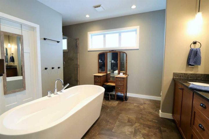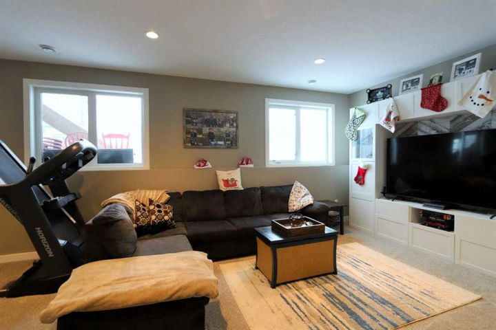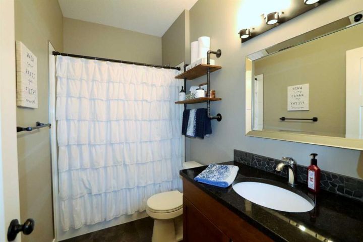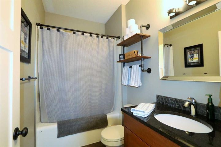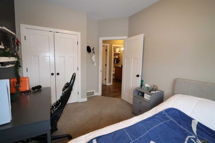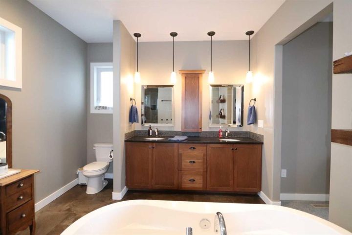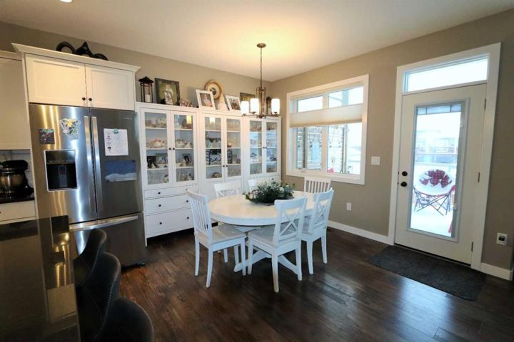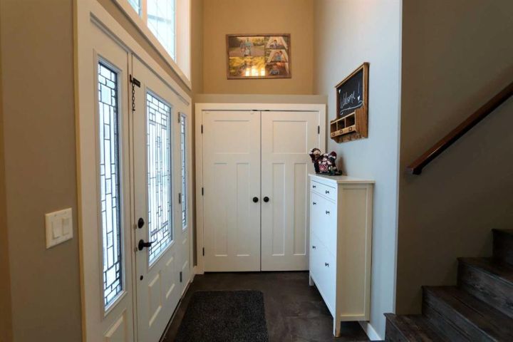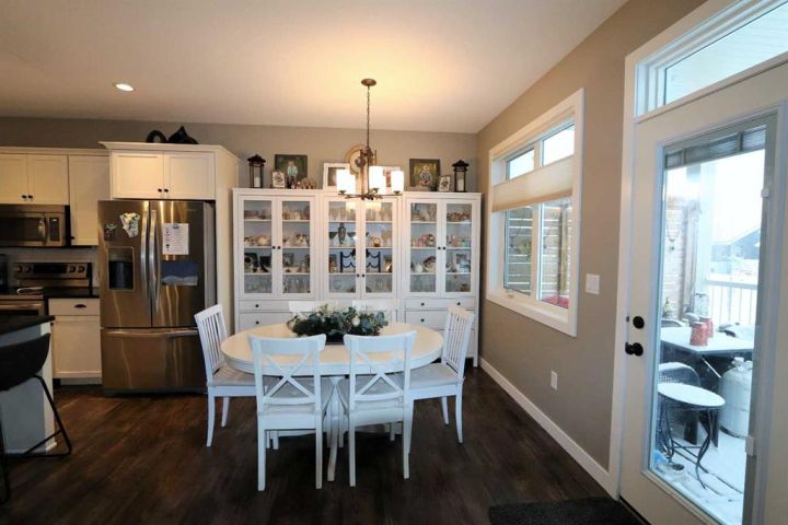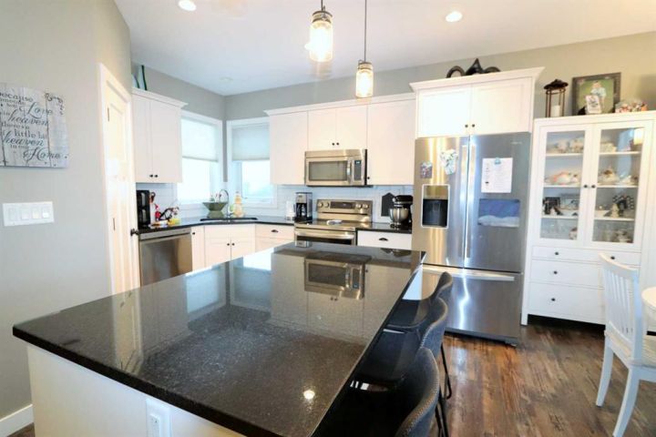 Discover this impressive modified bi-level situated in a highly desirable Riverside location. Designed with comfort and functionality in mind, the open-concept main living area features 9-ft ceilings throughout and a raised ceiling in the living room, adding to the sense of space and showcasing the striking floor-to-ceiling stone fireplace. The kitchen offers an ideal layout for everyday living and entertaining, complete with a large island, quality granite countertops, pantry and stainless steel appliances. The main floor includes two well-appointed bedrooms and a full bathroom, while the stunning primary suite is set just a few steps up for added privacy. This retreat features barn-style tracked doors, a spacious walk-in shower, large vanity, walk-in closet, and a beautiful freestanding tub positioned as the focal point of the spacious ensuite. The fully finished basement with in-floor heat expands the living space with a bright family/rec room, thanks to generous windows that fill the area with natural light. In-floor heat adds welcome comfort and efficiency. A fourth bedroom and an additional full bathroom complete the lower level. Enjoy the back yard with maintenance-free vinyl fencing, a large play area for kids, and relax or entertain on lower deck or covered deck off the dining area. The 24×26 heated attached garage has an epoxy floor coating, other recent upgrades include new shingles and siding in 2023. There's an additional electrical and gas services should you wish to build a second garage. This property combines thoughtful design, modern comfort, and an unbeatable location—truly a place to call home.