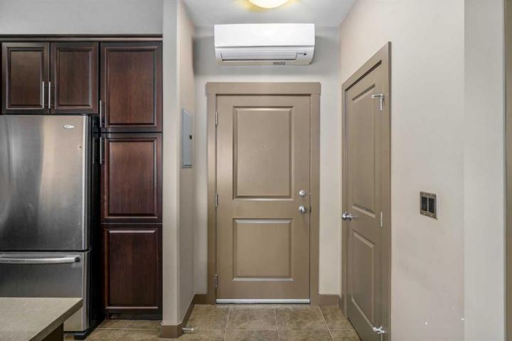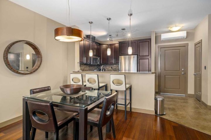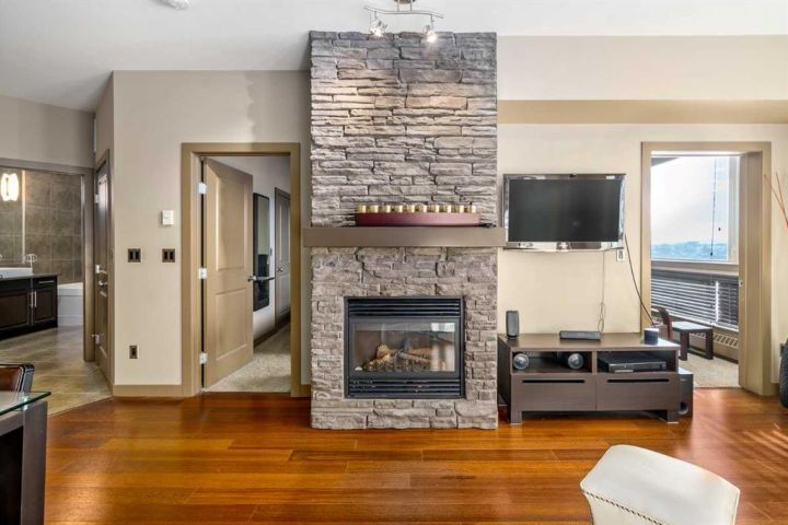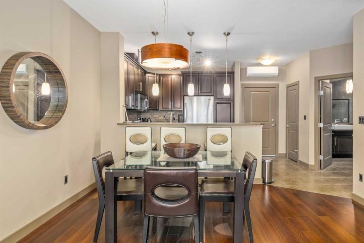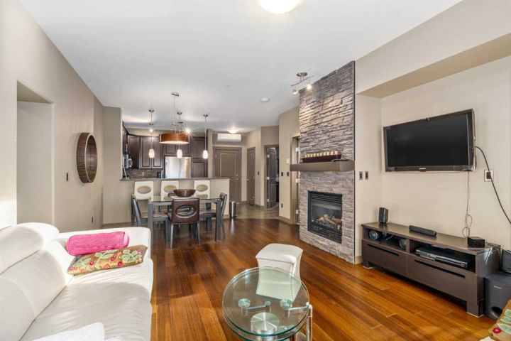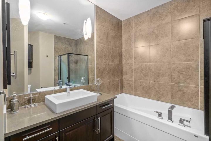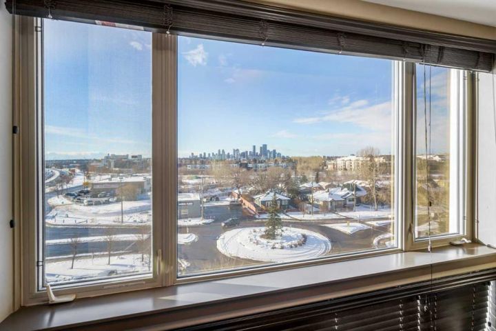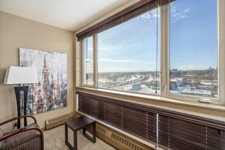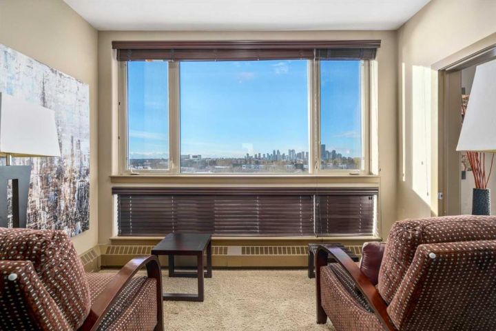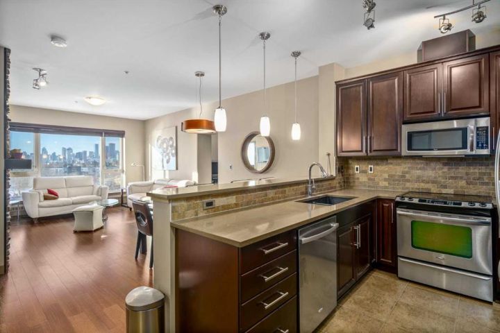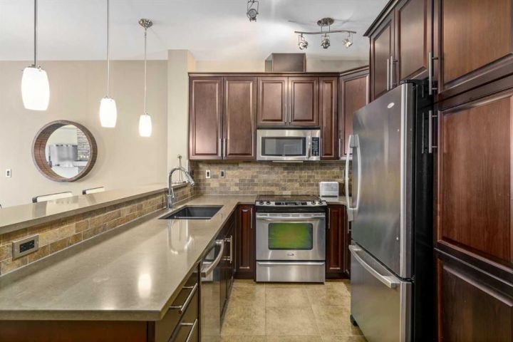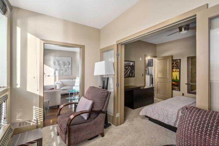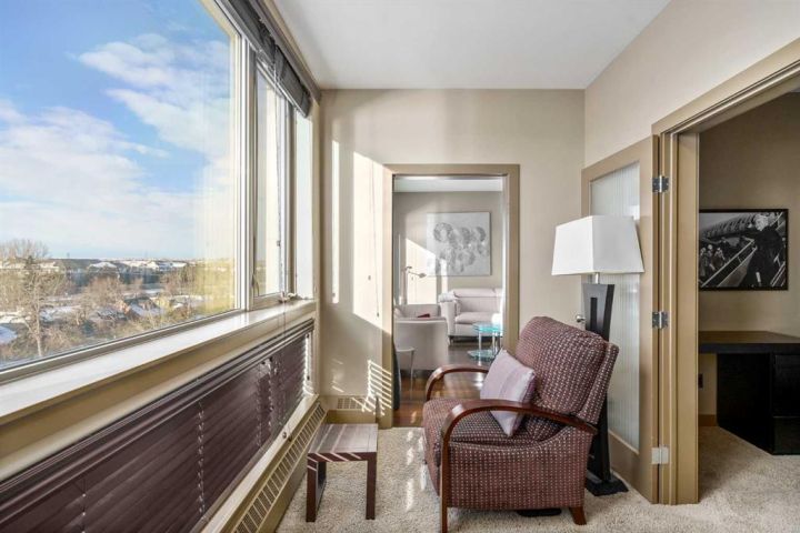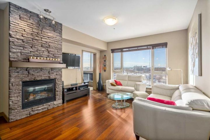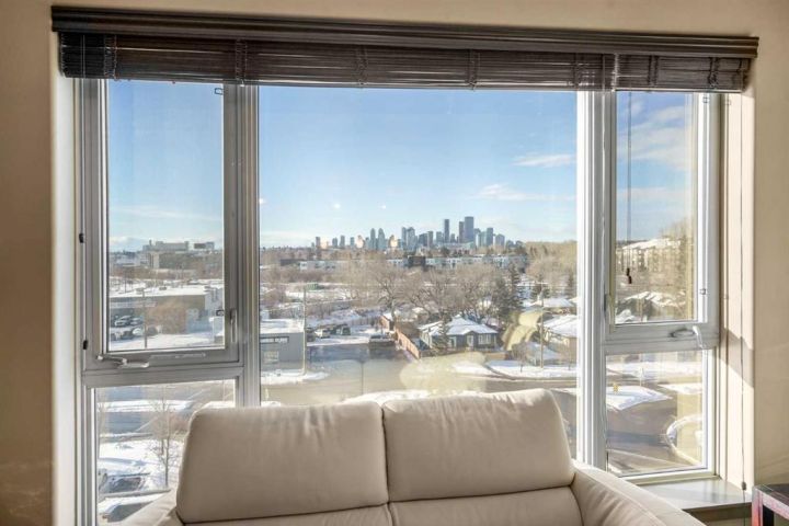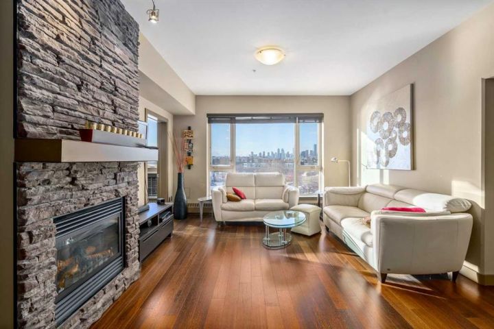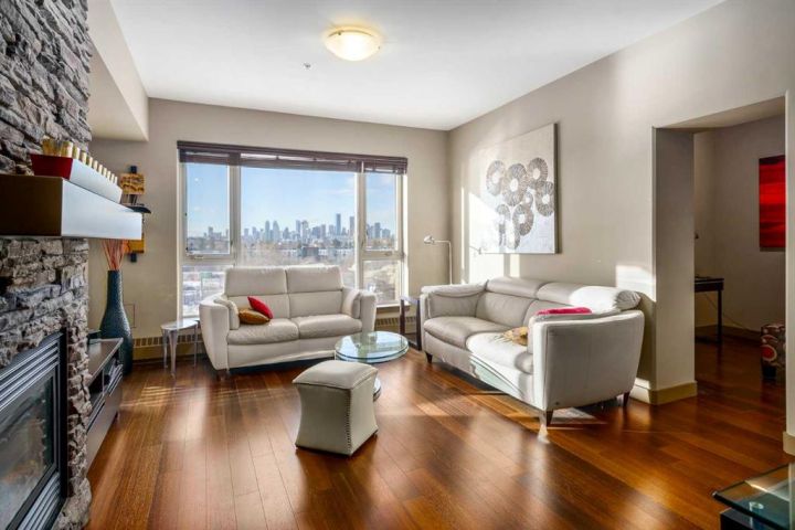 AMAZING VIEWS, INCREDIBLE INNER CITY LOCATION, LUXURY LIVING in this AMENITY RICH COMPLEX. Grande House in SoBow beckons with its warm exterior facade of brick and stone and captures the essence of Historic Inglewood. Concierge services greet you as you enter the spacious front foyer of this concrete building. Stepping into this West facing 5th floor condo your eyes move to the unobstructed views of the city and lush green neighborhood - a picturesque backdrop to a spacious open floor plan. Espresso stained cabinetry is overlaid with gleaming granite counters and is offset with stainless steel appliances in this step saving kitchen that maximizes the ample use of work space and offers the additional casual eating area at the raised eating bar. Flooded with natural light a full bank of floor to ceiling windows highlights the 9 foot ceilings and creates a spacious ambience for relaxing. A sectional will fit comfortably in the Great Room where you can enjoy the A/C in summer or the fireplace in the cooler days ahead. Thoughtfully planned, this unit features a sun room adjacent to the primary bedroom which opens up to the view of the mountains in the morning and the nightlights of the city by evening. A flexible layout in the primary bedroom suits a king sized bed. The four piece main bath is complete with a deep soaker tub, walk-in shower, and a great sized vanity that includes doors and drawers for toiletries and towels. This floor plan also includes a private den/office offset from the Great Room as well as a laundry room with a stacking washer/dryer. This amenity rich building includes a state of the art gym facility, a recreation room with pool tables and foosball table, a movie area complete with recliners; all accessed through Grande House and included in the condo fees which also include water/waste and heat. Inglewood embraces a lifestyle that delivers shops, boutiques and eateries all within walking distance. Pearce Estate Park, the Bow River and the Inglewood Bird Sanctuary are your neighbors at SoBow. Titled Parking and a titled storage locker are found in the secure underground heated parking garage. Call today for your private viewing! Immediate Possession.