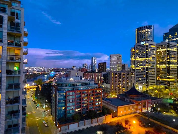 Be Home for a Luxury Christmas! This beautiful and luxurious 17th floor, 2 bedroom and 2 bath in a concrete building, will take your breath away. Flooded with beautiful light, this south east corner unit, has amazing city and river views. Very open plan with gourmet kitchen, with gas stove, quart counters, large eating bar. South facing living room with gas fireplace. Master bedroom has a spa style suite, and duel closets. Second bedroom has a built-in murphy bed and is well located, for privacy making it ideal for a roommate. Underground parking and storage locker are included. Building amenities include a fitness center (weight, cardio equipment and jacuzzi tub), social room, theatre, and of a concierge desk. Lots of visitor parking for friends and family. Prime Eau Claire location steps for coffee shops, restaurants, shopping, river walkways, bike paths, restaurants, downtown nightlife, and transit. Immediate possession. Furniture negotiable. Book your private showing today and take advantage of the renovation special pricing.