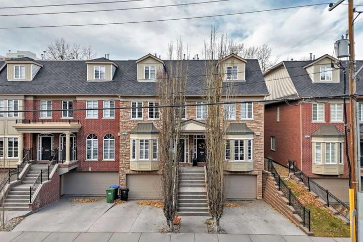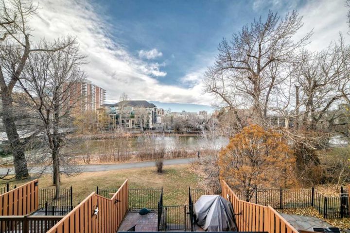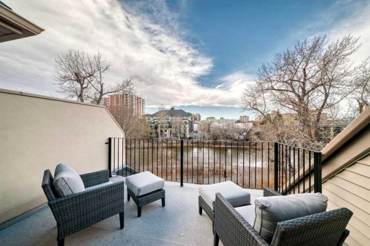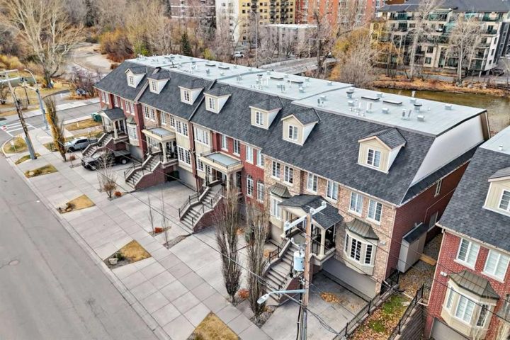 Click brochure link for more details. Wow! Stunning Luxury Executive Townhome in Prime Location! Large open living spaces with Phenomenal Natural Light! Hardwood floors throughout Fabulous Gourmet Kitchen open to huge dining + great room with feature fireplace. Terrace doors to stunning private outdoor living/entertaining spaces overlooking the Elbow River. The second floor features a stunning master bedroom with river views + balcony, luxury ensuite bath, and a second bedroom with additional full bath. Third floor phenomenal family room with wet bar, large balcony with city + river views. Office/3rd bedroom with ensuite bath. Double under house garage. Walk to shops, restaurants, downtown, from this superb address!