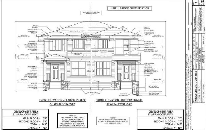 NOW WITH $10,000 INCENTIVE APPLIED TO THE PRICE! Welcome to 47 Appaloosa Way, a brand-new, never-lived-in half duplex—the popular Frontier model—expertly constructed by Daytona Homes in the thriving community of Heartland, Cochrane. Offering 1,433 square feet of modern, two-storey living space, this home features 3 comfortable bedrooms, 2.5 thoughtfully designed bathrooms, and a bright, open-concept main floor enhanced by 9-foot ceilings, flowing seamlessly from the front Great Room through the Dining Nook to the rear Kitchen. Designed for family convenience, the upper level hosts a dedicated Primary Suite with a private ensuite and walk-in closet, two secondary bedrooms, and a laundry room, while the lower level boasts a valuable side entrance and a 9-foot foundation, providing ideal flexibility for future development. Nestled in a family-focused community at the foot of the Rocky Mountains, Heartland offers immediate access to walking trails and parks, combining the tranquility of small-town life with a quick commute to Calgary, making this quality-built Frontier the perfect place to start your new mountain-view life.