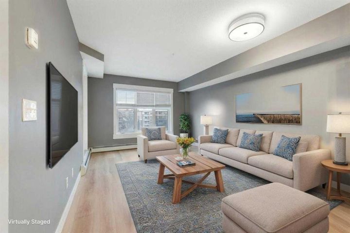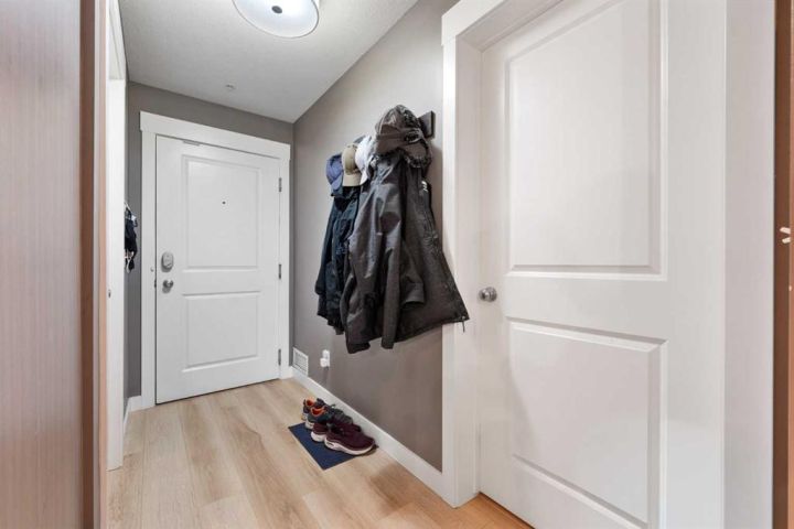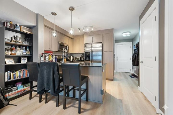 Welcome to your next home in Mahogany—one of Calgary’s most sought-after lake communities, where convenience, comfort, and year-round recreation come together. Located in the well-designed 51 Oak complex, this third-floor condo offers a wonderful blend of modern style and effortless living. Almost new and built around a beautifully landscaped central courtyard, the development features three thoughtfully arranged buildings that create a quiet, welcoming atmosphere from the moment you arrive. Inside, 2 bed home is bright, spacious, and impressively functional. Fresh new flooring installed in 2024 adds a clean, updated feel throughout. The open kitchen is designed for everyday ease—complete with sparkling stainless steel appliances (including a fridge with water and ice), granite countertops, a deep double sink with a bistro-style faucet, tall cabinetry, and a stylish subway tile backsplash. A convenient breakfast bar connects the kitchen to the main living area, creating an inviting space for both relaxing and entertaining. Large windows fill the home with natural light and offer a lovely view of the quiet courtyard below. The bathroom features a modern vessel sink and a deep soaker tub—ideal for unwinding at the end of the day. You’ll also enjoy the practicality of an in-suite stackable front-load washer and dryer. Step outside onto the spacious balcony, perfectly sized for enjoying a morning coffee, an evening beverage, or a bit of fresh air any time of day. Parking and storage are easy with your titled underground stall and attached storage locker—keeping your gear, tools, and seasonal items secure and out of the way. Living in Mahogany means having access to an incredible list of amenities: lake access for swimming, skating and fishing, beautifully maintained beaches, tennis courts, scenic ponds, endless walking trails, and vibrant community events. Shops, restaurants, groceries, and services are just minutes away, making day-to-day life simple and enjoyable. If you’ve been searching for a well-maintained, move-in-ready condo in a community that offers more than just a place to live, this home at 51 Oak delivers the lifestyle you’ve been waiting for.