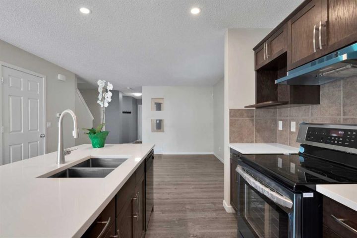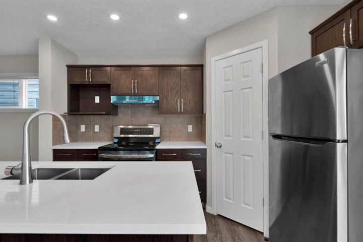 Welcome to this beautifully updated 3-bedroom, 2.5-bathroom half duplex located in a quiet cul-de-sac in the sought-after community of Cranston. Directly across from a school and playground, this home offers a family-friendly location with plenty of additional street parking and convenient access to both Stoney Trail and Deerfoot Trail. The main floor boasts an open-concept layout with a bright living room, spacious dining area, and a functional kitchen complete with a central island—perfect for both everyday living and entertaining. Recent renovations include new quartz countertops, brand new stainless steel stove and hoodfan, modern lighting upgrades including pot lights, fresh paint throughout, and new carpet. Upstairs, you’ll find three well-sized bedrooms, including a primary suite with a walk-in closet and private 4-piece ensuite. Additional features include a single attached garage, a fully fenced backyard with a deck, and an unfinished basement ready for your personal touch. With no condo fees and a location close to schools, parks, shopping, Seton amenities, and the South Health Campus, this is a fantastic opportunity to own a move-in ready home in one of Calgary’s most desirable communities.