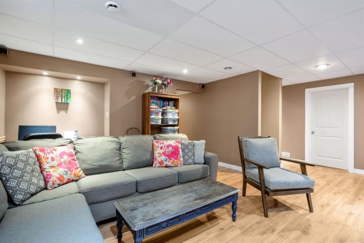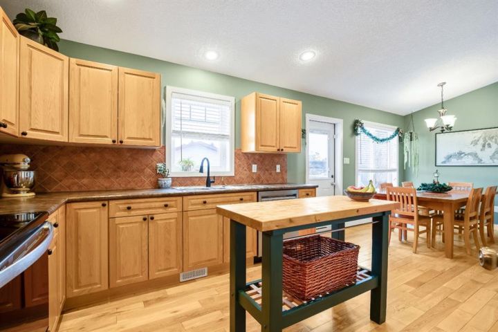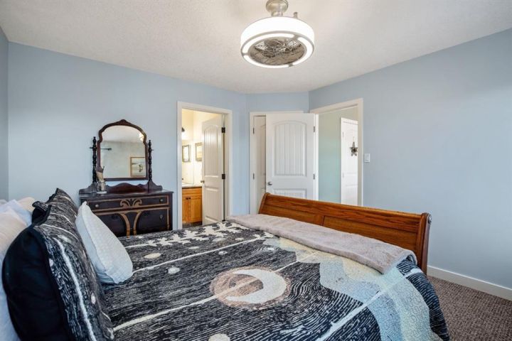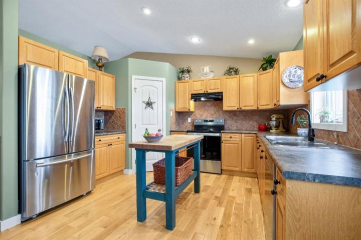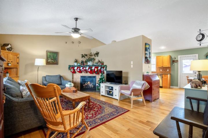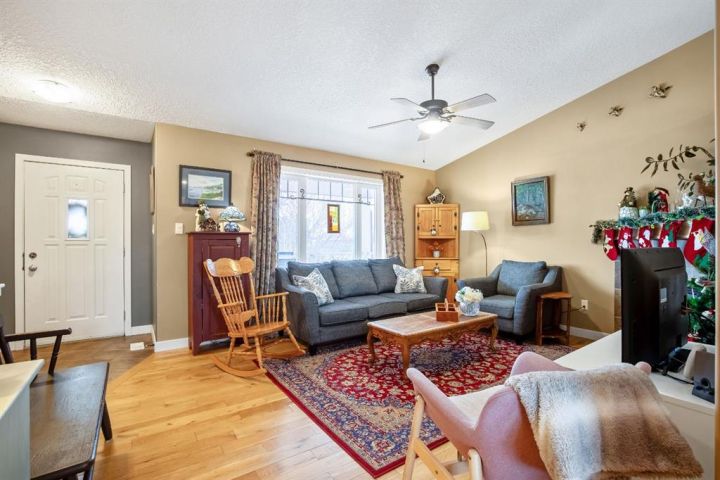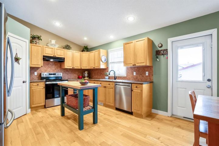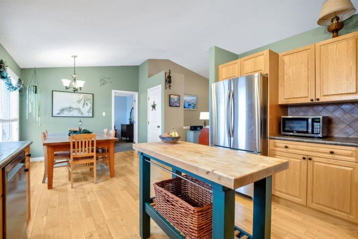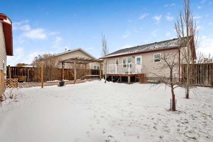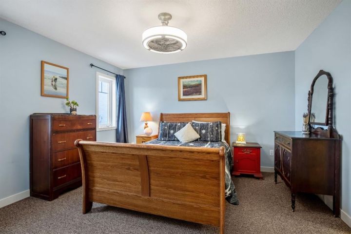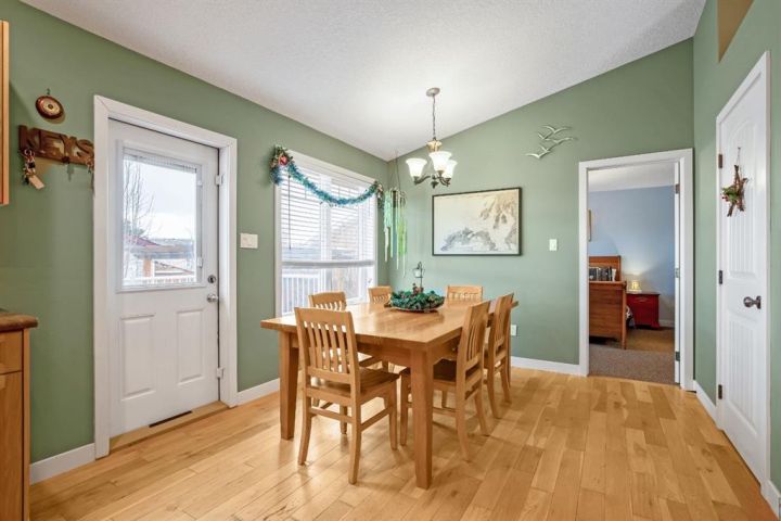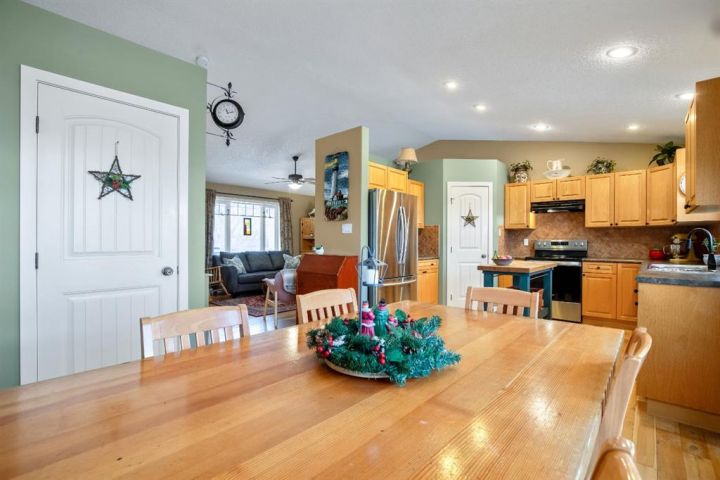 OPEN HOUSE — Saturday, 20 December | 11:00 a.m.–1:00 p.m. Warm, welcoming, and wonderfully practical this home fits the easy pace of Nanton living. Start your mornings on the east-facing covered front veranda with a coffee and a quiet moment, then enjoy summer evenings in the large west-facing back yard, set up for BBQs and relaxed entertaining and lots of established perennials to appreciate. Inside, vaulted ceilings and plenty of natural light create a bright, comfortable feel. The main floor is thoughtfully laid out, with bedrooms separated for privacy and each with its own bathroom, ideal for family, guests, or a home office setup. Downstairs, settle in for movie night in the theatre room, with two large bedrooms and a spacious bathroom with a walk-in shower. You’ll also appreciate newer appliances, a high-efficiency furnace, and a radon mitigation system. The oversized heated garage with 220V service is a standout, and there’s still ample room to park an RV—and even a boat that you can take out to several of our surrounding lakes—beside the garage.