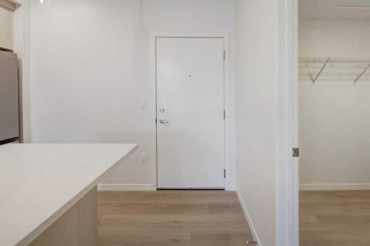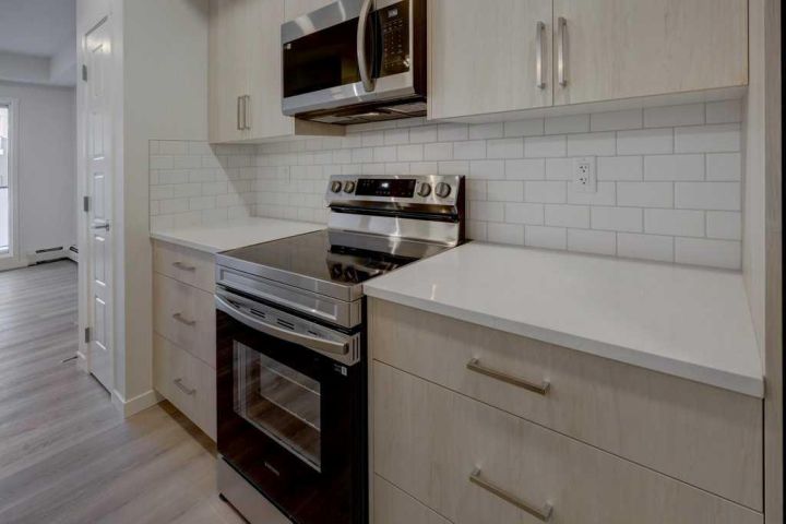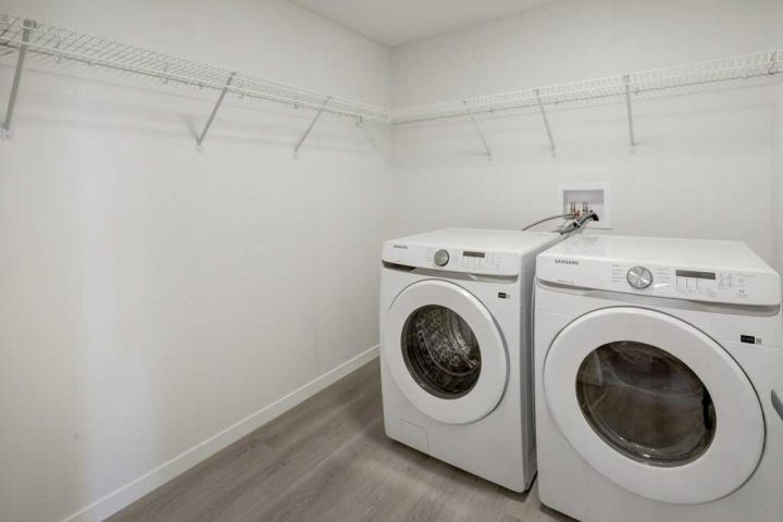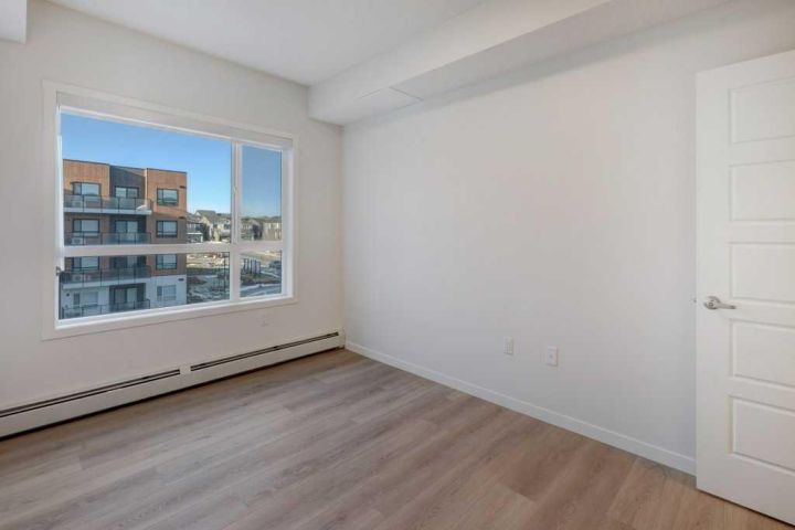 INTRODUCING GLACIER RIDGE, IN BEAUTIFUL NORTHWEST CALGARY. BUILT BY CEDARGLEN LIVING, WINNER OF THE Customer Insight BUILDER OF CHOICE AWARD, 6 YEARS RUNNING! BRAND NEW "GR04" unit with high-spec features. You will feel right at home in this well thought-out, 586.94 RMS sq.ft. 1 bed, 1 bath home with open plan, 9' ceilings, LVP flooring throughout (NO CARPET), Low E triple glazed windows, BBQ gas line on the patio, Fresh Air System (ERV), A/C rough-in, and so much more. The kitchen is spectacular with full height, two tone cabinets, quartz counters, upgraded bank of drawers for pots and pans, undermount sink, rough-in water line to the fridge and S/S appliances. The island is extensive with built in flush breakfast bar, which transitions into the spacious living area, perfect for entertaining. The spacious primary bedroom has a large bright window (triple pane windows) and sizeable walk-in closet. Right beside your bedroom is a 4pc bath with quartz counters, upgraded tiles to the ceiling, and undermount sink. Nearby is the spacious laundry/storage room, this is a must see (washer & dryer included). Highlights include: Hardie board siding, designer lighting package, sound reducing membrane to reduce sound transmission between floors, clear glass railing to balconies and 1 titled underground parking stall included. A once in a lifetime community in Northwest Calgary. Framed by views of the Rocky Mountains and distinguished by natural coulees that cross the land, Glacier Ridge offers a rare chance for families to live in a new community. PET FRIENDLY COMPLEX, IMMEDIATE POSSESSION AVAILABLE AND DON'T FORGET TO CHECK OUT THE VIRTUAL TOUR.