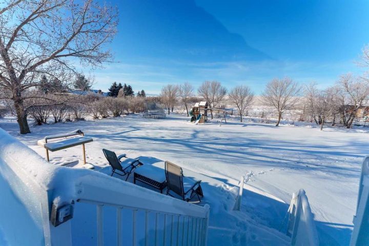 This exceptional 5-bedroom, 3-bath residence offers over 4,000 sq ft of beautifully appointed living space. It sits on 5 acres with sweeping mountain views and is set up for horses. Highlights include: extensive 2018 renovations, air conditioning, soaring ceilings, two fire places and a triple oversized garage. A striking entry with a curved staircase leads to a sun-filled living room featuring vaulted open-beam ceilings and a dramatic floor-to-ceiling stone wood-burning fireplace. The dining area opens to a west-facing deck, ideal for entertaining. The bright chef’s country kitchen is designed for gatherings, showcasing an oversized island, quartzite countertops, farmhouse sink, bar fridge, 6-burner gas range, and custom floor-to-ceiling cabinetry concealing the fridge/freezer. The spacious primary suite offers a walk-through closet and a spa-inspired 5-piece ensuite with a clawfoot tub. The walk-out lower level provides an inviting family retreat with fireplace, wet bar, generous entertaining space, two additional bedrooms, and a laundry/mudroom with garage access. The property features mature trees, garden or orchard areas, chain-link and pipe fencing, cross-fencing, a small barn, two stock waters, and a workshop. Perfect for a large family and entertaining, this exceptional home offers country living at its finest—just minutes from all amenities as it is conveniently situated between Okotoks and High River.