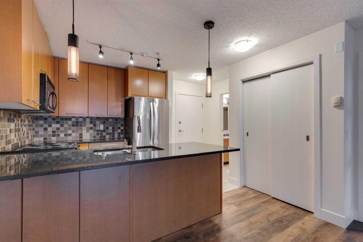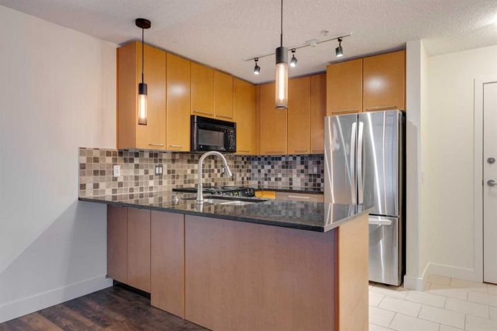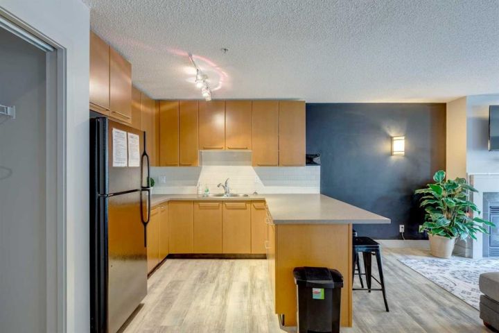 Solid, comfortable, easy living. This value-priced, updated 1-bedroom ground-floor suite offers walk-out convenience to quiet green space—ideal for unwinding after work or stepping out with your dog without dealing with stairs or elevators. The efficient, well-designed kitchen features full-size appliances, generous cabinetry, and durable black granite countertops—built for everyday use without fuss. New luxury vinyl plank flooring (installed last year) adds a clean, modern look, while the gas fireplace provides a warm, low-maintenance focal point. French doors lead to a private primary retreat with views of your patio and surrounding green space. The layout is practical and smart, offering a 4-piece bathroom with cheater ensuite access, in-suite laundry, titled underground parking, and a separate storage locker—everything in its place. This unit also offers cool comfort in the summer with newly installed A/C. Located in The Morgan, the building delivers on amenities that matter: a fitness room, two guest suites for visitors, secure underground guest parking, and a large party room when you need more space. Outside, enjoy well-kept grounds with a gazebo, plus the convenience of grabbing a coffee or tea at Tim Hortons just a 2 minute walk. An excellent option for first-time buyers, downsizers, or students looking for comfort, function, and strong value in a well-run building.