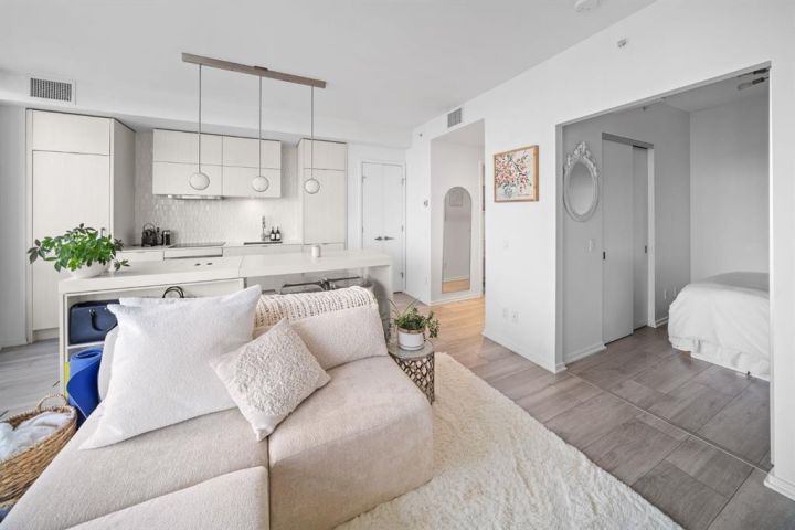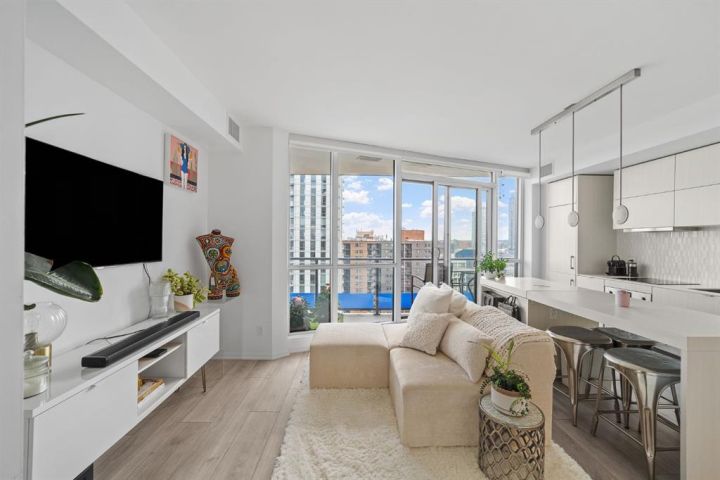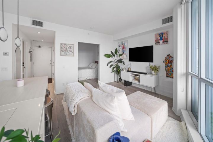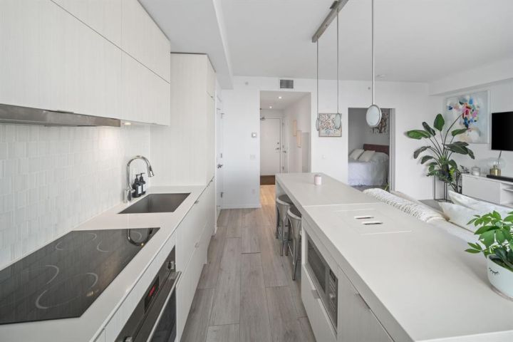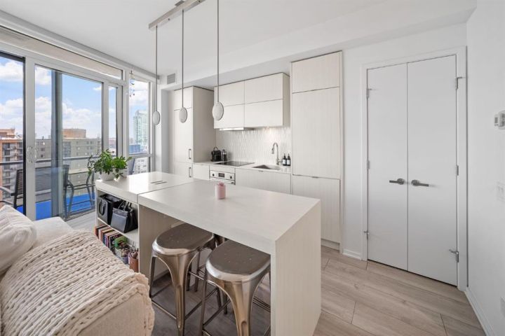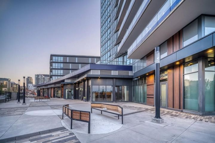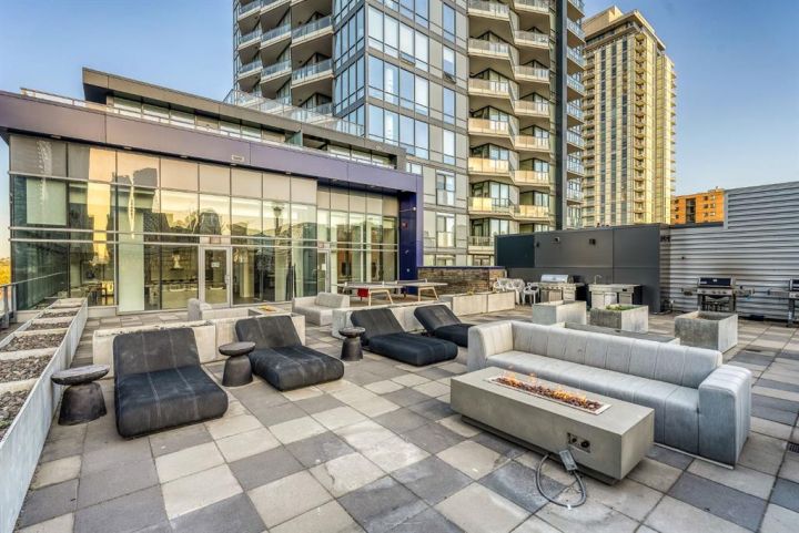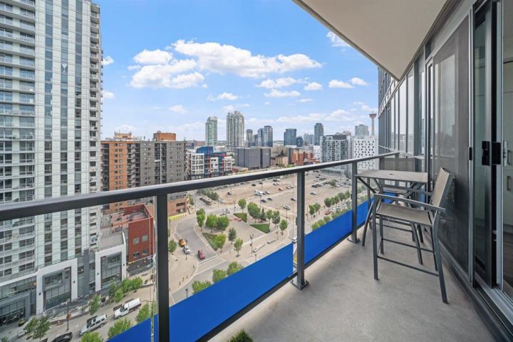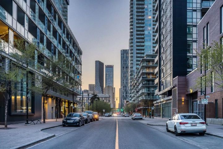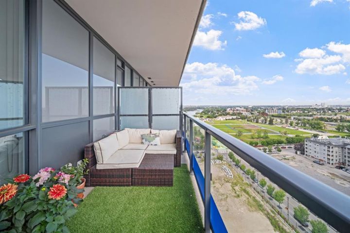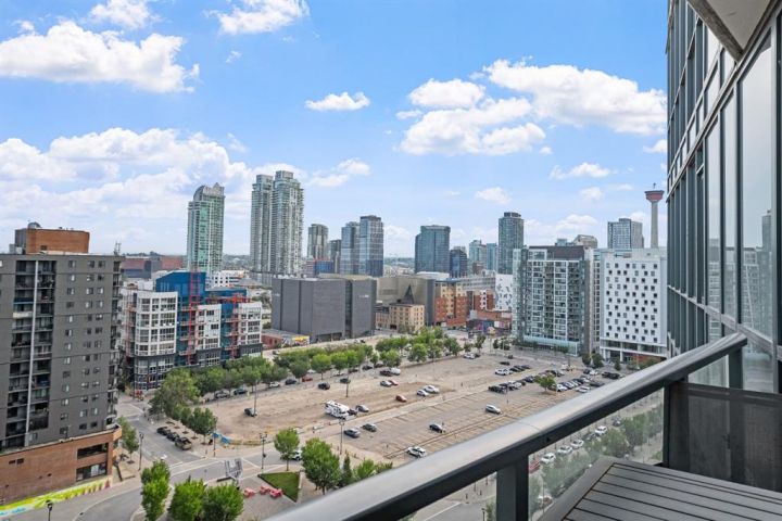 Modern 1 bedroom Condo in East Village. Great location! Well situated in the East village one bedroom condo offers easy access to many amenities including the Bow River, bike paths, parks. Most are within a 5 to 15 min walk. An underground parking stall is leased until February 2026. Heated underground parking is available for visitors and an enclosed loading dock for Moving. Other condo features include assigned storage locker, central heating and cooling, secure access to lobby, parkade and elevators. Large lobby with concierge service from 8am to 8pm and security service at night from 8pm to 8am. Lounge space featuring a large kitchen and fireplace, exercise room, courtyard with fire pit, and BBQ area with great city views. A fully furnished guest suite for visitors may be booked with concierge for a fee. This building also features an amazing rooftop view from the 25th floor. Secured bicycle and storage lockers with bike service bay. Book your viewing today!