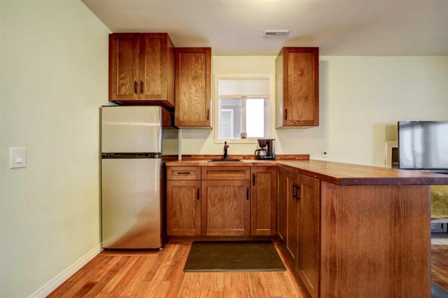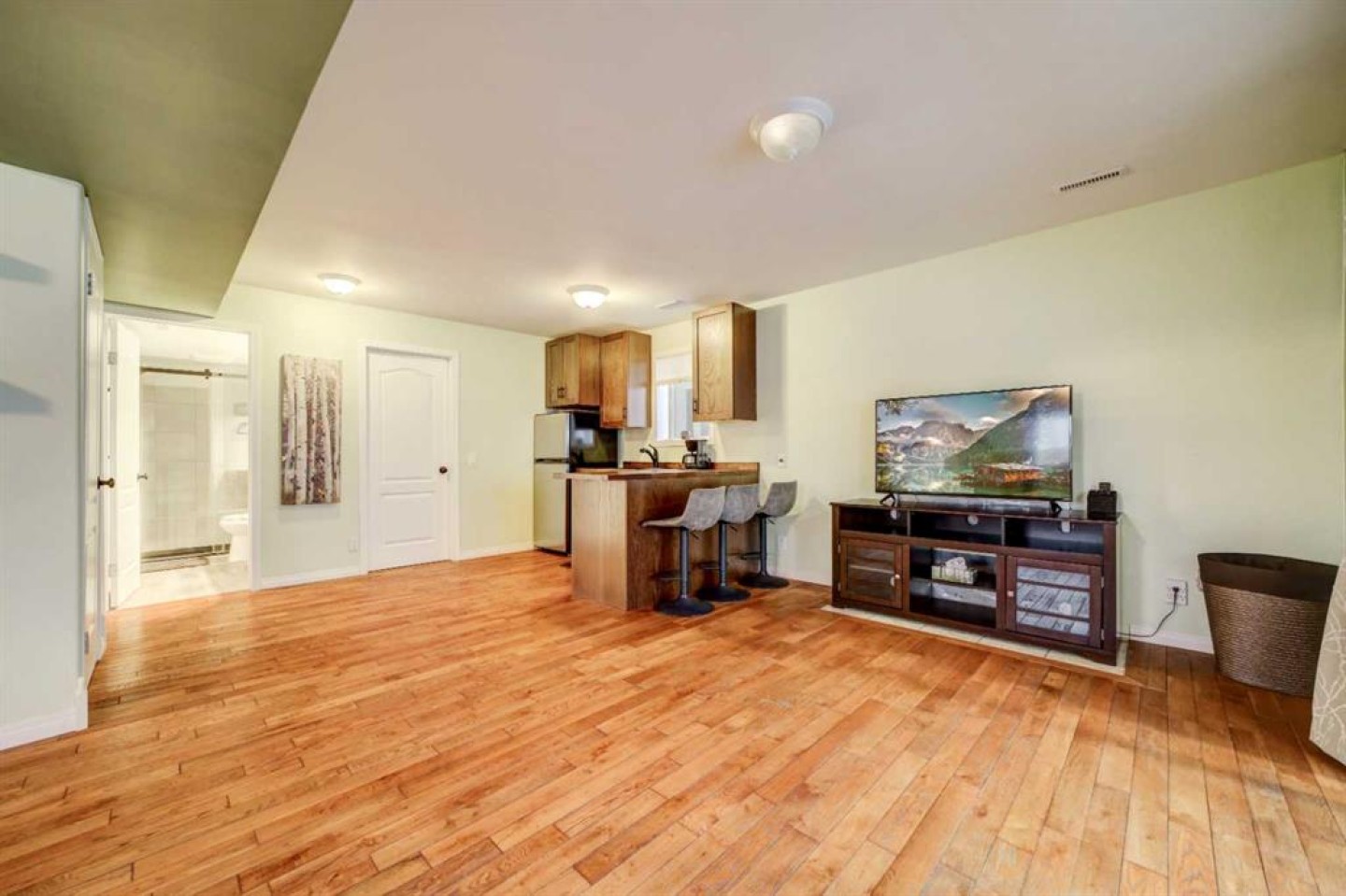 Main Level: custom made TV mount, 3 bar stools. Lower Level: refrigerator, electric fireplace, black leather loveseat, TV stand, storage ottoman, king bed, nightstand, dresser. Other: picnic table, garage shelving