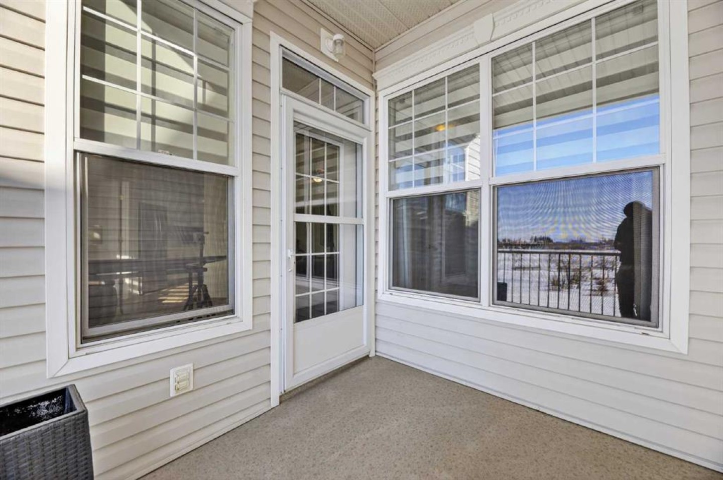 White storage cabinets in both bathrooms, and pull-down outdoor roller sun shade on patio.