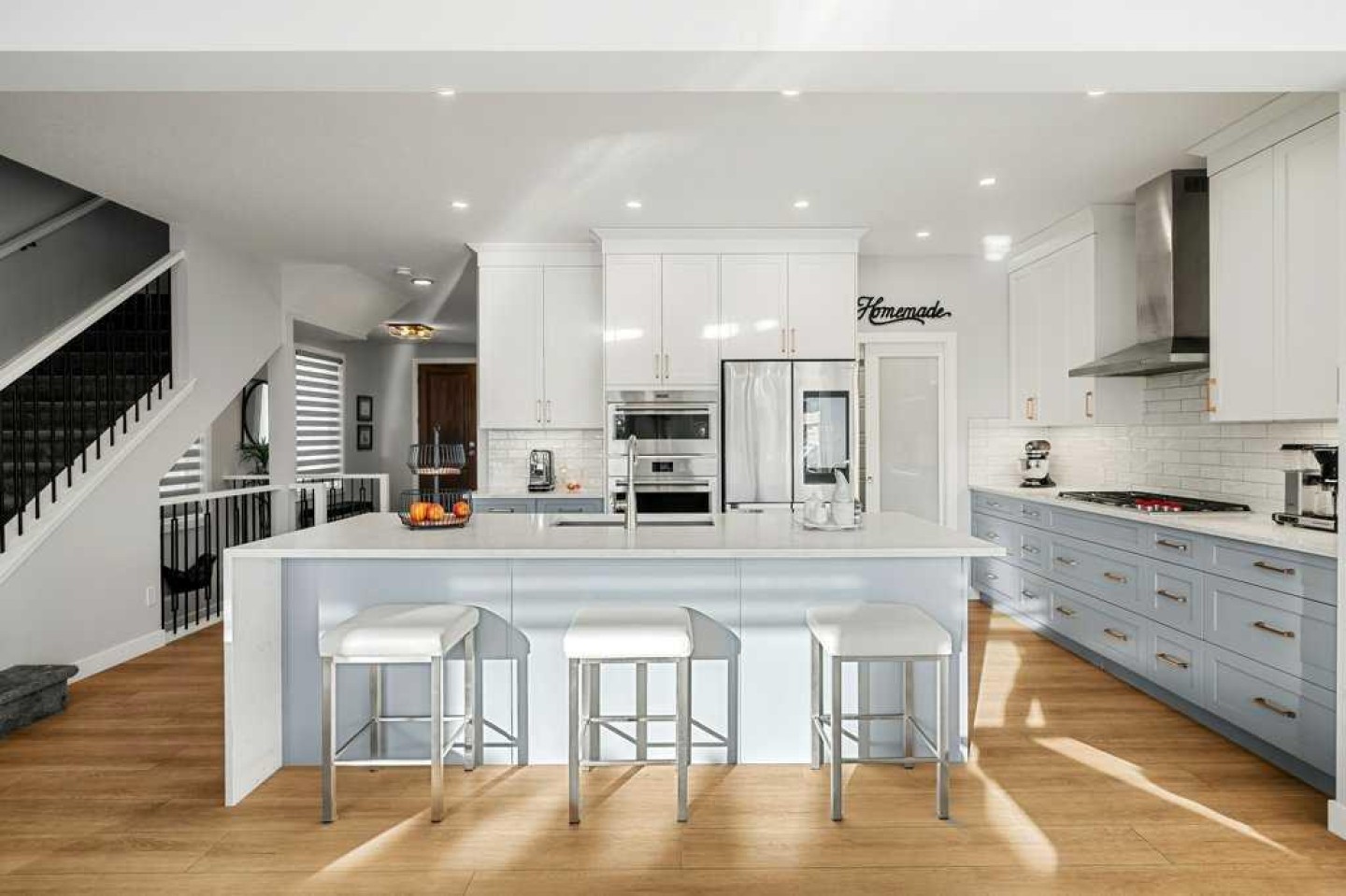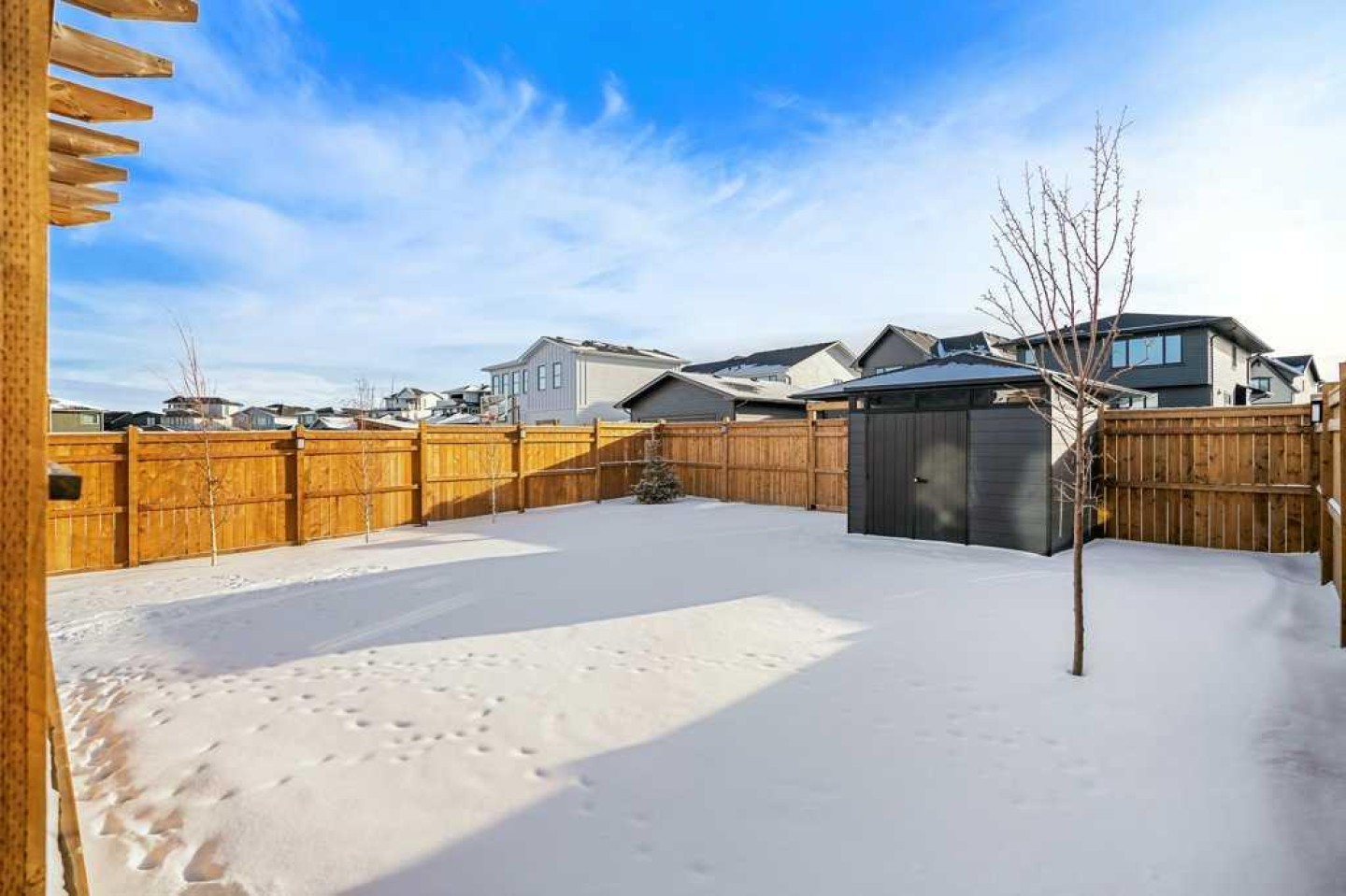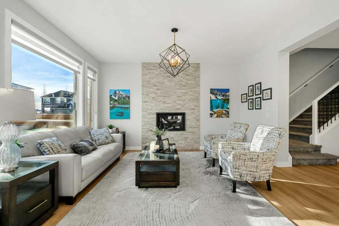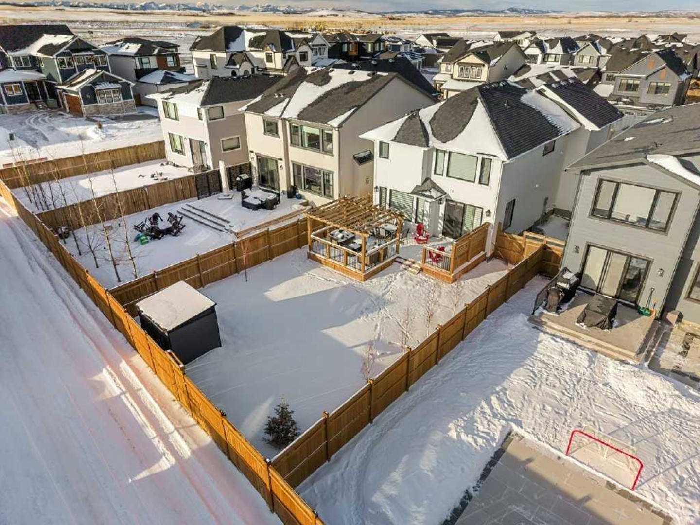 Exceptional Sterling Homes built Allure 3 plan featuring a south-facing backyard and extensive upgrades throughout. The exterior showcases durable Hardie board and stone, with an attached double garage and paved back lane. The oversized, fully fenced yard (approximately 139–135 feet deep) includes a large deck, privacy-side pergola, storage shed, BBQ gas line, and expansive sliding doors that seamlessly connect indoor and outdoor living. The main floor is thoughtfully designed with 9’ knockdown ceilings, LVP flooring, silhouette blinds, and a stunning floor-to-ceiling stone fireplace anchoring the living area. The chef’s kitchen is a showstopper with white perimeter cabinetry and a light grey waterfall island, quartz countertops, soft-close cabinetry with crown molding, dovetail drawers, gold accents, pot lighting, and a Silgranite sink. Premium appliances include a Wolf 5-burner gas cooktop, chimney hood fan, built-in Wolf speed oven and wall oven, Miele dishwasher, Samsung smart refrigerator, and bar fridge. A walk-through pantry with pocket doors connects to the mudroom and garage entry. The mudroom offers dual closets and access to a stylish 2-piece bath, while the large front foyer includes a guest closet and broom storage. Upstairs features upgraded carpet with 10 lb underlay, an open rail staircase, and a central bonus room with vaulted ceiling and pot lights. The primary bedroom is positioned at the back of the home and includes a feature wall and barn door leading to a luxurious 5-piece ensuite with fully tiled shower (10 mm glass), soaker tub, tower cabinetry, and a walk-in closet with added shelving. Two front bedrooms share a beautifully finished 4-piece bath with quartz counters and tiled tub surround. Upper-floor laundry offers tile flooring, a window, and quartz folding counter. Three picture windows over the stairwell add abundant natural light. The professionally developed basement by the builder offers 9’ ceilings, a spacious recreation room, rough-in speakers, a bedroom currently used as a studio, storage under the stairs, and a rough-in for a future bathroom. The utility room includes a wash basin, HRV, sump pump, Kinetico water softener, high-efficiency dual-zone furnace, and ample storage. A meticulously upgraded home in the 4-season award winning community of Harmony with premium finishes, functional design, and exceptional indoor-outdoor living—this property is truly move-in ready and built to impress.