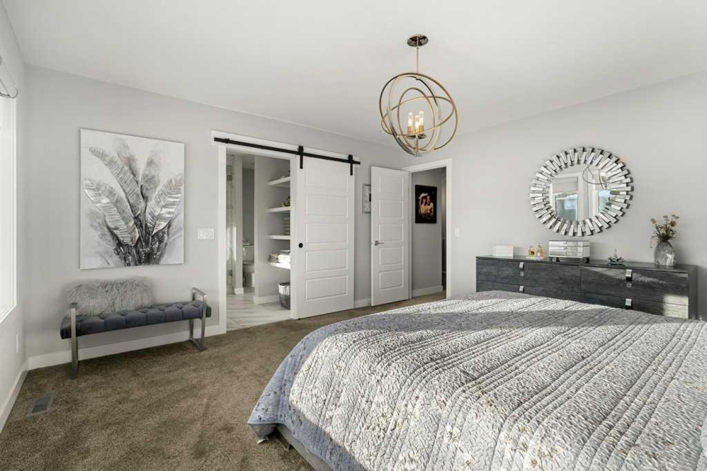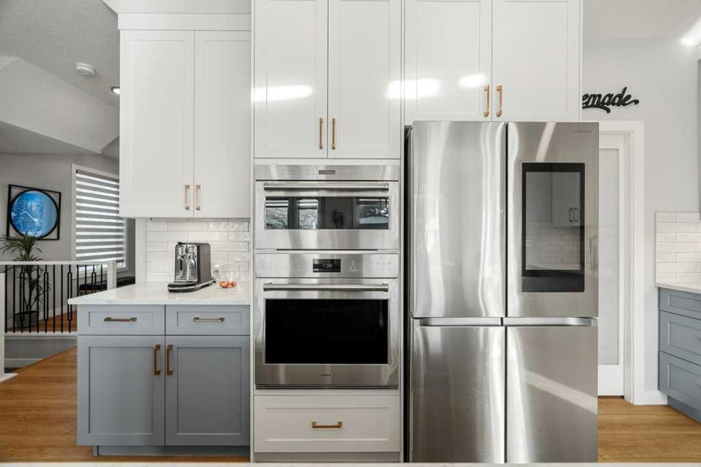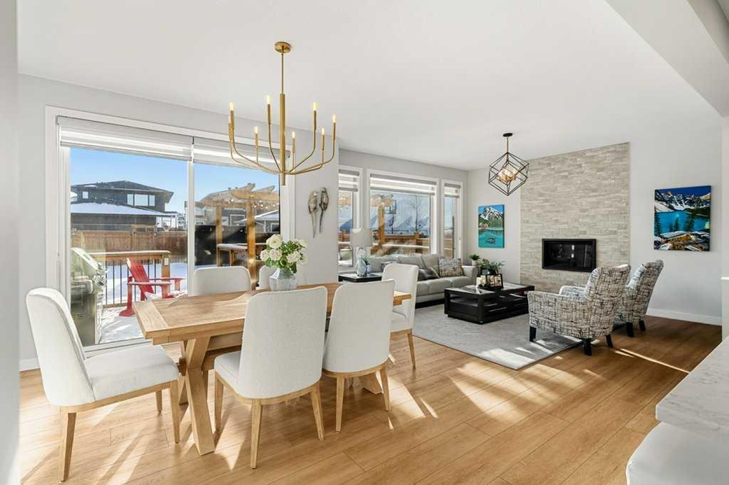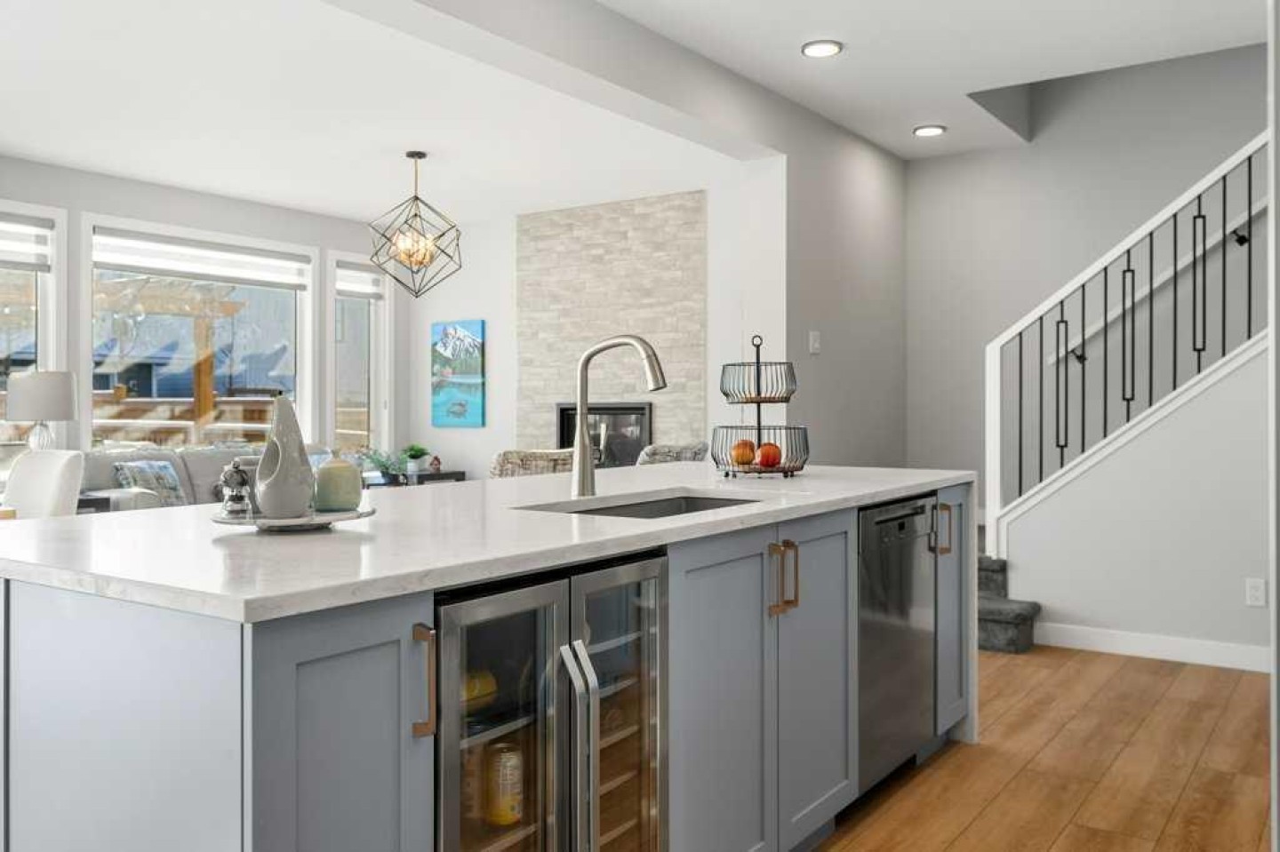 Exceptional Sterling Homes built Allure 3 plan featuring a south-facing backyard and extensive upgrades throughout. The exterior showcases durable Hardie board and stone, with an attached double garage and paved back lane. The oversized, fully fenced yard (approximately 139–135 feet deep) includes a large deck, privacy-side pergola, storage shed, BBQ gas line, and expansive sliding doors that seamlessly connect indoor and outdoor living. The main floor is thoughtfully designed with 9’ knockdown ceilings, LVP flooring, silhouette blinds, and a stunning floor-to-ceiling stone fireplace anchoring the living area. The chef’s kitchen is a showstopper with white perimeter cabinetry and a light grey waterfall island, quartz countertops, soft-close cabinetry with crown molding, dovetail drawers, gold accents, pot lighting, and a Silgranite sink. Premium appliances include a Wolf 5-burner gas cooktop, chimney hood fan, built-in Wolf speed oven and wall oven, Miele dishwasher, Samsung smart refrigerator, and bar fridge. A walk-through pantry with pocket doors connects to the mudroom and garage entry. The mudroom offers dual closets and access to a stylish 2-piece bath, while the large front foyer includes a guest closet and broom storage. Upstairs features upgraded carpet with 10 lb underlay, an open rail staircase, and a central bonus room with vaulted ceiling and pot lights. The primary bedroom is positioned at the back of the home and includes a feature wall and barn door leading to a luxurious 5-piece ensuite with fully tiled shower (10 mm glass), soaker tub, tower cabinetry, and a walk-in closet with added shelving. Two front bedrooms share a beautifully finished 4-piece bath with quartz counters and tiled tub surround. Upper-floor laundry offers tile flooring, a window, and quartz folding counter. Three picture windows over the stairwell add abundant natural light. The professionally developed basement by the builder offers 9’ ceilings, a spacious recreation room, rough-in speakers, a bedroom currently used as a studio, storage under the stairs, and a rough-in for a future bathroom. The utility room includes a wash basin, HRV, sump pump, Kinetico water softener, high-efficiency dual-zone furnace, and ample storage. A meticulously upgraded home in the 4-season award winning community of Harmony with premium finishes, functional design, and exceptional indoor-outdoor living—this property is truly move-in ready and built to impress.