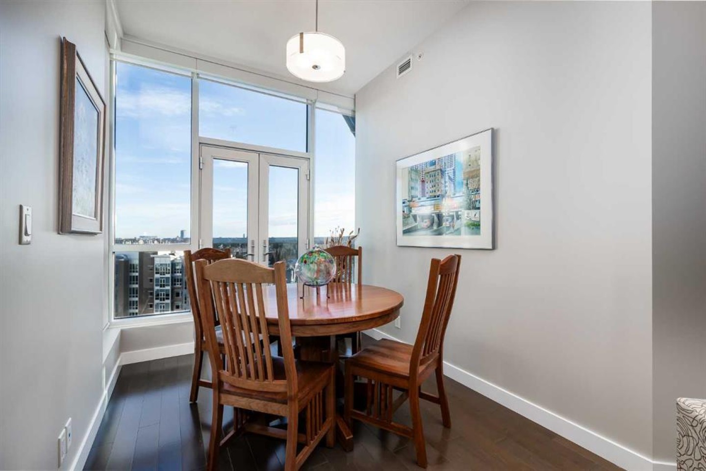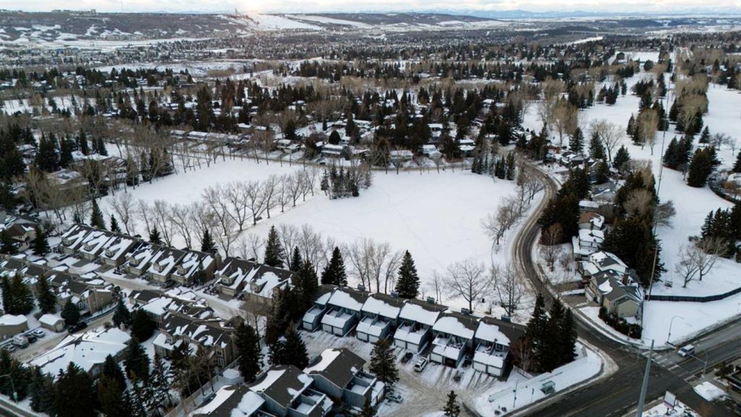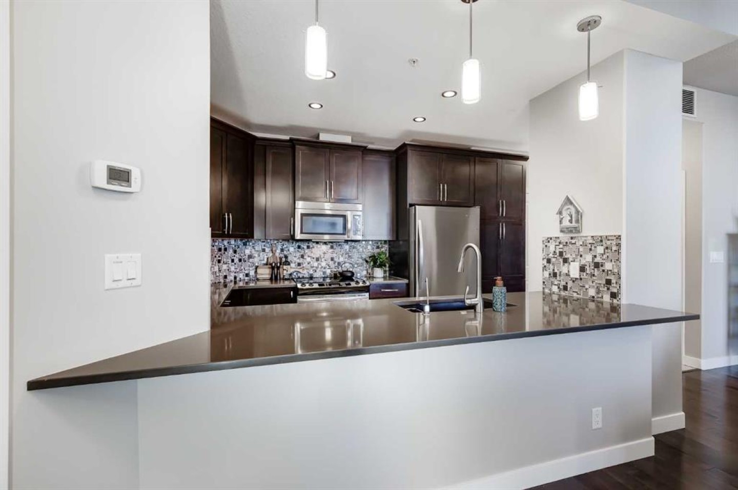 Perched on the 11th floor of the Monterey One building at Groves of Varsity, this thoughtfully designed condominium offers expansive views and a refined living experience in one of Calgary’s most established luxury complexes. Constructed with concrete and steel, the residence provides a quiet and secure setting. With over 1,000 square feet of developed space, the home features two bedrooms and two bathrooms, balancing comfort with functionality. The interior is defined by 10-foot ceilings and full-height windows that draw in natural light and frame open city and mountain outlooks. Hardwood flooring grounds the living and dining areas, creating a cohesive flow throughout the main living space. The living room is welcoming and well proportioned.. Adjacent to it, the modern kitchen combines style and practicality with tile flooring, rich wood cabinetry, quartz countertops, stainless steel appliances, plenty of cupboard space and a breakfast bar that adds casual seating. The dining area opens to a Juliet balcony and offers views toward downtown, making it a pleasant setting for both daily meals and evening gatherings. The primary bedroom is positioned to take full advantage of the scenery, with outlooks that stretch across the city and toward the mountains. It includes a walk-in closet and cork flooring, leading into a five-piece ensuite designed with a spa-like feel. A soaker tub, standalone shower, dual sinks, and quartz countertops complete the space. The second bedroom is equally versatile, currently functioning as a home office with a Murphy bed and integrated desk, allowing it to adapt easily to changing needs. A three-piece bathroom nearby features an oversized glass-enclosed shower and quartz countertop, offering convenience for guests or additional household members. A dedicated laundry room includes a full-size stacked washer and dryer along with extra storage, while air conditioning ensures comfort during warmer months. The home comes with one titled underground heated parking stall and a titled storage locker. Residents of the building have access to a range of shared amenities, including a fitness area, steam rooms, owners’ lounge, and an outdoor rooftop terrace with BBQs. A professional building nearby adds convenience with services such as medical offices, a pharmacy, and cafés. Short-term rentals are not permitted, and pets are welcome with board approval. The location places you steps from the Dalhousie LRT Station and directly across from the shops, dining, and services of Dalhousie Station. Market Mall, Northland Mall, and Crowfoot Crossing are all minutes away, as are major routes including Crowchild Trail, Stoney Trail, and downtown Calgary. The University of Calgary, SAIT, Silver Springs Golf & Country Club, Bowmont Park and its river pathways, Nose Hill Park, Foothills Hospital, and Alberta Children’s Hospital are all within easy reach, making this an ideal setting for both lifestyle and accessibility. Check out the 3D tour and floor plans!