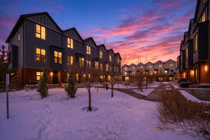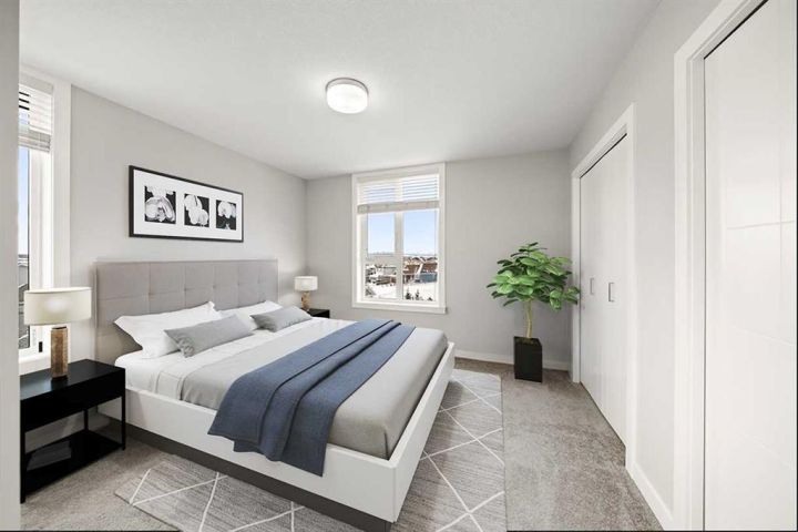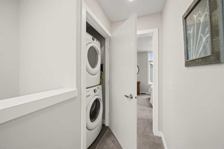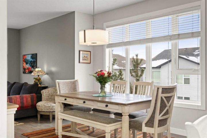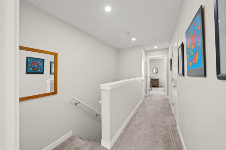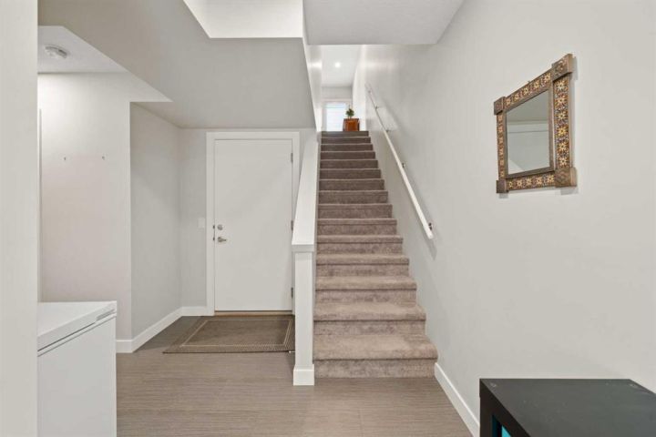 Welcome to this beautifully appointed, air-conditioned end-unit townhouse showcasing stunning west-facing mountain views. Lovingly maintained by its original owner, this home reflects true pride of ownership throughout. From the moment you arrive, you’ll appreciate the convenience of a private driveway, ease of parking for visitors, impeccably maintained common areas, and the welcoming front patio. The entry level features durable tile flooring, a versatile den ideal for a home office or flex space, a convenient half bath, and direct access to the oversized single attached garage with additional storage. The main living level offers an open-concept layout enhanced by luxury vinyl plank flooring. The contemporary kitchen is both stylish and functional, featuring quartz countertops, cabinets extended to the ceiling, generous counter space, a pantry, and stainless steel appliances. Step onto the west-facing balcony to enjoy breathtaking mountain views and unforgettable sunsets. This level is completed by a spacious dining area and a bright, inviting living room filled with natural light from the abundance of windows—perfect for entertaining or relaxing! Upstairs, two generously sized primary bedrooms each feature their own ensuite bathrooms and dual closets. The west-facing primary suite boasts spectacular mountain views and a four-piece ensuite, while the east-facing suite offers a three-piece ensuite with a large walk-in shower. Convenient upper-floor laundry completes this level. Ideally located close to a park, walking paths, a nearby school, and a variety of shopping and everyday amenities, this exceptional end unit seamlessly combines thoughtful design, modern finishes, and a highly desirable location—truly a place you’ll be proud to call home. View 3D/Multimedia/Virtual Tour.