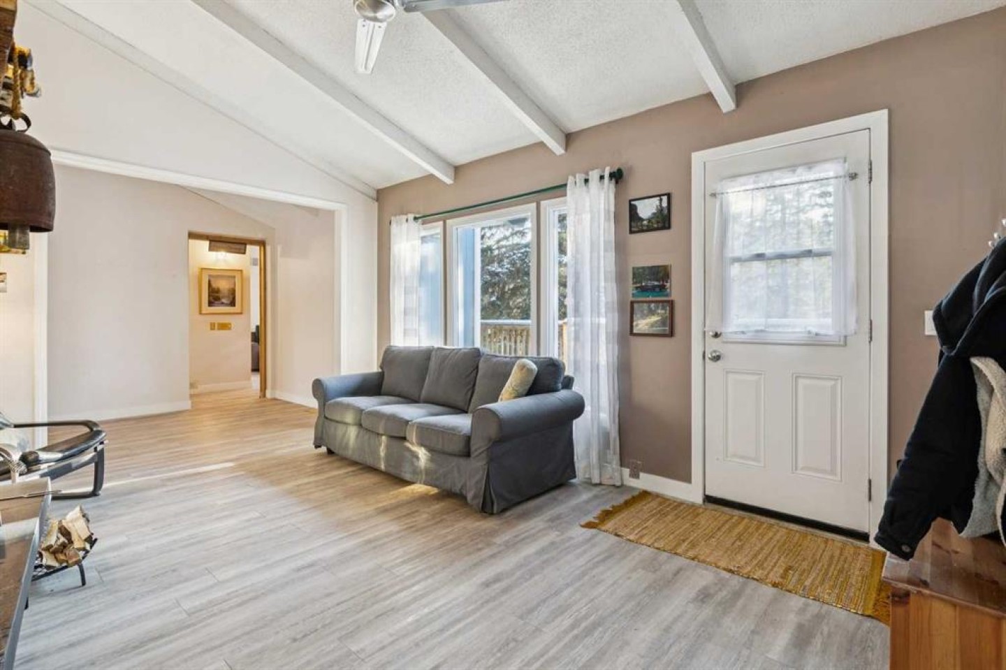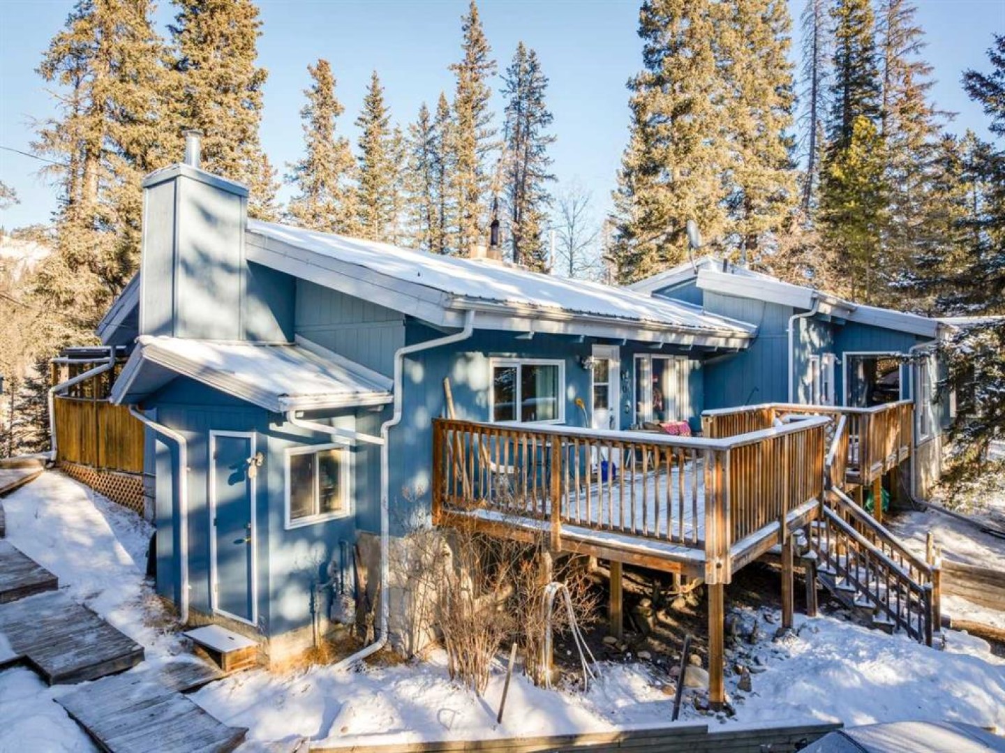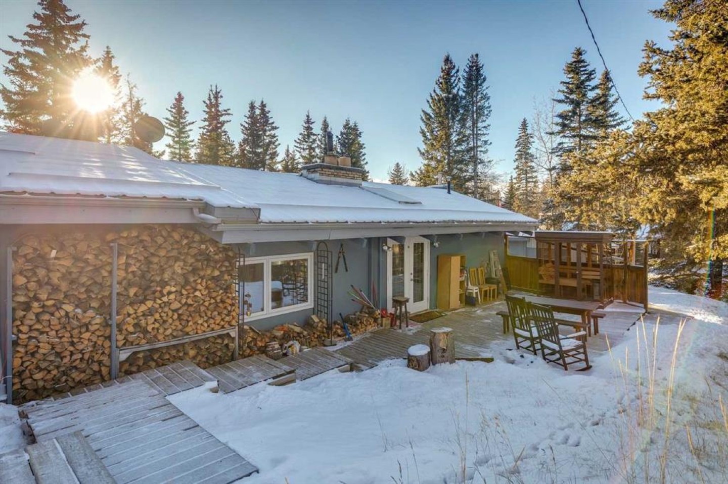 ACREAGE RETREAT NEAR THE ROCKIES: YOUR COUNTRY ESCAPE WITH MODERN COMFORT. Discover the perfect blend of country living and convenience with this rancher-style bungalow, ideally situated only 30 minutes from Cochrane with the Rocky Mountains right on your doorstep. This is an unparalleled opportunity to own a peaceful retreat at a very reasonable price. SERENITY AND NATURE : Experience true tranquility. This 1380 sq ft home offers peace and quiet, with the soothing sound of the river flowing in your backyard. Watch deer graze as you enjoy the natural beauty surrounding you. RUSTIC CHARM MEETS UNIQUE ARCHITECTURE: Step into a home where rustic charm inspires. The open-concept design is anchored by a magnificent floor-to-ceiling brick fireplace, creating a warm, cohesive aesthetic. On one side, the 13-foot vaulted living room ceiling provides a cozy space to enjoy the crackling warmth of a wood-burning fire. On the other, the masonry transitions into a stunning brick cooking alcove in the kitchen, connecting the home's various spaces seamlessly from your morning coffee to evening relaxation. This unique home is meticulously maintained and offers a well-thought-out layout, including a dining room, a very large den, and an all-season sunroom. It features two bedrooms and two full baths. The primary bedroom quarters are nicely separated for privacy and include a separate entrance, offering the potential for a home business or an income-generating rental space. Recent upgrades enhance the home's value, including new vinyl plank flooring throughout, new insulation in the crawl space, and a deicer installed on the North side of the roof. The 24.5’ X 14” rear deck is perfect for entertaining, featuring ample space for a large BBQ and gathering, along with a relaxing sauna. Included in the price are two massive sheds (16’x12’ and 8’x18’), currently used as a shop and for additional storage and a log splitter. For the outdoor enthusiast, this is a dream come true. With 40 km of groomed trails, camping, fishing, hiking, mountain biking, and cross-country skiing literally on your doorstep, adventure awaits. The property is within walking distance of two rivers and the confluence of the Waiparous Creek and Ghost River. A short drive will take you to the Ghost Lake recreation area and further on to Canmore. Don't miss this little gem—opportunities like this don't come around often!