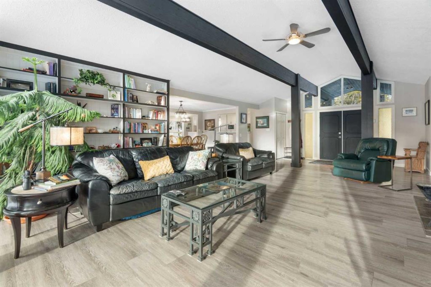 Beamed Ceilings, Bookcases, Built-in Features, Closet Organizers, French Door, High Ceilings, Kitchen Island, Open Floorplan, Recessed Lighting, Storage
