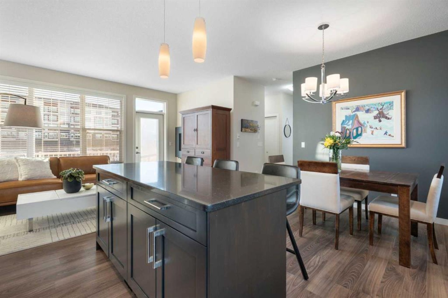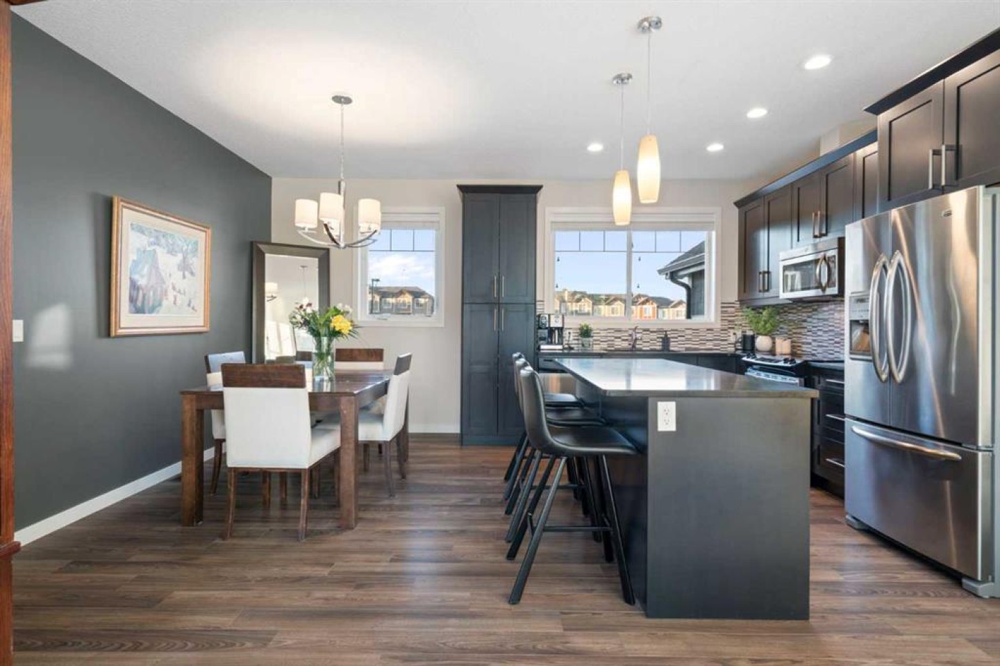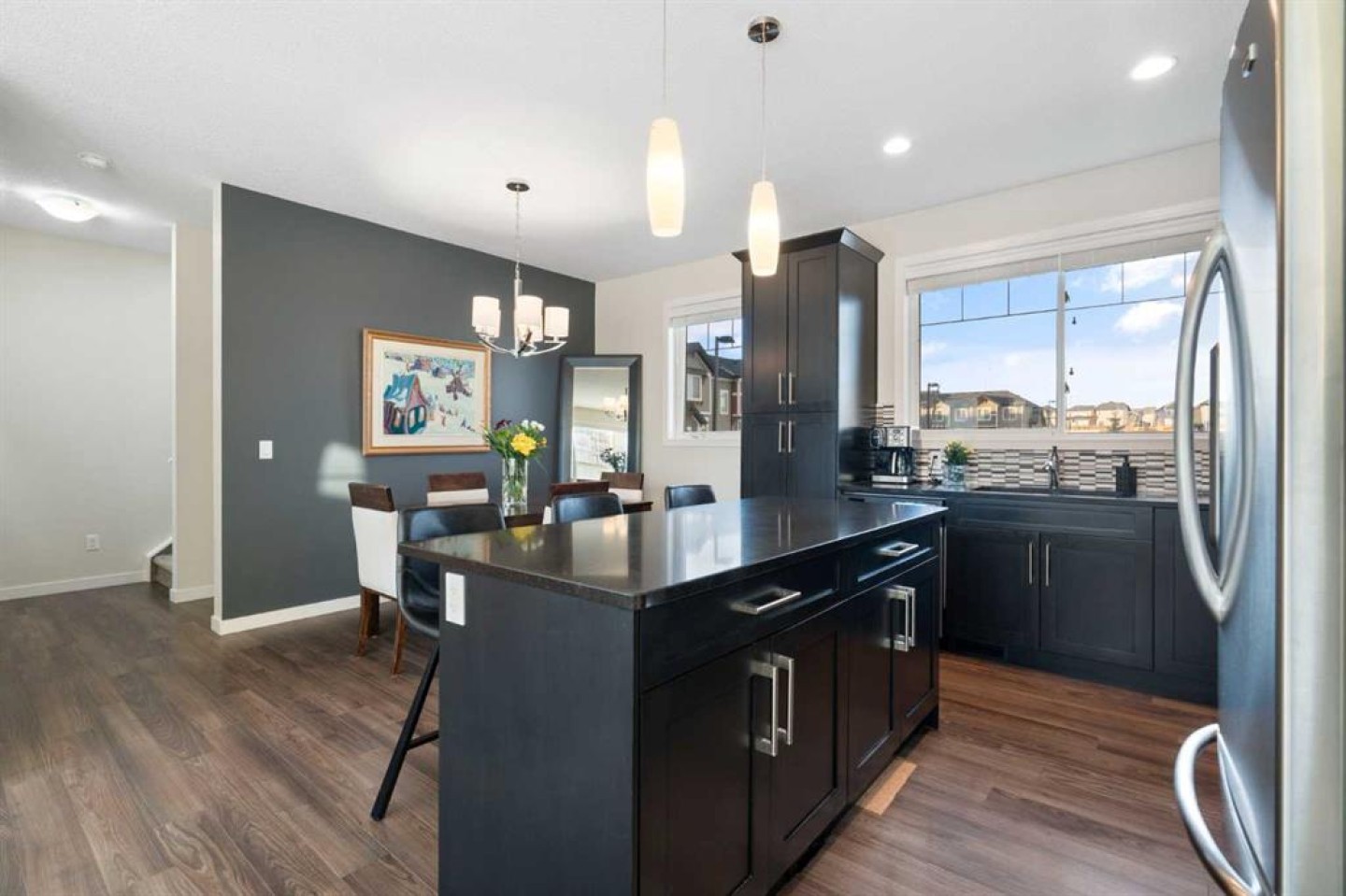 Welcome to this beautifully maintained, move-in-ready townhouse located in the sought-after community of Nolan Hill. Ideally positioned backing south onto a tranquil nature reserve with scenic ravine views, this home offers an exceptional blend of space, comfort, and convenience. With over 1700 sq ft of well-designed living space, the property features a double attached heated garage, air conditioning, three bedrooms, and two and a half baths, making it an ideal choice for today’s modern lifestyle. The inviting front entry opens to a spacious and flexible main-floor family room that easily adapts to your lifestyle. Whether used as a family room, home office, study, playroom, or fitness space, it enjoys sunny south-facing windows and walk-out access to a private patio and green space beyond. Upstairs, the second level impresses with 9-foot ceilings and an open-concept layout ideal for both entertaining and daily living. Wide-plank laminate flooring flows throughout, while the gourmet kitchen shines with stainless steel appliances, generous cabinetry, granite countertops, and a large centre island perfect for meals and gatherings. A roomy dining area connects seamlessly to the bright and airy living room, complete with large windows and a cozy wall-mounted gas fireplace. Step out through the patio door to the sun-soaked south-facing balcony with a gas BBQ line and beautiful ravine views. This level also includes a convenient 2-piece bath and additional storage. The upper level offers 3 well-sized bedrooms, including a comfortable primary retreat with a walk-in closet and private 3-piece ensuite. A 4-piece main bath and upstairs laundry complete this level, making everyday routines effortless. Additional highlights include noise-cancelling exterior walls and a prime location within the complex facing a green space and shared with only three adjoining units, creating a quiet and private setting. The pet-friendly complex allows pets with board approval. A newly announced K-4 school adds even more appeal to the community. Recent exterior updates include brand new shingles throughout, along with partial replacement of siding, eaves, downspouts, and fascia where hail damage was present. Enjoy a superb location within walking distance to the Gates of Nolan Hill shopping plaza, minutes to Sage Hill Crossing and Beacon Hill Shopping Centre, close to area schools, and offering quick access to Shaganappi, Sarcee, and Stoney Trail. Miles of pathways and park space are right outside your door. This is maintenance-free living at its best. Book your private showing today!