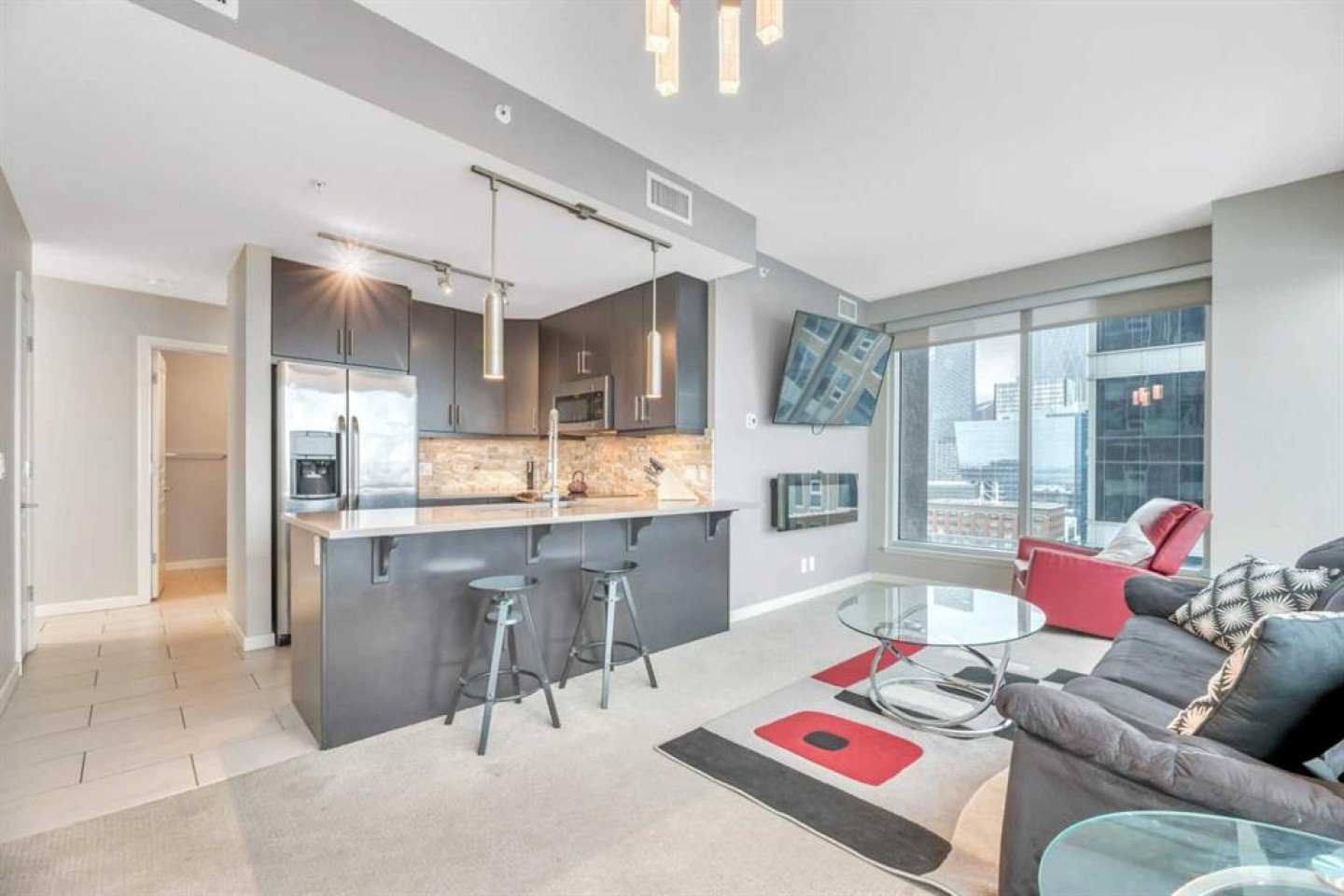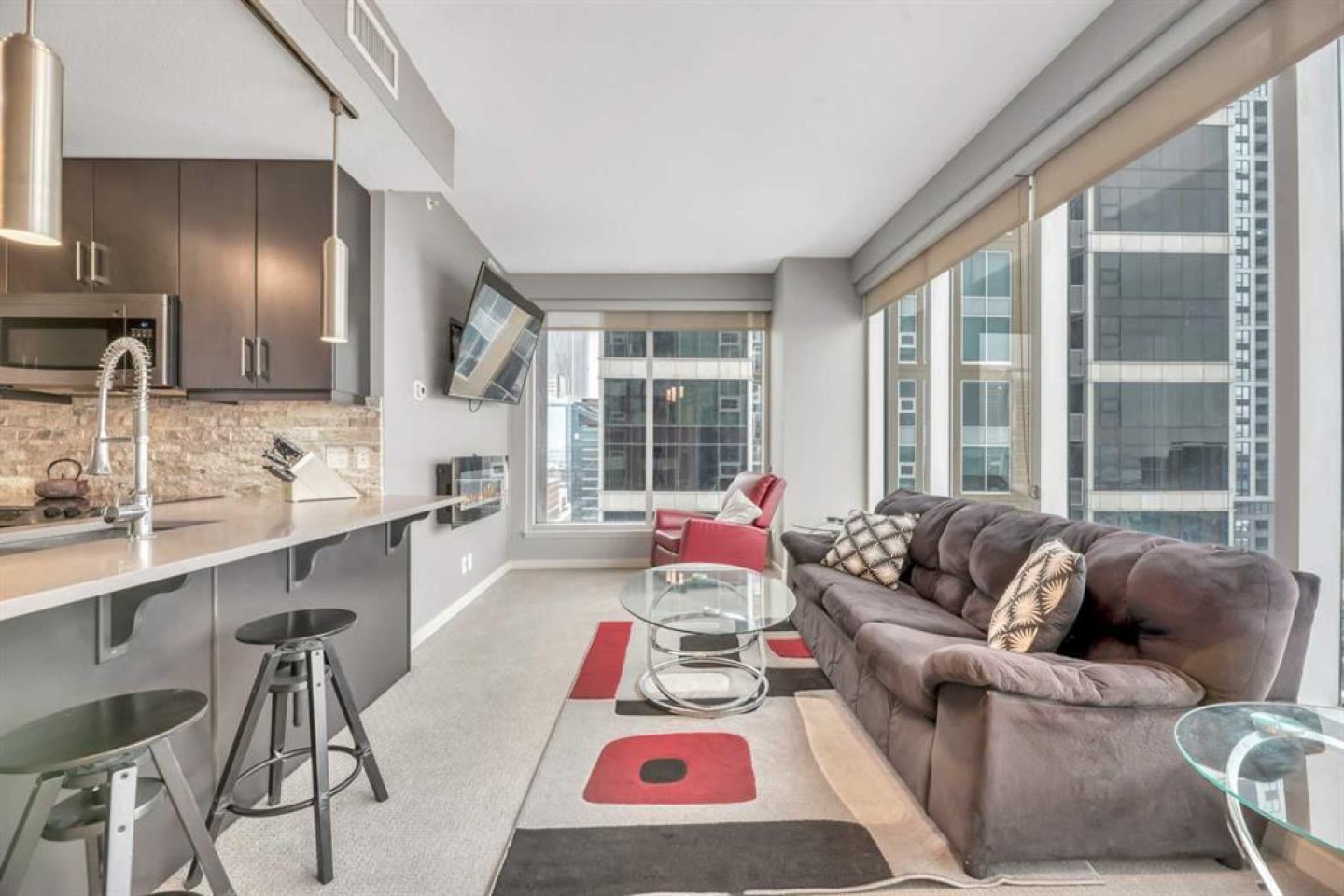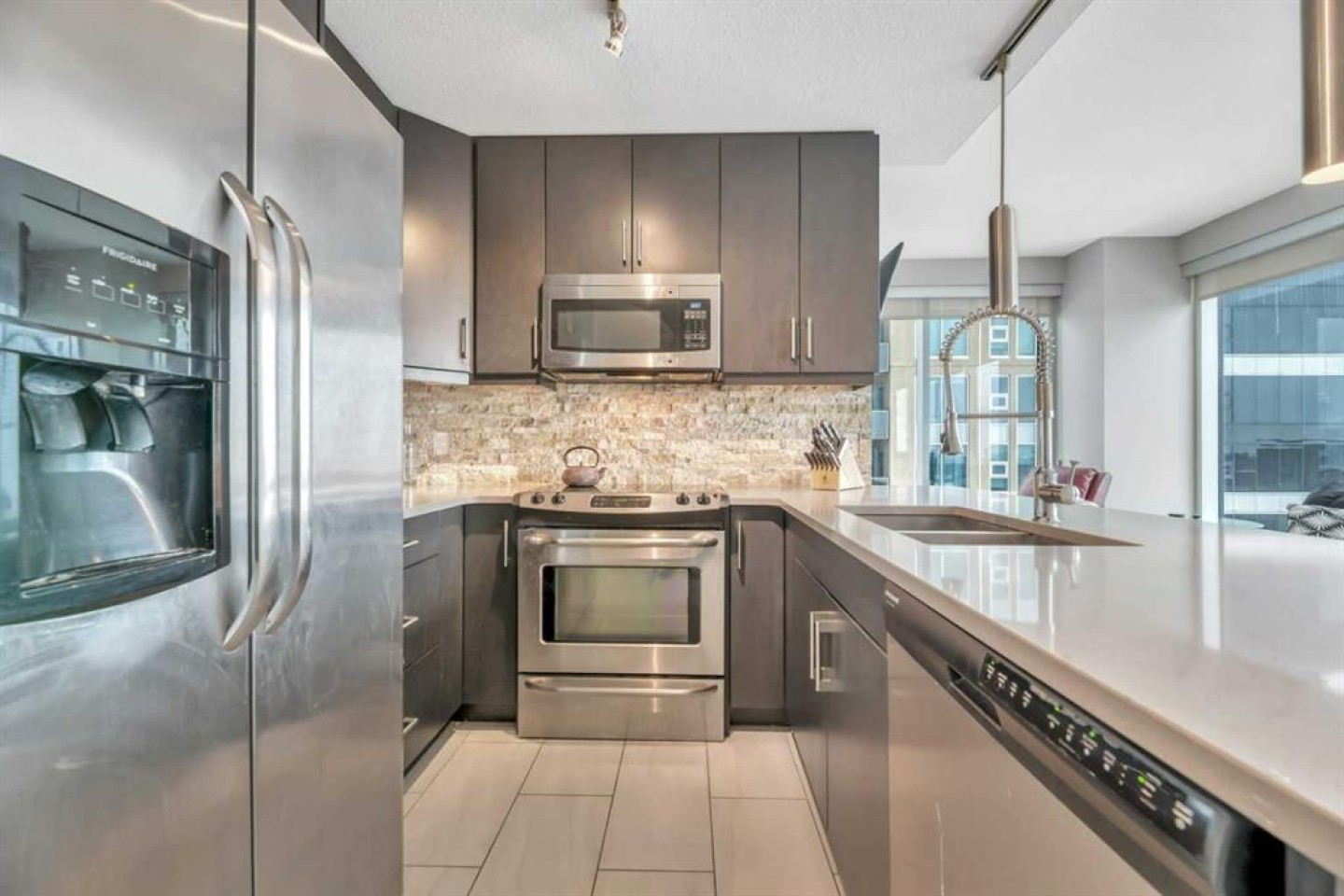 WALK SCORE. 96% Walkers Paradise. 82% Excellent Transit. 93% Bikers Paradise. Separate Secure Bike Room for Storage and Maintenance. MOVE IN NOW! Bring Your Best Friend. PET Friendly. UPGRADED 2- bedroom/2-bathroom Unit. NE corner unit in Alura Building. Main Entrance with Canada Post Mail and Parcel Pick Up on Site. Underground Parking. Floor to ceiling windows allow for lots of natural light and breathtaking downtown views. Private PATIO. Gourmet Kitchen features Upgraded ceiling height cabinetry, stone backsplash, stainless steel appliances & quartz counter tops. 2 Spacious bedrooms with a Primary Bedroom walk-in closet. Closets are upgraded with closet organizers. Full size upgraded washer & dryer, air-conditioning, fitness facility, concierge/security & owners lounge. Conveniently located steps from the NEW Stampede LRT train station, the Saddle Dome, Trans Alta Building. Downtown, restaurants & shops. Shows 10+. Furniture can stay!