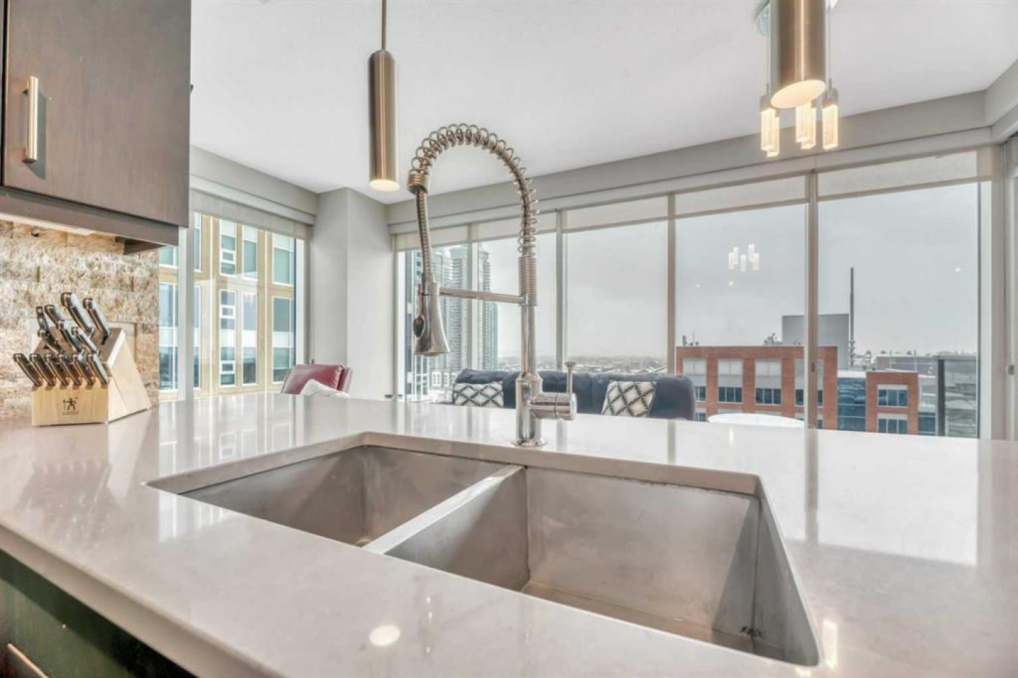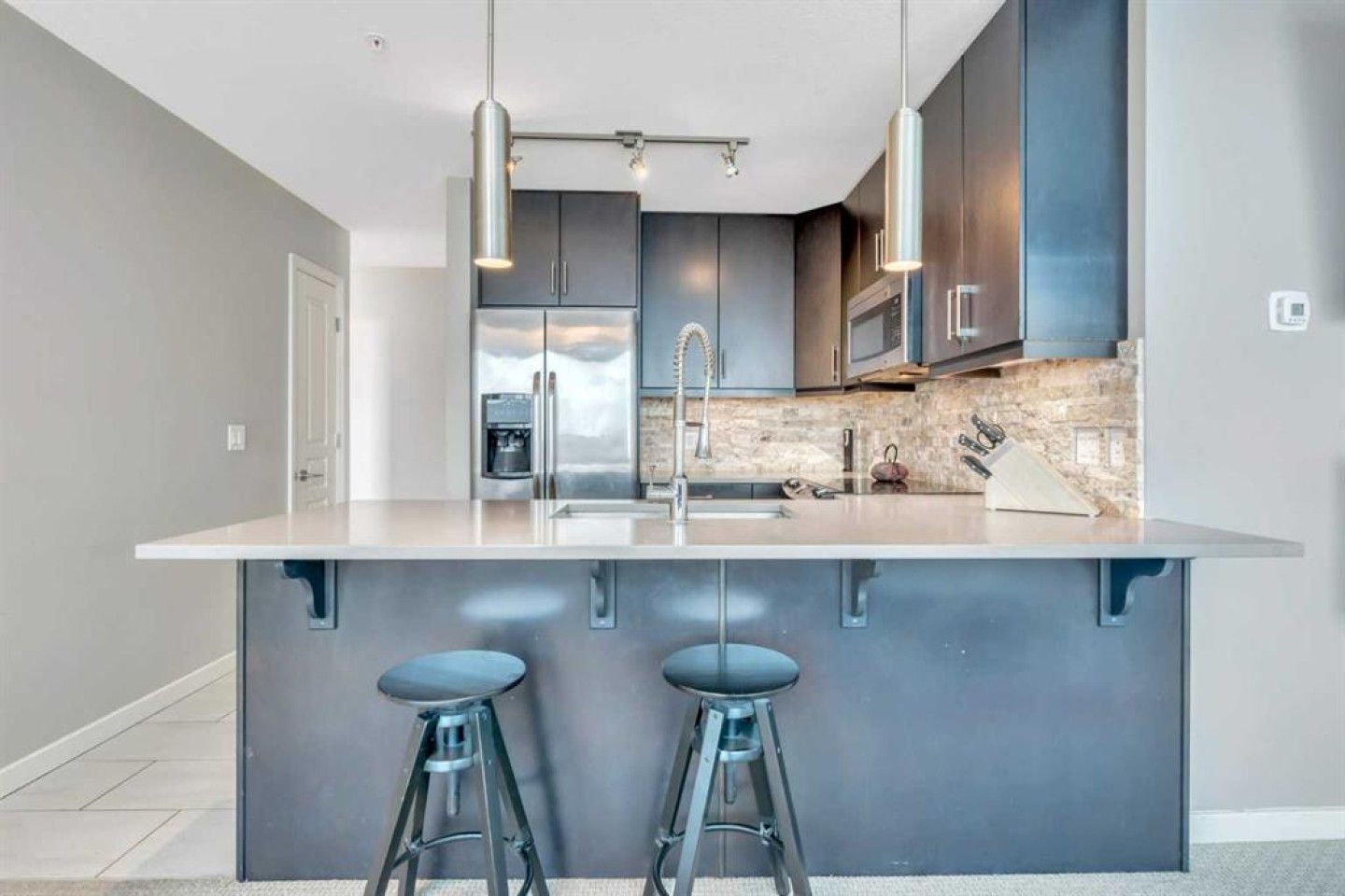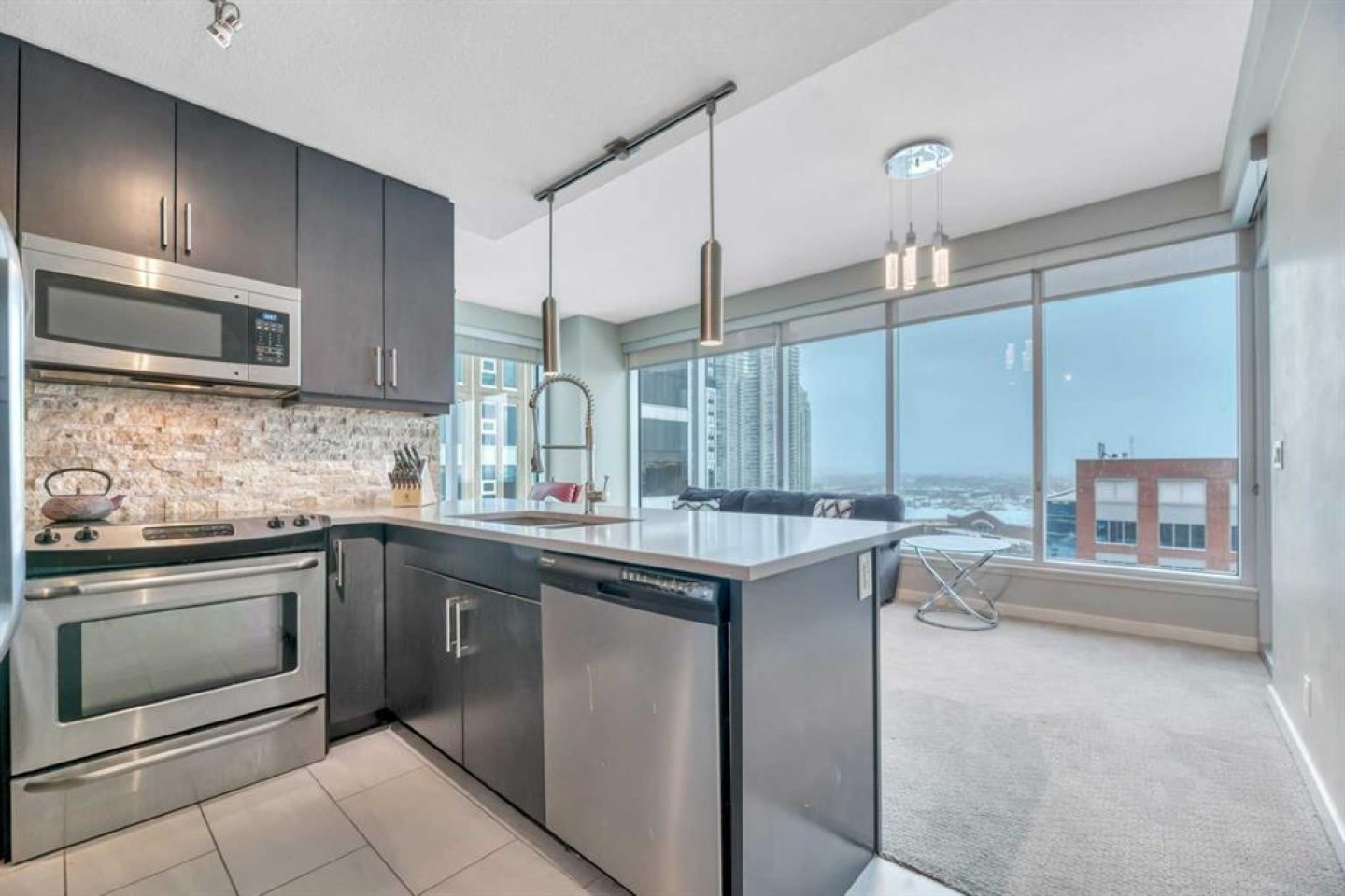 WALK SCORE. 96% Walkers Paradise. 82% Excellent Transit. 93% Bikers Paradise. Separate Secure Bike Room for Storage and Maintenance. MOVE IN NOW! Bring Your Best Friend. PET Friendly. UPGRADED 2- bedroom/2-bathroom Unit. NE corner unit in Alura Building. Main Entrance with Canada Post Mail and Parcel Pick Up on Site. Underground Parking. Floor to ceiling windows allow for lots of natural light and breathtaking downtown views. Private PATIO. Gourmet Kitchen features Upgraded ceiling height cabinetry, stone backsplash, stainless steel appliances & quartz counter tops. 2 Spacious bedrooms with a Primary Bedroom walk-in closet. Closets are upgraded with closet organizers. Full size upgraded washer & dryer, air-conditioning, fitness facility, concierge/security & owners lounge. Conveniently located steps from the NEW Stampede LRT train station, the Saddle Dome, Trans Alta Building. Downtown, restaurants & shops. Shows 10+. Furniture can stay!