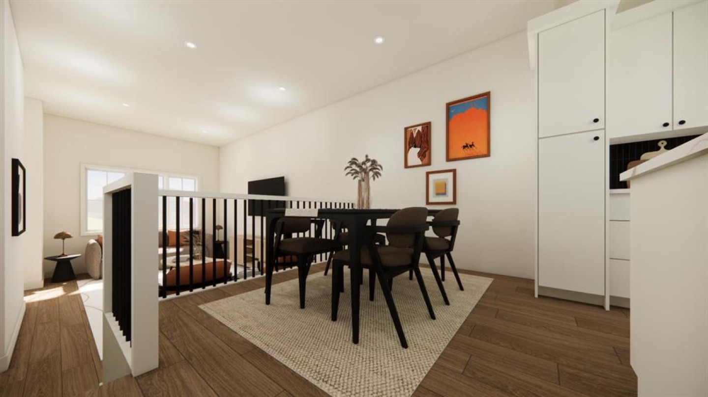 No condo fees, brand-new construction, and front landscaping already completed—this end-unit townhome by Stranville Living Master Builder delivers modern design with genuinely low-maintenance ownership. Located in the brand new community of Malloy Landing, directly across from the SHIFT Community Recreation Centre, this home combines thoughtful architecture with everyday convenience. Inside, the main living space immediately stands out with soaring 12-foot ceilings that create an airy, open feel rarely found in townhome living. Just a few steps up, the kitchen and dining area sit on a split-level design that naturally defines each space while keeping the layout open and connected. The kitchen is finished with quartz countertops throughout, a large island with bar seating, and clean, contemporary cabinetry that balances style with function. The primary bedroom is spacious and well-appointed, featuring a full ensuite with dual vanities and a walk-in shower, offering both comfort and practicality. Two additional bedrooms are thoughtfully positioned nearby, along with a modern four-piece bathroom—ideal for family living, guests, or a dedicated home office setup. Main floor laundry adds another layer of everyday convenience. Outside, this home is fully turnkey. Front landscaping and wing fencing are included, along with a rear deck that extends your living space outdoors. The double rear parking pad provides off-street parking with easy access, completing the package without added monthly costs. With quality construction, elevated ceiling heights, and a location that puts recreation and amenities right across the street, this brand-new townhome offers modern living without the burden of condo fees—an increasingly rare find in today’s market. Gst and a 10 year new home warranty is also included in the list price.