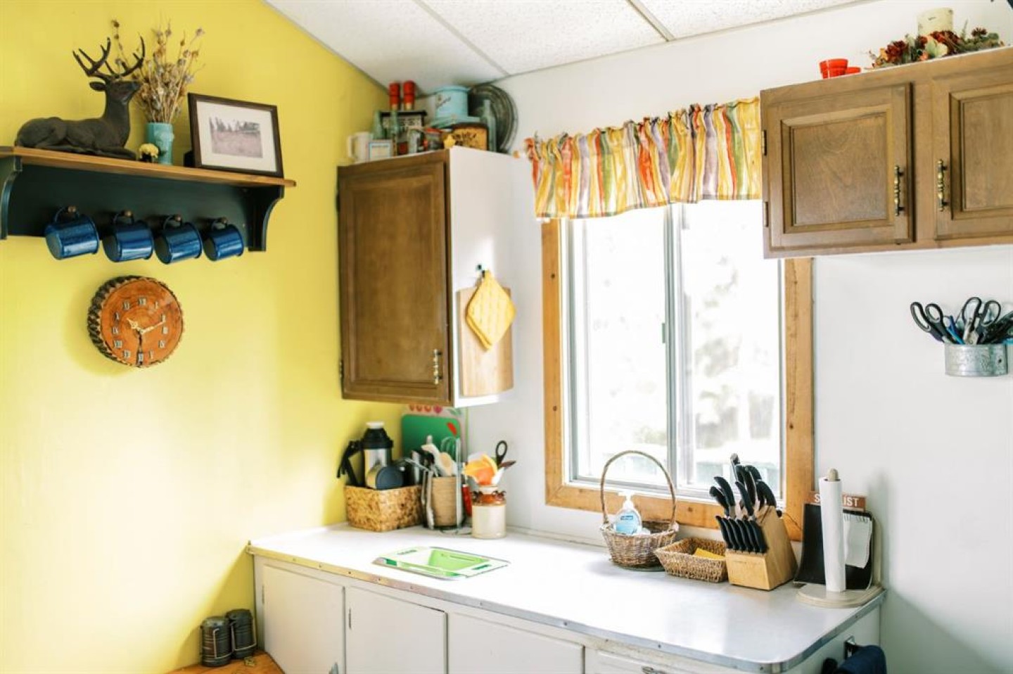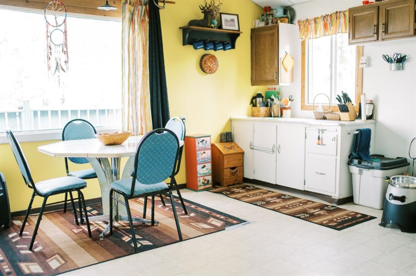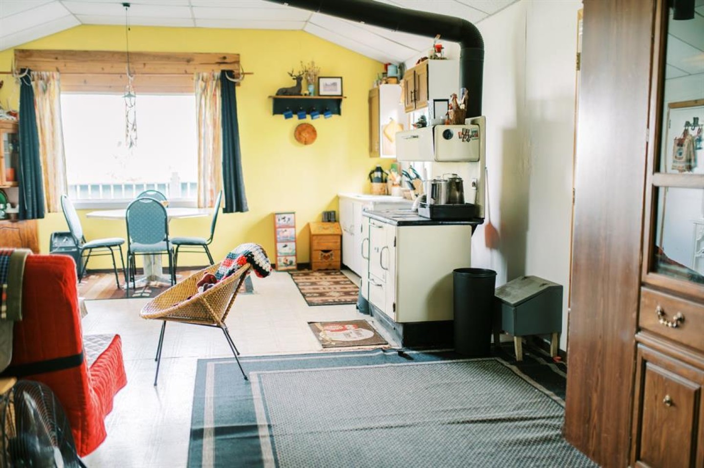 Curtains, curtain rods, white cabinet, corner cabinet, bed, couch, coffee table, 2 pine chests, (bedding in chest), rugs, table and chairs, fridge, wood stove, toaster, shed, outhouse, other item negotiable