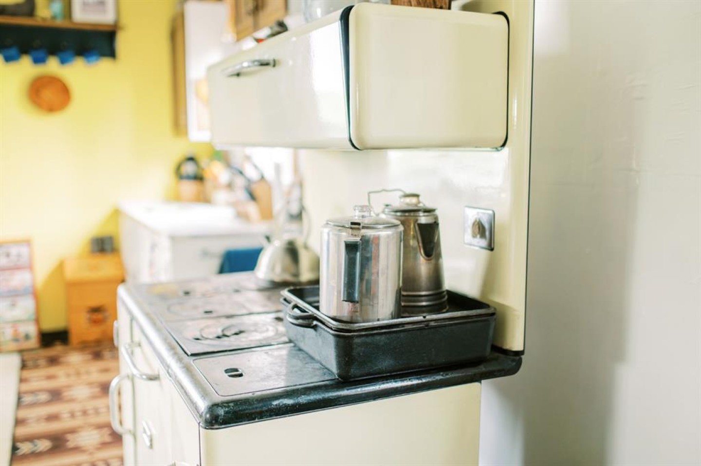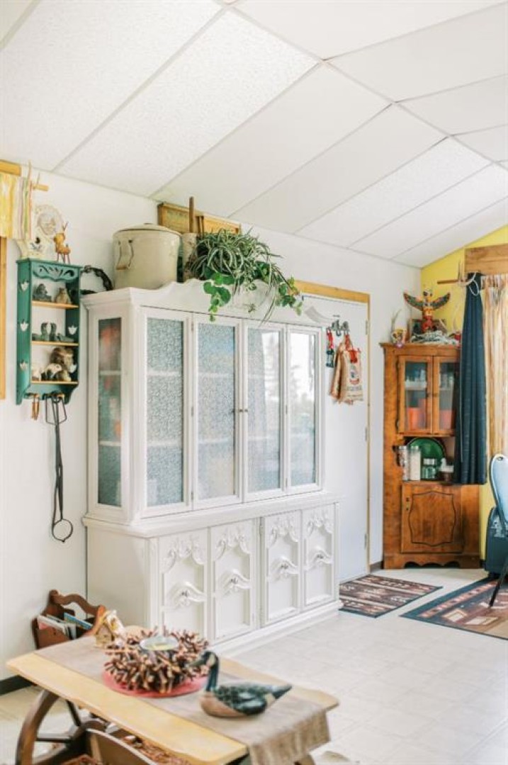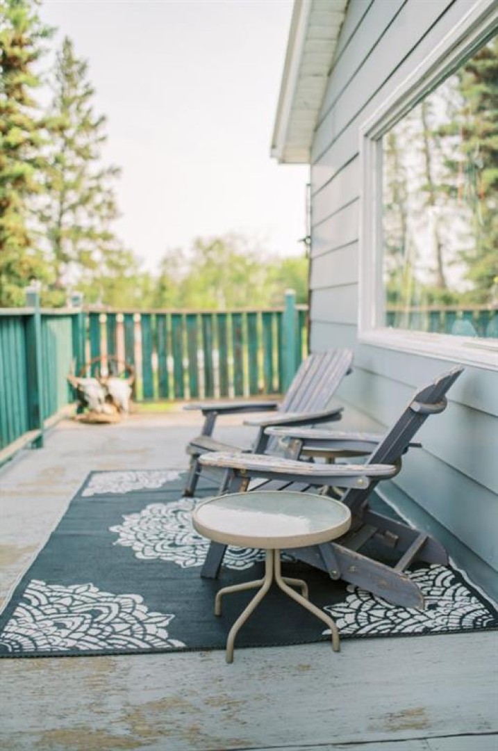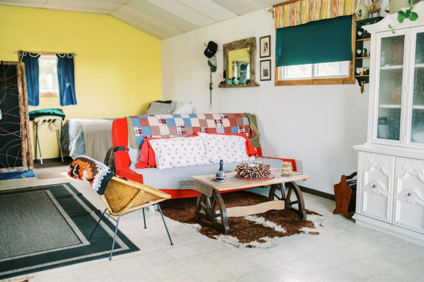 Curtains, curtain rods, white cabinet, corner cabinet, bed, couch, coffee table, 2 pine chests, (bedding in chest), rugs, table and chairs, fridge, wood stove, toaster, shed, outhouse, other item negotiable