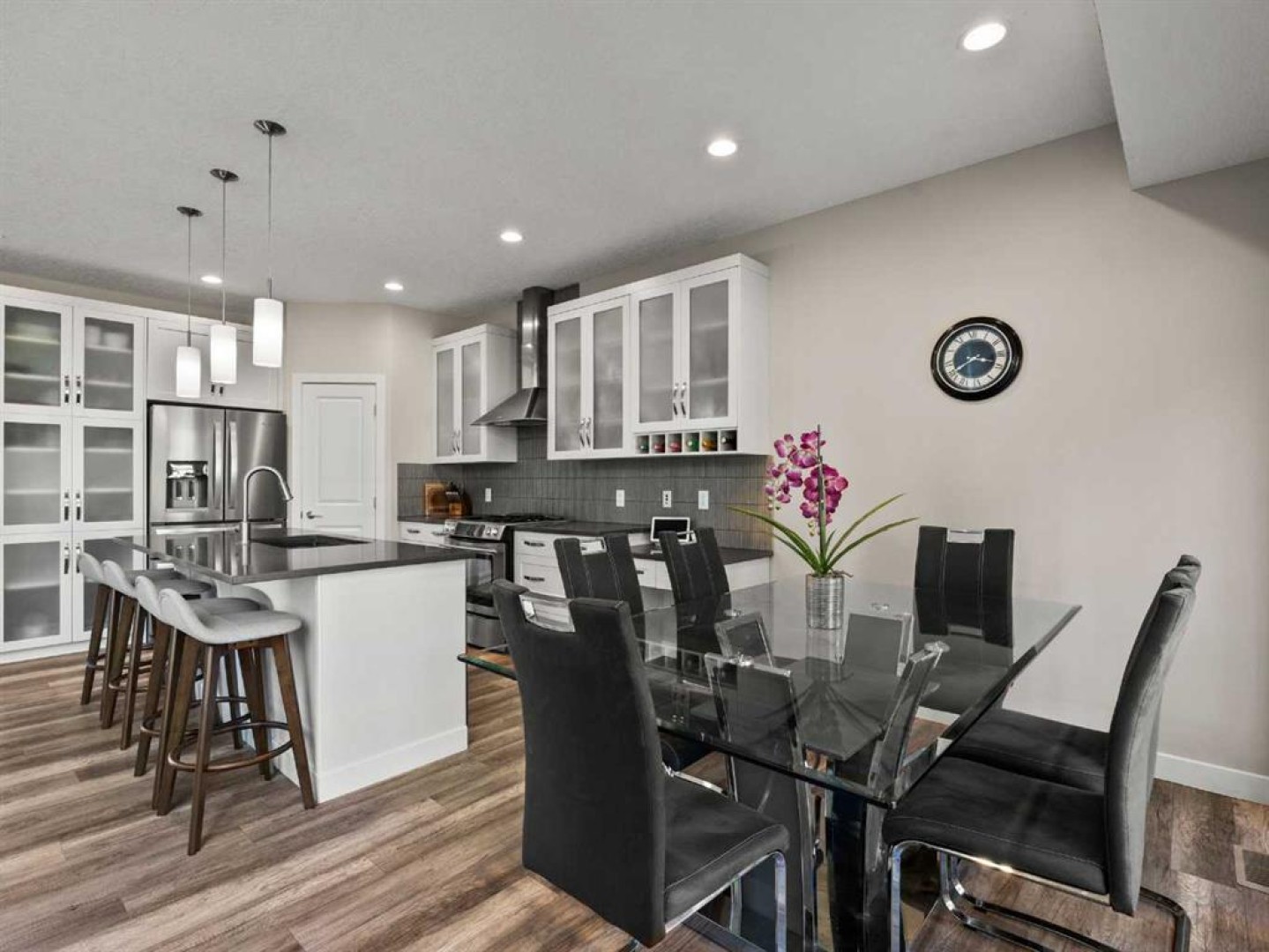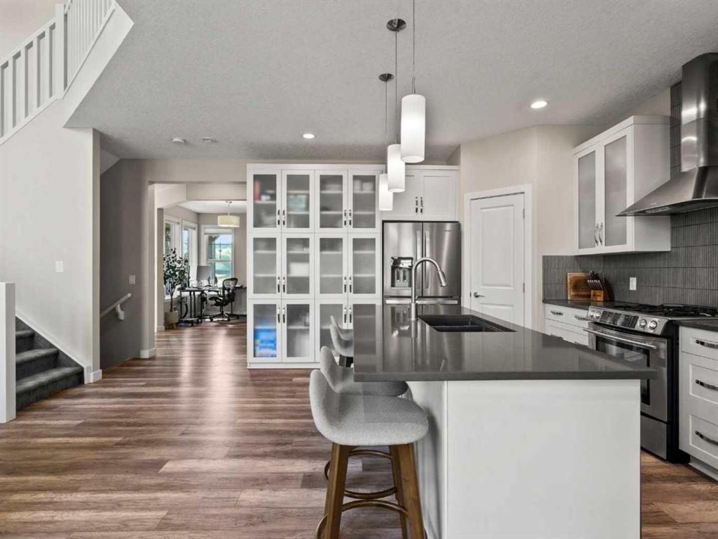 Lake lifestyle! Nestled in a quiet cul-de-sac just steps from the lake and Auburn Bay Schools, this stunning home sits on a massive, professionally landscaped pie lot. The open-concept main floor makes a grand statement with 18-ft floor-to-ceiling windows, custom built-ins, and a cozy gas fireplace. The chef-inspired kitchen boasts quartz countertops, white cabinetry, a gas range, and a walk-in pantry. Upstairs, the primary retreat features a 5-piece ensuite with a deep soaker tub and glass shower. Two additional bedrooms share a full bath, plus a huge vaulted bonus room with surround sound. The fully finished basement (9ft ceilings) is an entertainer’s dream, featuring a private theatre room with a projector, screen, and surround sound, plus a 4th bedroom and full bath. The backyard oasis is unrivaled: a custom pergola, stamped concrete, built-in fire pit. Enjoy year-round lake access in Calgary’s premier community. Open House: Sunday, Jan. 18 from 1-3 PM.