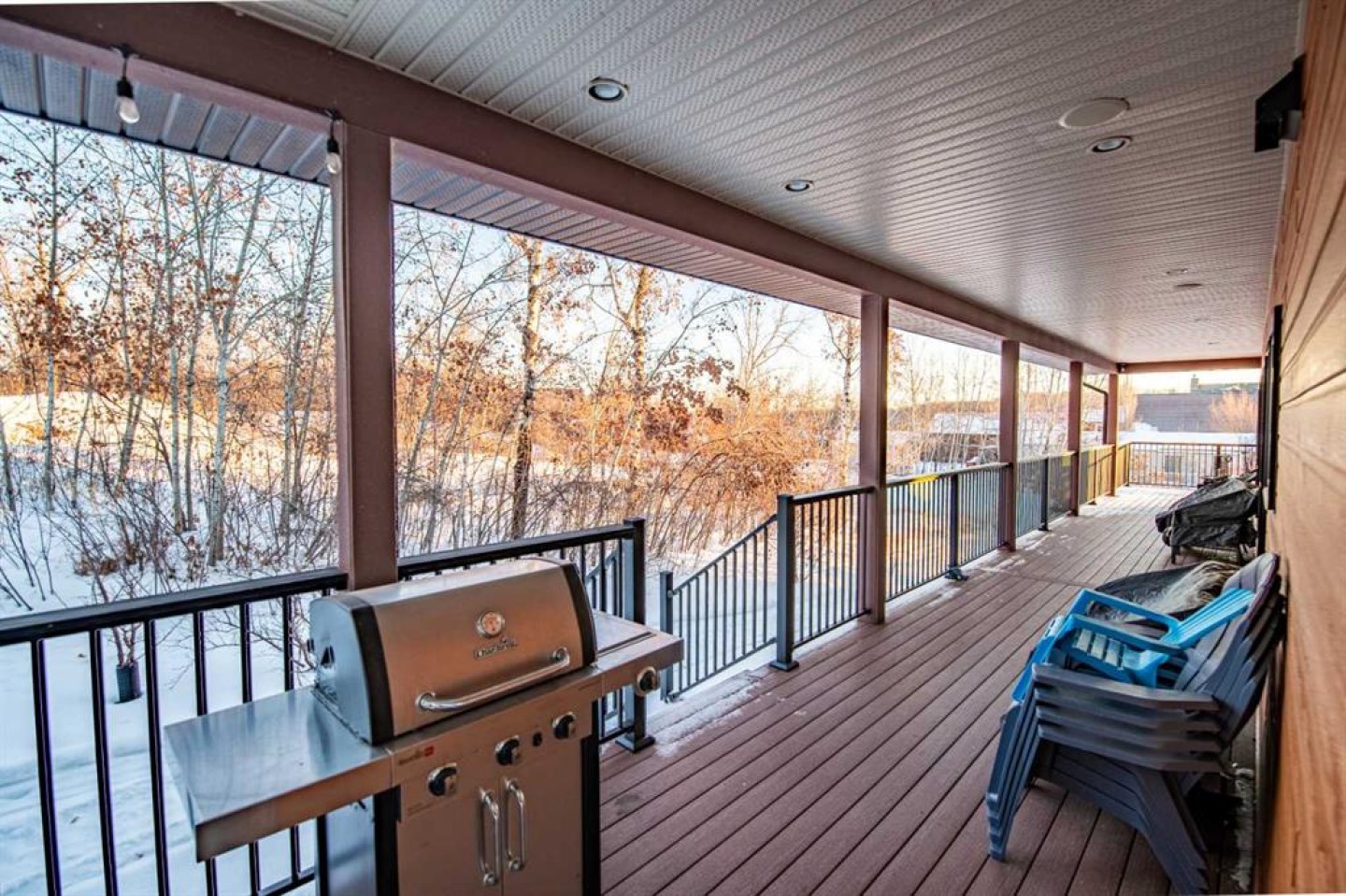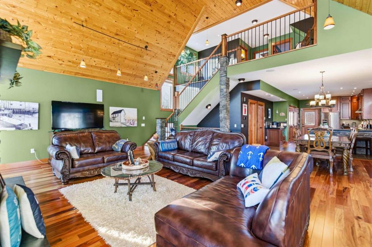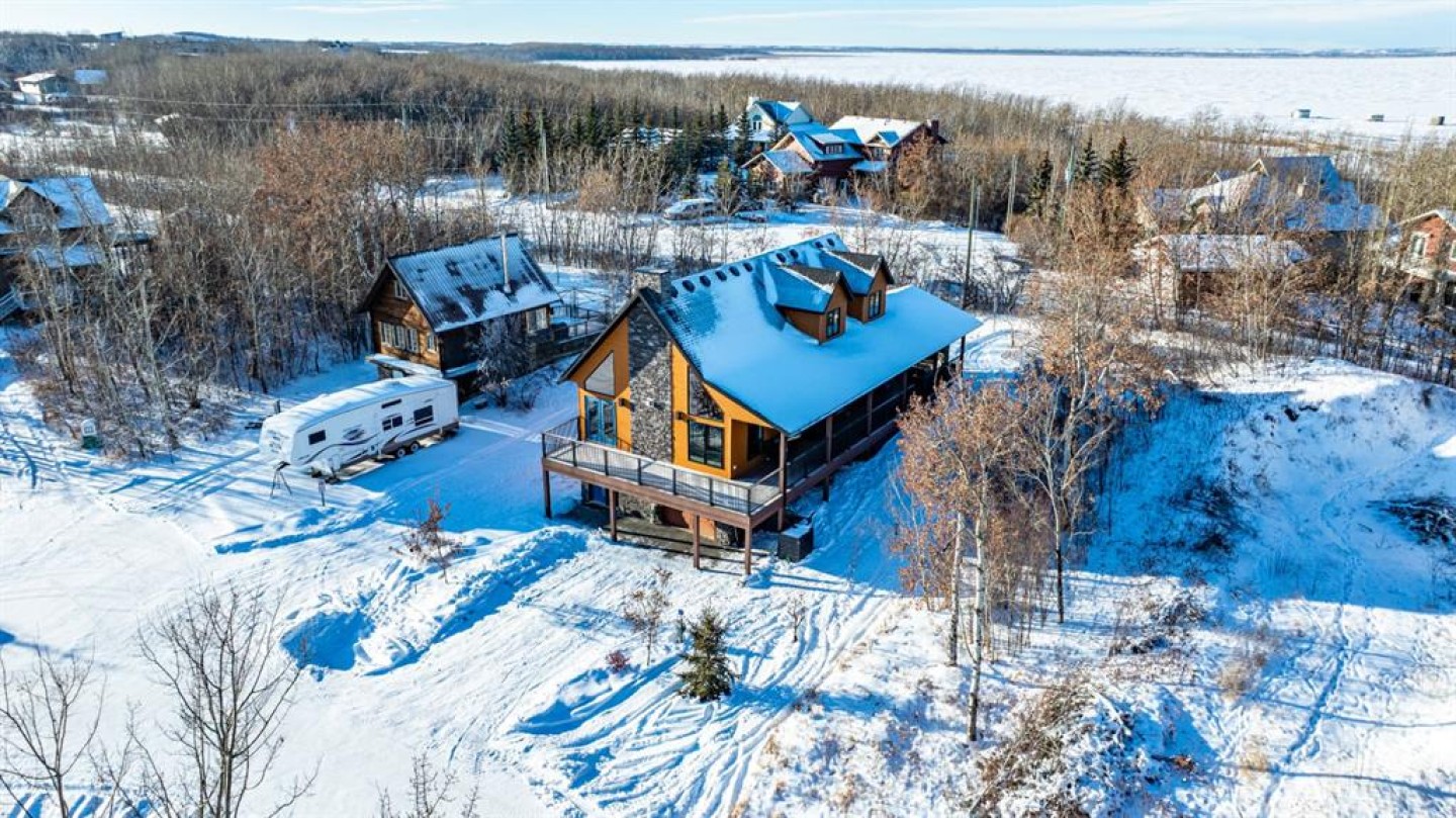 Located at one of Alberta’s largest lakes, Buffalo Lake is truly one of the area’s best-kept secrets. Welcome to Buffalo Sands, a close-knit lake community offering a four-season lifestyle ideal for weekend escapes, unwinding after work or full-time living. This exceptional lakehouse-inspired chalet is not an A-frame cabin, but a thoughtfully designed home with architectural character, warmth and timeless appeal. This beautifully maintained 1½-storey, fully finished home features a front walkout entry-level with 9’ ceilings and in-floor heating, offering comfort and practicality year-round. The attached double heated garage (12’6” x 33’6”) is fully finished, painted, wired and includes a floor drain, upgraded lighting, new electrical panel, and generator hook-up panel. Step inside to a welcoming tiled foyer with generous storage and a stylish 2-piece bathroom. A few steps up, the great room impresses with soaring 19’ vaulted ceilings, polished hardwood floors and a stunning floor-to-ceiling stone fireplace with copper insert, framed by stone pillars inside and out. Large windows flood the space with natural light and showcase tranquil views. The kitchen is designed for both everyday living and entertaining, featuring polished concrete countertops, a premium WOLF gas stove, stainless steel appliance package, corner sink, pantry, breakfast bar and a custom coffee station. Three doors provide seamless access to the massive three-sided wrap-around covered deck, perfect for hosting or relaxing outdoors. The primary bedroom offers a walk-in closet with built-in organizers and a spa-inspired ensuite with an upgraded steam walk-in tiled shower and glass doors. The upper-level loft overlooks the main living space and includes two additional bedrooms and a 4-piece bathroom—ideal for guests, family a library or office nook and direct access to a covered outdoor courtyard complete with a gas fireplace. The entry-level walkout features in-floor heat, a newly created recreation room/could be additional bedroom with plush carpeting, cabinetry and feature dart wall, a large utility/laundry room with epoxy flooring and extensive storage, workshop/boiler room. Outdoor features include multiple conversation areas a fire pit and maintenance-free decking with storage underneath. Recent upgrades include new WOLF stove, stainless refrigerator, Samsung washer/dryer, boiler, furnace and A/C unit, hot water tank, sound system (inside and out), lighting upgrades, paint, cabinetry refinishing, garage improvements, widened driveway, additional parking pad, landscaping/ new sod and stone enhancements. A unique highlight is the walking trail behind the home providing direct access to the lake, beach, docks, playgrounds, pond - skate, canoe or country ski on trails. The property includes the right to boat slip in the community marina (on separate title). Full time residence or your new income / rental escape! This is lake living at its finest-be prepared for love at first sight.