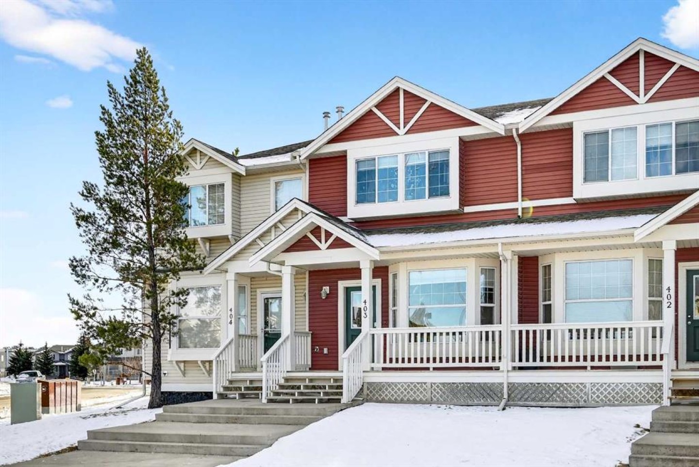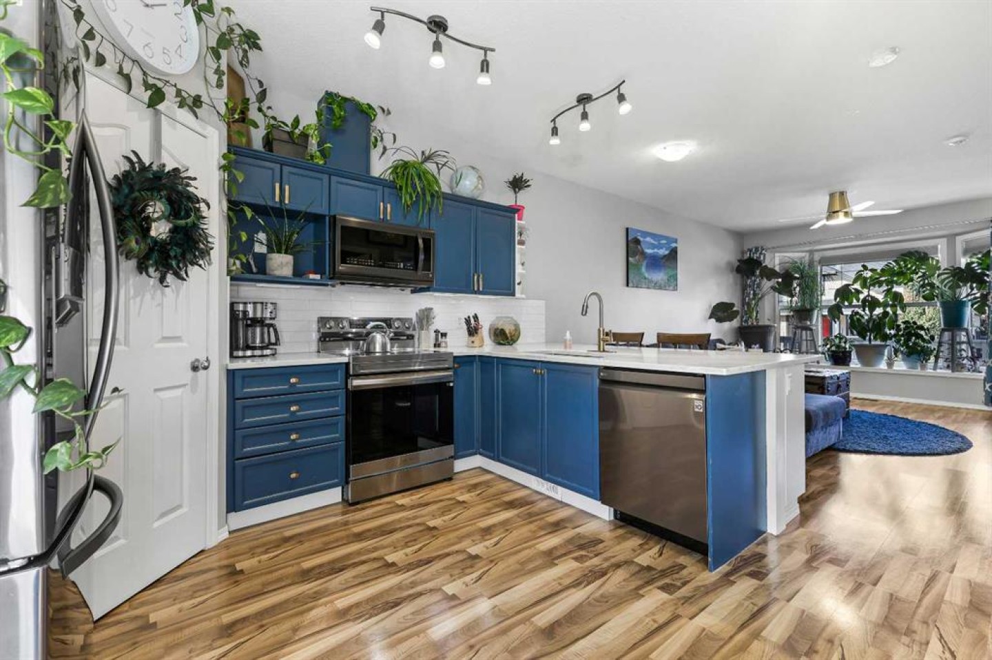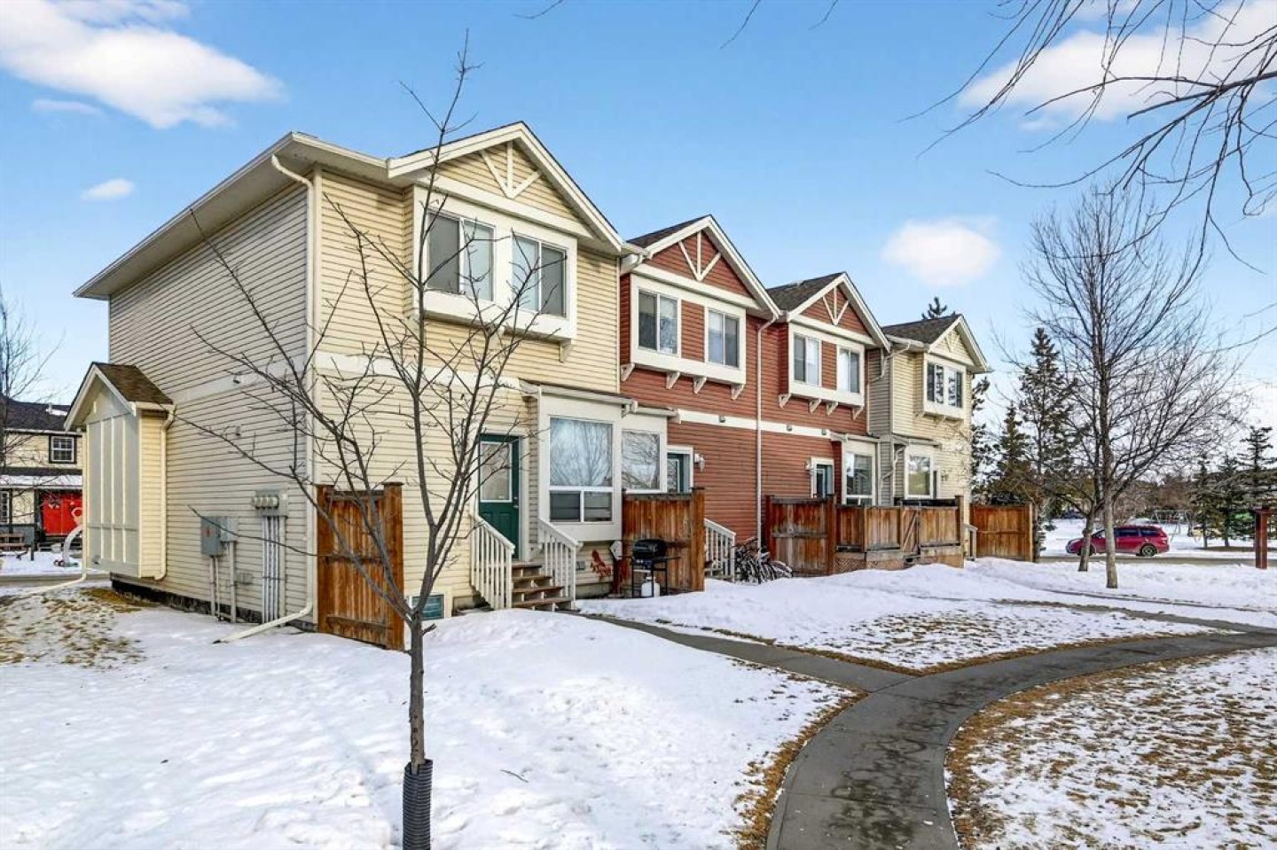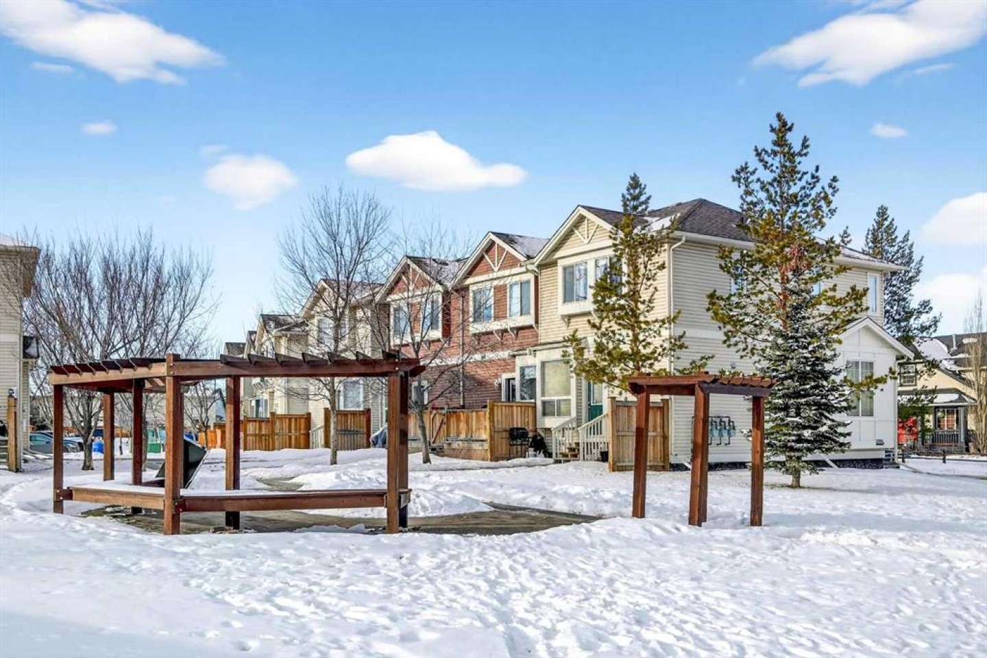 Step into stylish comfort in this beautifully maintained 3-bedroom, 2.5-bath 2-storey townhome located in the heart of family-friendly Luxstone. Boasting over 1,700 sqft of total thoughtfully designed living space with a fully finished basement, this home is the perfect fit for first-time buyers, growing families, downsizers, or savvy investors. The bright and inviting main floor features soaring 9’ ceilings, a large bay window that fills the living room with natural light, modern ceiling fans in both the living and dining areas, and rich laminate floors. The dining space opens to a sun-filled south-facing backyard with your very own private deck backing onto green space and pergola—perfect for summer barbecues or peaceful morning coffees. The refreshed kitchen is a true showstopper with striking navy blue cabinets accented by gold hardware, a sleek white tile backsplash, under-cabinet lighting, and designer granite countertops. A corner pantry, stainless steel appliances, USB-integrated outlets, and a flush eat-up island with added storage make this a modern kitchen ready for everyday function or entertaining. Upstairs, discover three generously sized bedrooms (each equipped with their own ceiling fan), the serene primary suite offers a large walk-in closet and a convenient cheater 4-pc ensuite. The finished basement provides a massive rec room, a full bathroom, separate storage room, and laundry tucked out of the way—ideal for play space, movie nights, or a home gym. Enjoy the two assigned parking stalls, with bonus street parking right in front of the townhome, and a fantastic location just steps from schools, parks, playgrounds, pathways, and everyday amenities. Peace of mind with a BRAND NEW WATER HEATER December 2025! This is your chance to own a move-in ready Airdrie townhome with charm, updates, and unbeatable value!