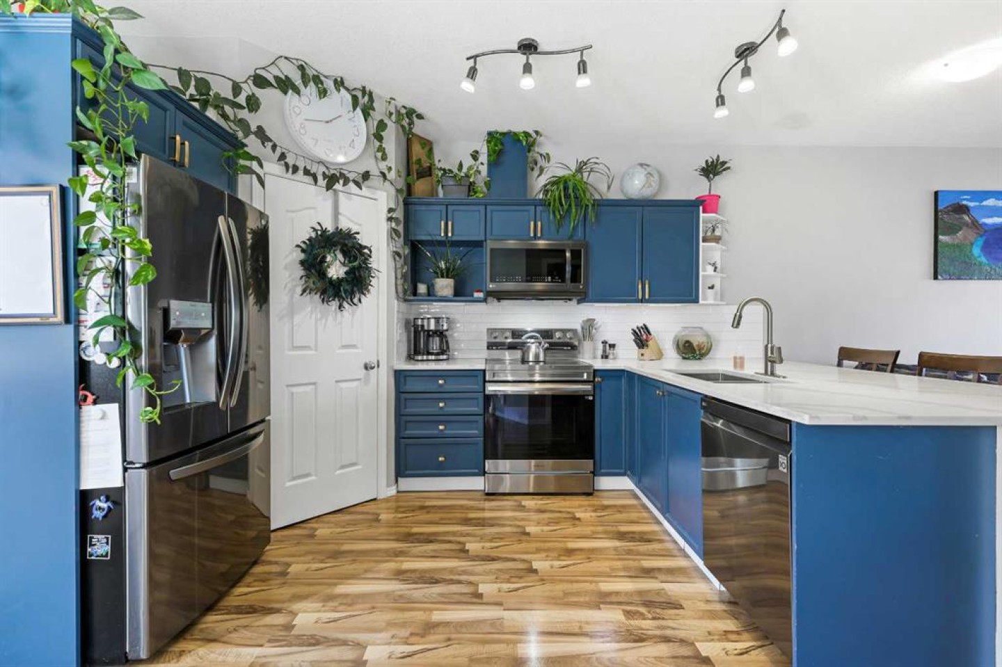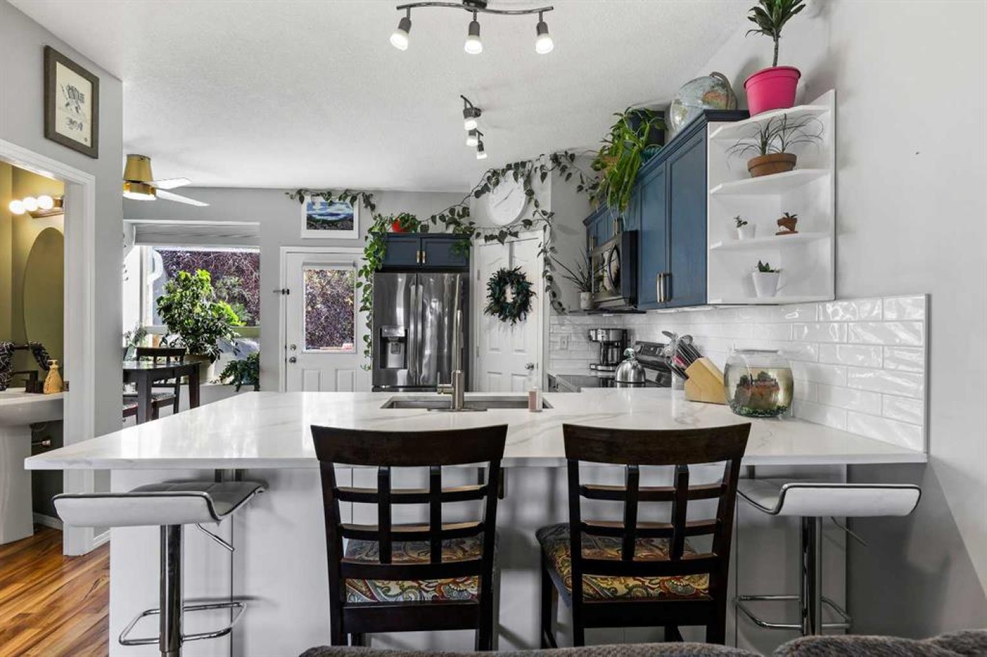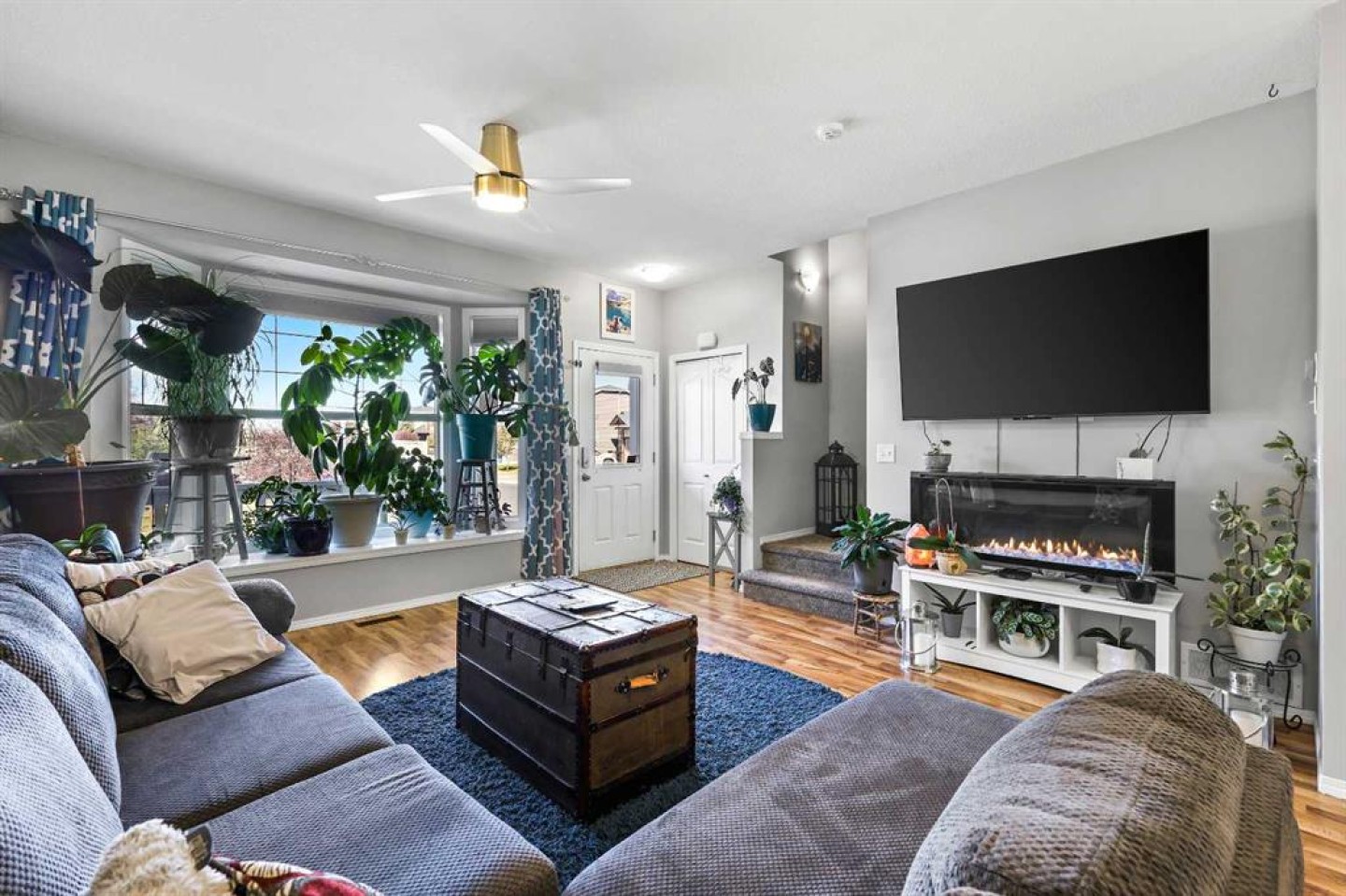 Step into stylish comfort in this beautifully maintained 3-bedroom, 2.5-bath 2-storey townhome located in the heart of family-friendly Luxstone. Boasting over 1,700 sqft of total thoughtfully designed living space with a fully finished basement, this home is the perfect fit for first-time buyers, growing families, downsizers, or savvy investors. The bright and inviting main floor features soaring 9’ ceilings, a large bay window that fills the living room with natural light, modern ceiling fans in both the living and dining areas, and rich laminate floors. The dining space opens to a sun-filled south-facing backyard with your very own private deck backing onto green space and pergola—perfect for summer barbecues or peaceful morning coffees. The refreshed kitchen is a true showstopper with striking navy blue cabinets accented by gold hardware, a sleek white tile backsplash, under-cabinet lighting, and designer granite countertops. A corner pantry, stainless steel appliances, USB-integrated outlets, and a flush eat-up island with added storage make this a modern kitchen ready for everyday function or entertaining. Upstairs, discover three generously sized bedrooms (each equipped with their own ceiling fan), the serene primary suite offers a large walk-in closet and a convenient cheater 4-pc ensuite. The finished basement provides a massive rec room, a full bathroom, separate storage room, and laundry tucked out of the way—ideal for play space, movie nights, or a home gym. Enjoy the two assigned parking stalls, with bonus street parking right in front of the townhome, and a fantastic location just steps from schools, parks, playgrounds, pathways, and everyday amenities. Peace of mind with a BRAND NEW WATER HEATER December 2025! This is your chance to own a move-in ready Airdrie townhome with charm, updates, and unbeatable value!