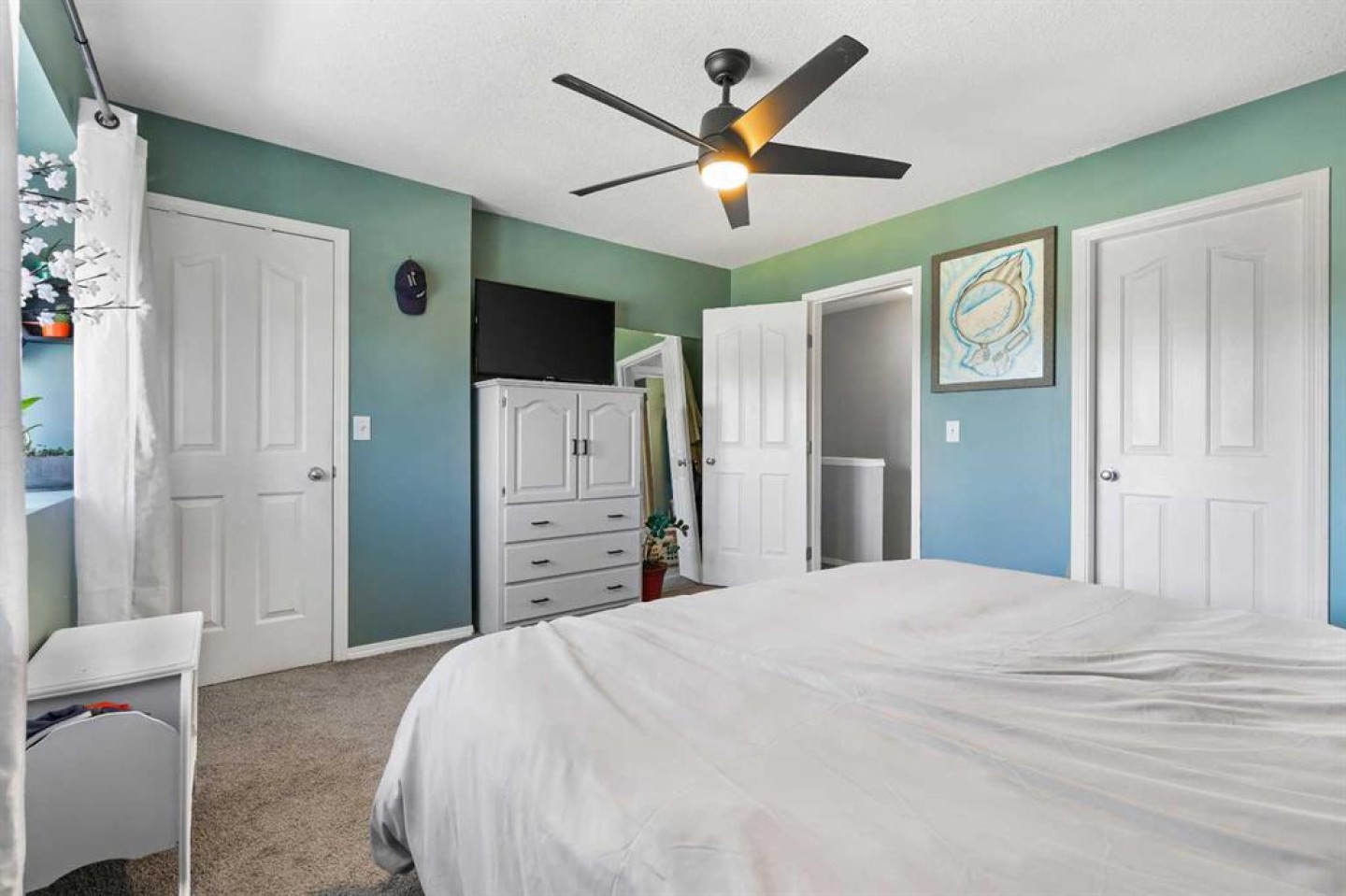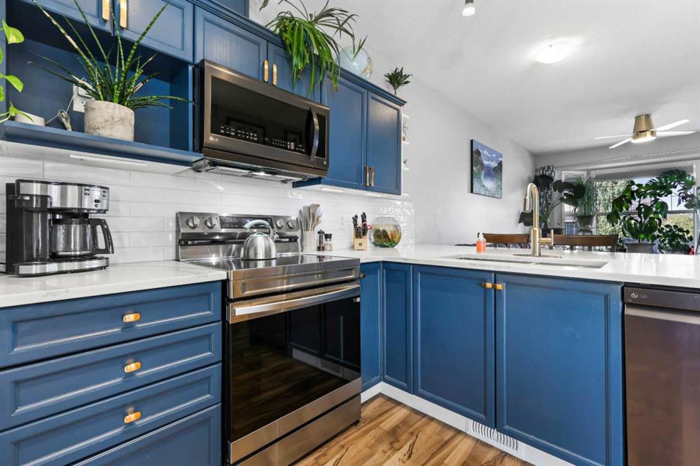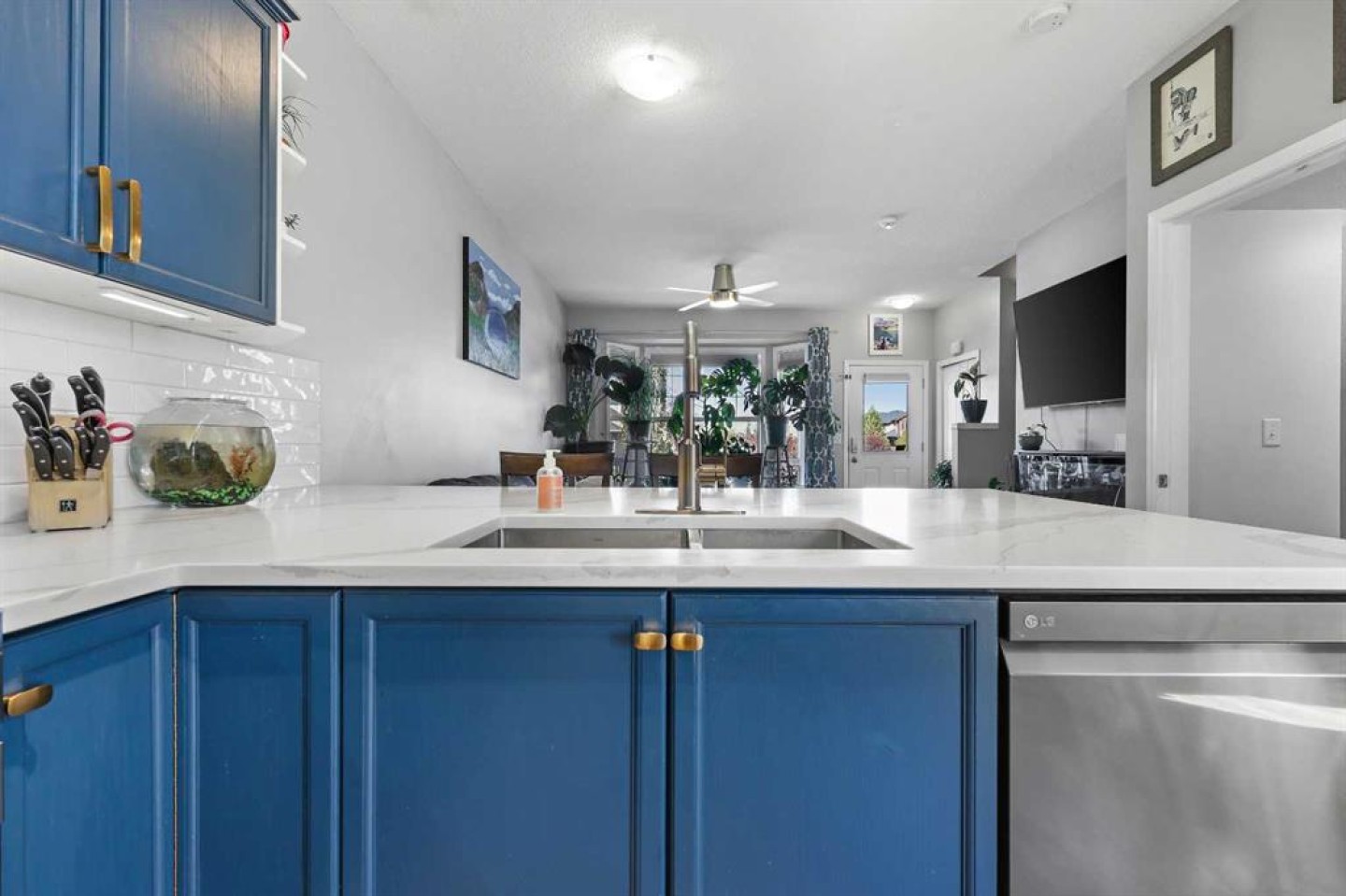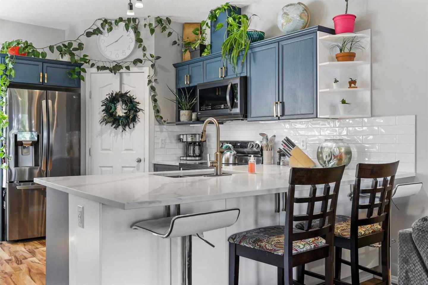 Step into stylish comfort in this beautifully maintained 3-bedroom, 2.5-bath 2-storey townhome located in the heart of family-friendly Luxstone. Boasting over 1,700 sqft of total thoughtfully designed living space with a fully finished basement, this home is the perfect fit for first-time buyers, growing families, downsizers, or savvy investors. The bright and inviting main floor features soaring 9’ ceilings, a large bay window that fills the living room with natural light, modern ceiling fans in both the living and dining areas, and rich laminate floors. The dining space opens to a sun-filled south-facing backyard with your very own private deck backing onto green space and pergola—perfect for summer barbecues or peaceful morning coffees. The refreshed kitchen is a true showstopper with striking navy blue cabinets accented by gold hardware, a sleek white tile backsplash, under-cabinet lighting, and designer granite countertops. A corner pantry, stainless steel appliances, USB-integrated outlets, and a flush eat-up island with added storage make this a modern kitchen ready for everyday function or entertaining. Upstairs, discover three generously sized bedrooms (each equipped with their own ceiling fan), the serene primary suite offers a large walk-in closet and a convenient cheater 4-pc ensuite. The finished basement provides a massive rec room, a full bathroom, separate storage room, and laundry tucked out of the way—ideal for play space, movie nights, or a home gym. Enjoy the two assigned parking stalls, with bonus street parking right in front of the townhome, and a fantastic location just steps from schools, parks, playgrounds, pathways, and everyday amenities. Peace of mind with a BRAND NEW WATER HEATER December 2025! This is your chance to own a move-in ready Airdrie townhome with charm, updates, and unbeatable value!