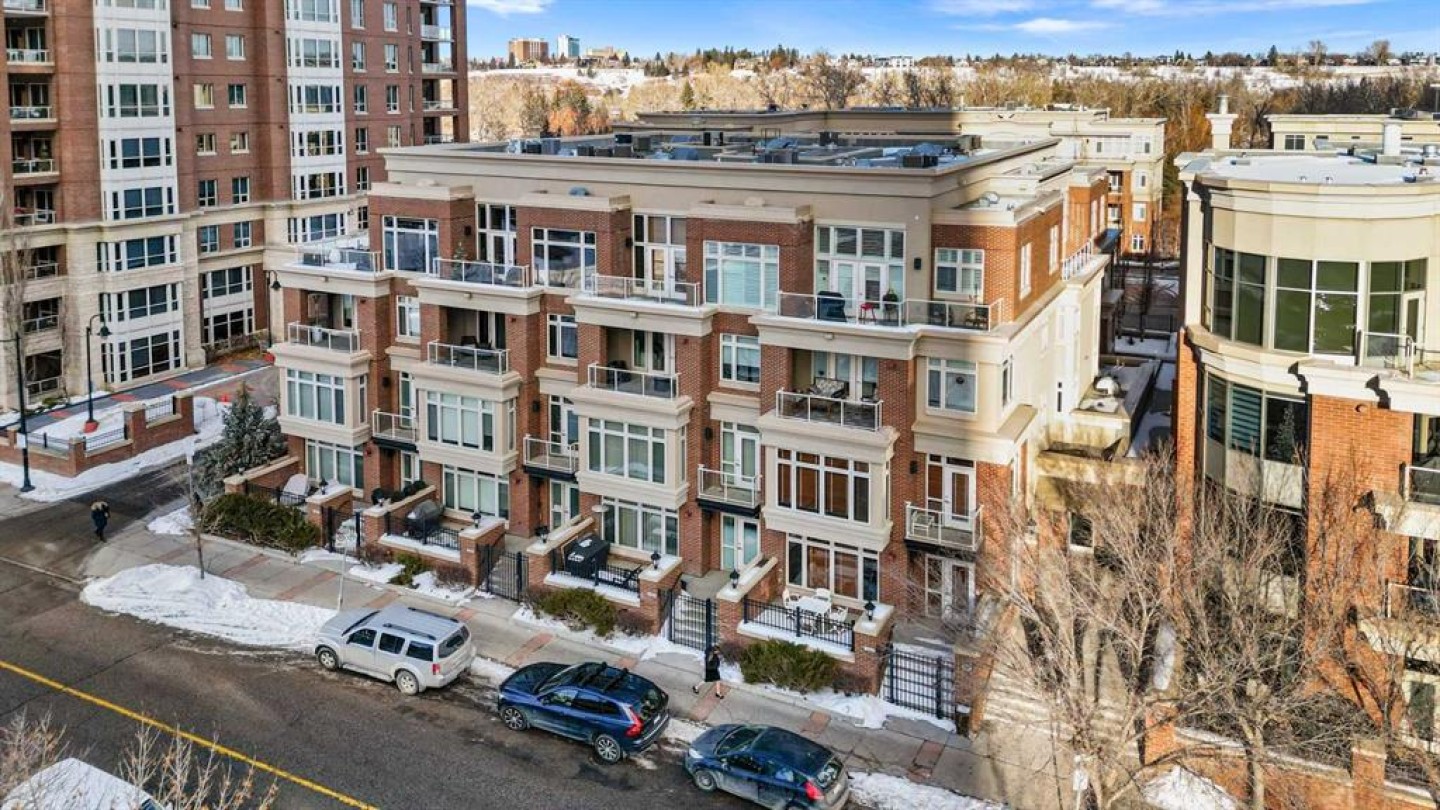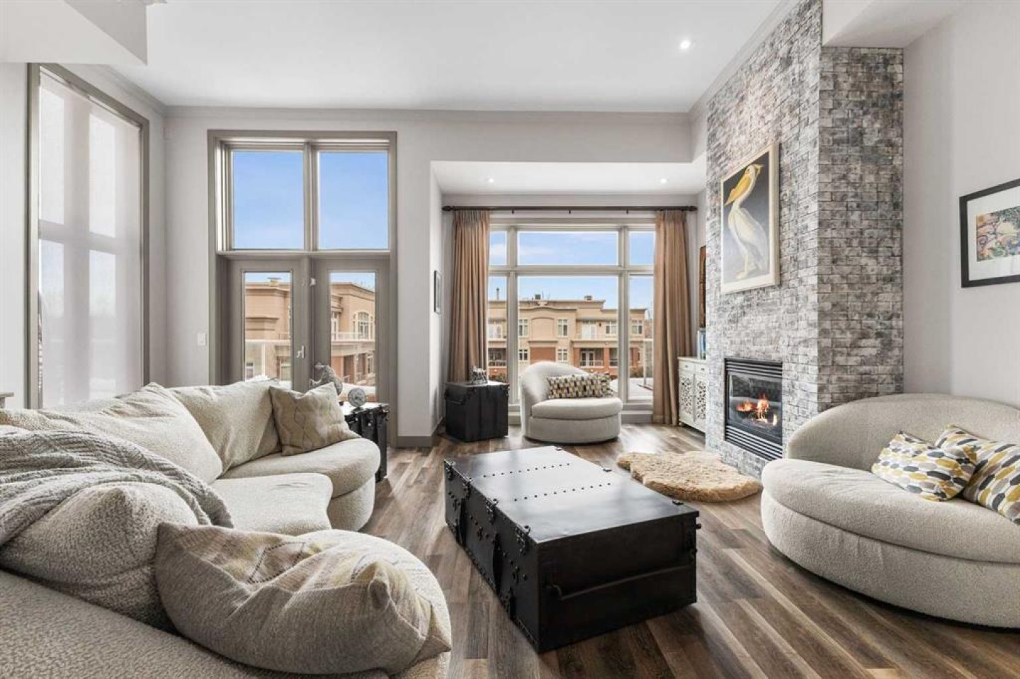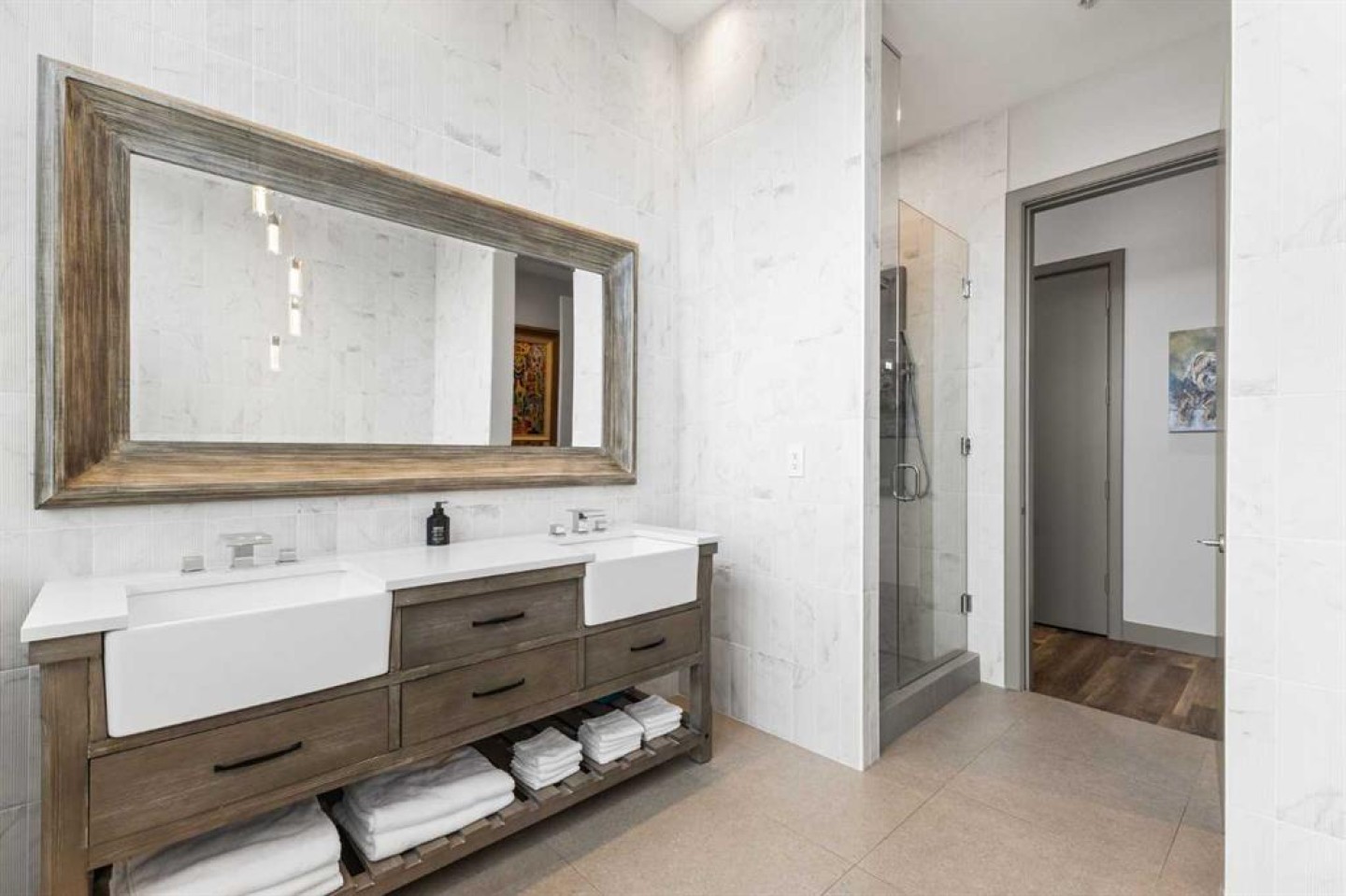 Exceptional completely renovated 2 bedroom, 2 bath penthouse residence offering over 1500 sq ft of luxurious living space in coveted Eau Claire, just steps to picturesque Prince’s Island Park & scenic Bow River pathways. This well-appointed condo presents hardwood floors, soaring ceilings & is drenched in natural light, showcasing a spacious living room with terrace access & anchored by a stunning floor to ceiling fireplace. A formal dining room adorned with an elegant chandelier affords ample space to entertain family & friends. The kitchen is beautifully finished with granite counter tops, eating bar, plenty of storage space & all new high-end stainless steel appliances. Just off the living room, the primary bedroom with balcony access features abundant closet space & private 5 piece ensuite with dual sinks, relaxing freestanding soaker tub & separate shower. The second bedroom & 3 piece bath are ideal for guests. Other notable features include in-suite laundry, 3 large terraces with north & west views, halogen recessed lighting, in-floor heat, central air conditioning, humidification through forced air & power blinds on high windows. Also enjoy the convenience of 2 titled underground parking stalls near the elevator, one titled storage space & recently renovated common areas. The central location can’t be beat – Bow River pathways & Prince’s Island Park & the Peace Bridge are just steps away plus downtown restaurants & amenities are close by. This elegant residence offers the ultimate in exclusivity & privacy with only 4 units on the floor & no noise from above.