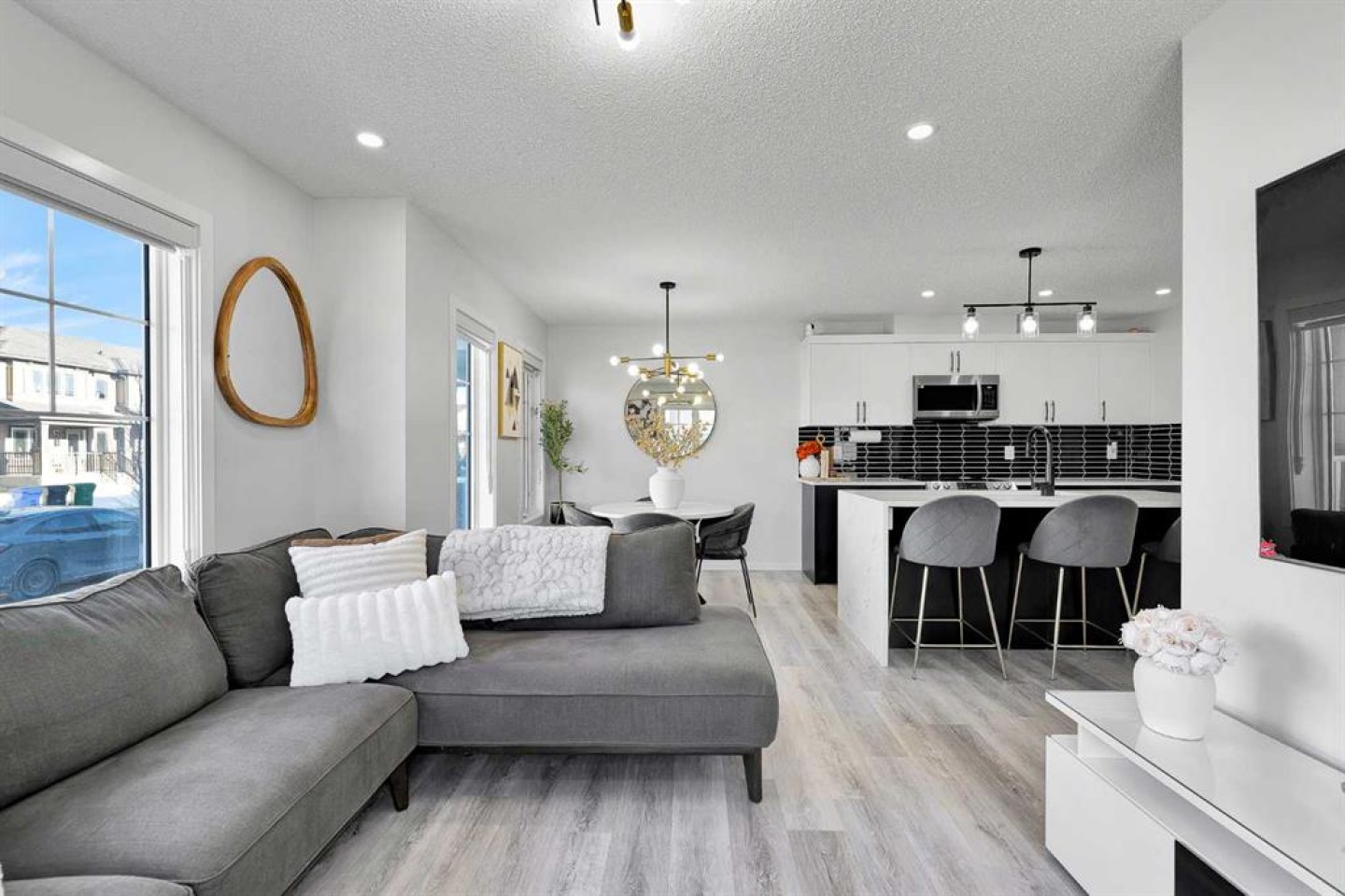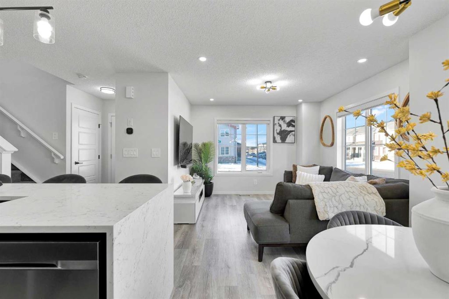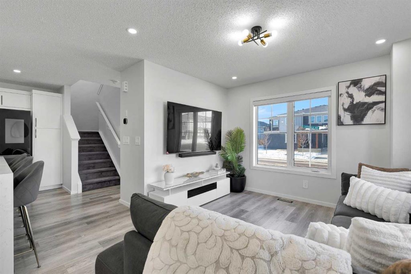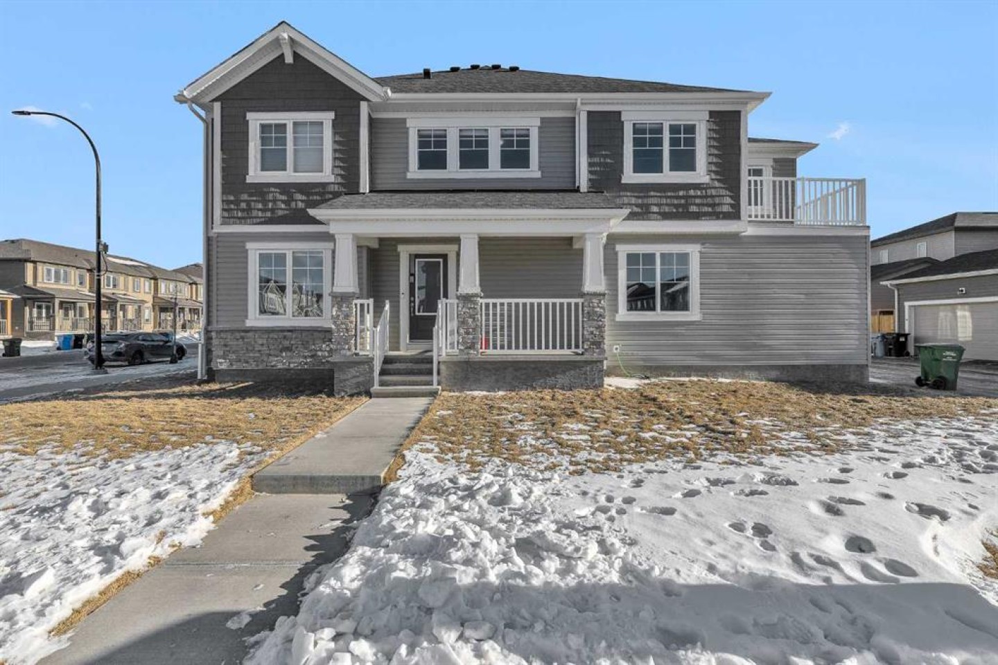 Located in the family-centric community of Carrington, this nearly new and impeccably maintained 3 Bed 3 Bath, air conditioned home, is the one you’ve been waiting for. Welcome to 11 Carringham Way NW! This unique corner unit features a private side entrance, offering the feel and look of a detached home. Upon entry, the main floor showcases impressive upgrades, including luxury vinyl plank flooring, a custom blind package, and stylish light fixtures. The kitchen is designed for both everyday living and entertaining, featuring a large quartz island, upgraded appliances, and ample cabinetry to meet all your storage needs. The open-concept layout includes a dedicated dining area and a bright front living room, perfect for gatherings. Extra windows throughout this corner unit flood the space with natural light thanks to its desirable west exposure. Upstairs, the primary bedroom provides a comfortable retreat with a walk-in closet and a four-piece ensuite—an ideal space for Mom and Dad as well as a private balcony that benefits from those sunny SW Mountain views. Two additional bedrooms, another four-piece bathroom, and convenient upper-level laundry complete the second floor. The basement is unfinished and ready for your creative vision. Outside, this oversized corner lot offers the option to fence the west and northwest sides, creating a private outdoor space. The insulated double attached garage is a welcome feature during Calgary’s cold winter months. Ideally located close to parks, playgrounds, shopping, and schools, with quick access to Stoney Trail and Deerfoot Trail. A future LRT extension and additional commercial development further enhance the long-term value of this fantastic home. Book your private showing today!