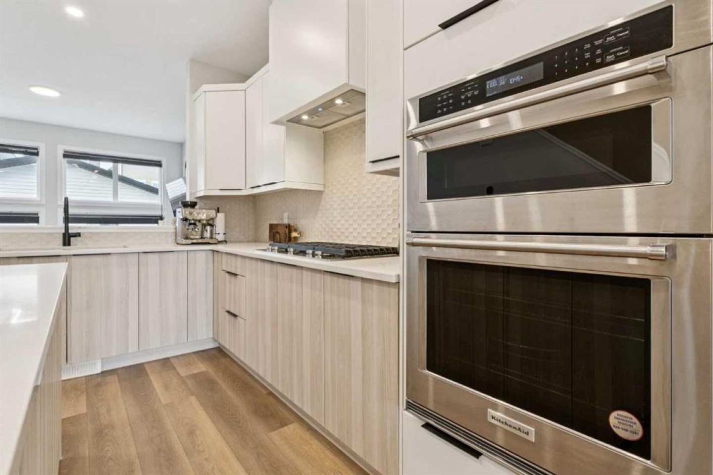 Beautiful and inviting, this stunning Jayman-built home is located in the sought-after Northwest community of Glacier Ridge. Surrounded by parks, playgrounds, and scenic walking paths, this new neighborhood offers the perfect blend of community and convenience. From the moment you step inside, you'll appreciate the thoughtful layout, quality craftsmanship, and modern design. The open-concept main floor is perfect for both everyday living and entertaining. At the heart of the home is a gorgeous gourmet kitchen featuring a central island with a flush eating bar, sleek stainless steel appliances, and high-end finishes. You'll love the KitchenAid French door refrigerator, gas cooktop, built-in wall oven and microwave combo, and the stylish cabinet hood fan. The spacious dining area flows seamlessly from the kitchen, making it ideal for hosting family dinners or casual get-togethers. The home’s layout is both stylish and functional, with the elevated kitchen overlooking the spacious lower living room. Here, soaring 11 ft ceilings and a beautiful feature fireplace create a warm, open atmosphere perfect for relaxing or entertaining. At the front of the home, a bright and versatile flex/den space with sleek glass wall and a door welcomes in an abundance of natural light through an oversized picture window—ideal for a home office, reading nook, or kid’s play area. Adding to the home’s modern appeal, the staircase and entire second floor have been upgraded with durable and stylish vinyl plank flooring, offering a cohesive, low-maintenance finish throughout the upper levels. Upstairs, you'll find three generously sized bedrooms, including a stunning Primary Suite complete with a large walk-in closet and a spa-inspired 4-piece ensuite featuring dual vanities and an oversized shower. For added convenience, the second-floor laundry is thoughtfully tucked just steps away. This Jayman-built home includes impressive standard features focused on comfort and energy efficiency—like six solar panels, BuiltGreen Canada certification, and a high EnerGuide rating. Enjoy clean air with a UV-C purification system, consistent airflow from a high-efficiency furnace with HRV, and endless hot water with a Navien tankless heater. Triple-pane windows provide excellent insulation, and smart home technology with Alexa adds modern convenience. With a detached double car garage, a professionally finished rear deck with a gas BBQ line, and fully landscaped yard, this low-maintenance home is move-in ready for you and your family. Don't miss the opportunity to live in this vibrant and welcoming community—your dream home is waiting!