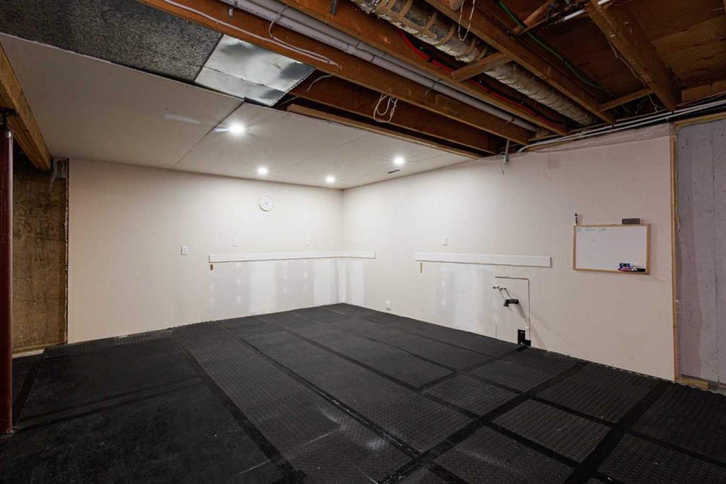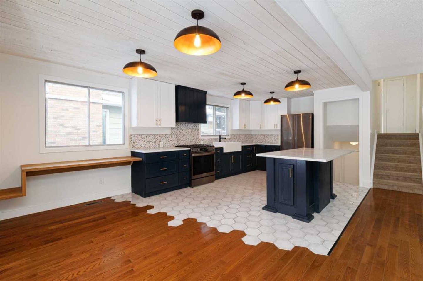 Welcome to this stunningly transformed 4-level split in the heart of Queensland, where mid-century charm meets contemporary luxury. No expense was spared in this top-to-bottom renovation, offering 1,738 square feet of finished living space. The main floor is a showstopper, featuring an open concept layout with gorgeous hardwood flooring and a custom kitchen. The culinary space boasts sleek navy and white cabinetry, a large central island, quartz countertops, a classic farmhouse sink, and a unique hexagonal tile transition that seamlessly blends the kitchen and dining areas. Large windows and dual skylights flood the space with natural light, highlighting the modern wood plank ceiling and industrial-chic lighting. Relax in the expansive living room, anchored by a sleek, minimalist fireplace with a slate hearth. Retreat to the upper level where you will find three generously sized bedrooms, including the primary with two piece ensuite. The lower level provides even more versatility with a massive recreation room—perfect for a home theatre or play area—along with a fourth bedroom and a second full bathroom, making it an ideal space for guests or teenagers. The basement level houses the laundry and a large open space ensuring you’ll never be short of storage. A separate entrance walks up to the large private yard with mature trees and plenty of space to roam. An oversized double detached garage and parking space for your RV complete this property. This home is ideally located and is just minutes from schools, shopping, the ridge at Fish Creek Park, and an off leash dog park. Don’t miss your chance to own one of the most uniquely renovated homes in this established, quiet community!