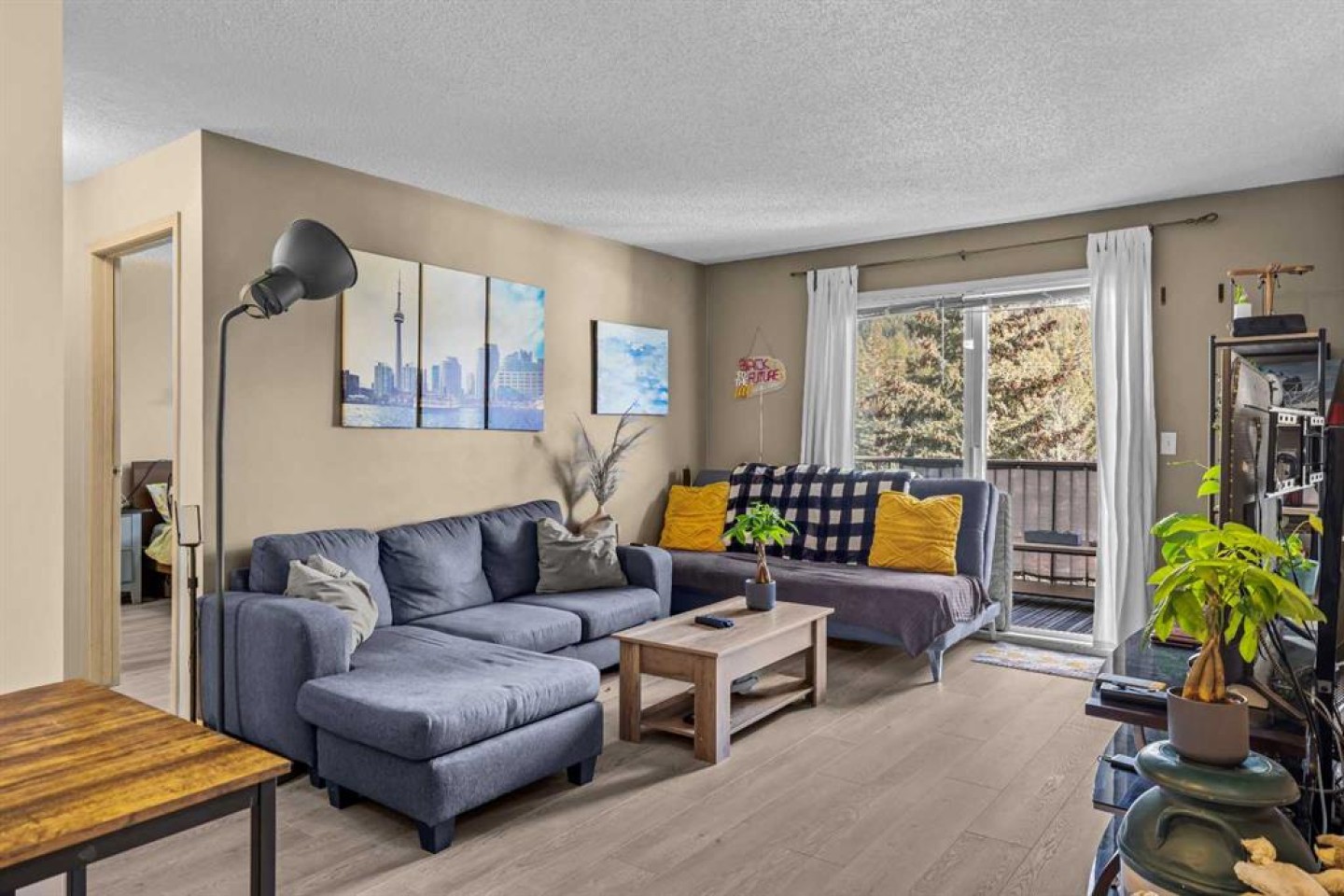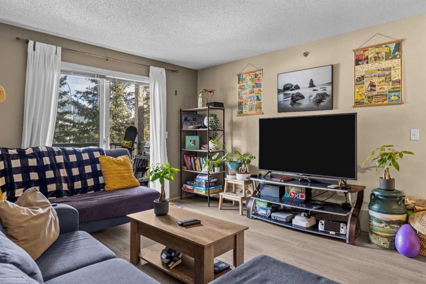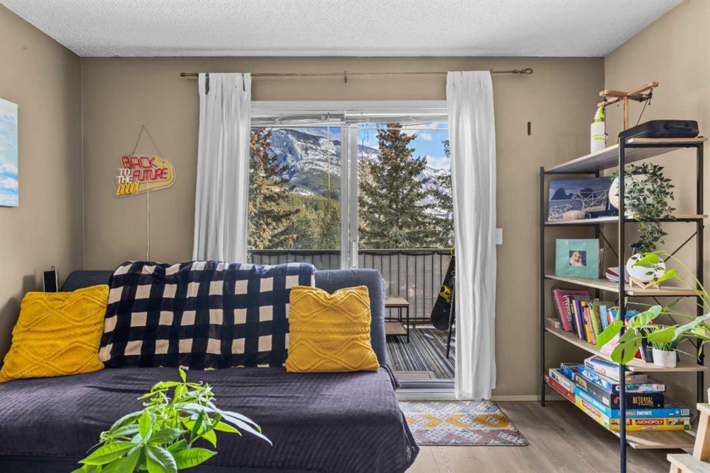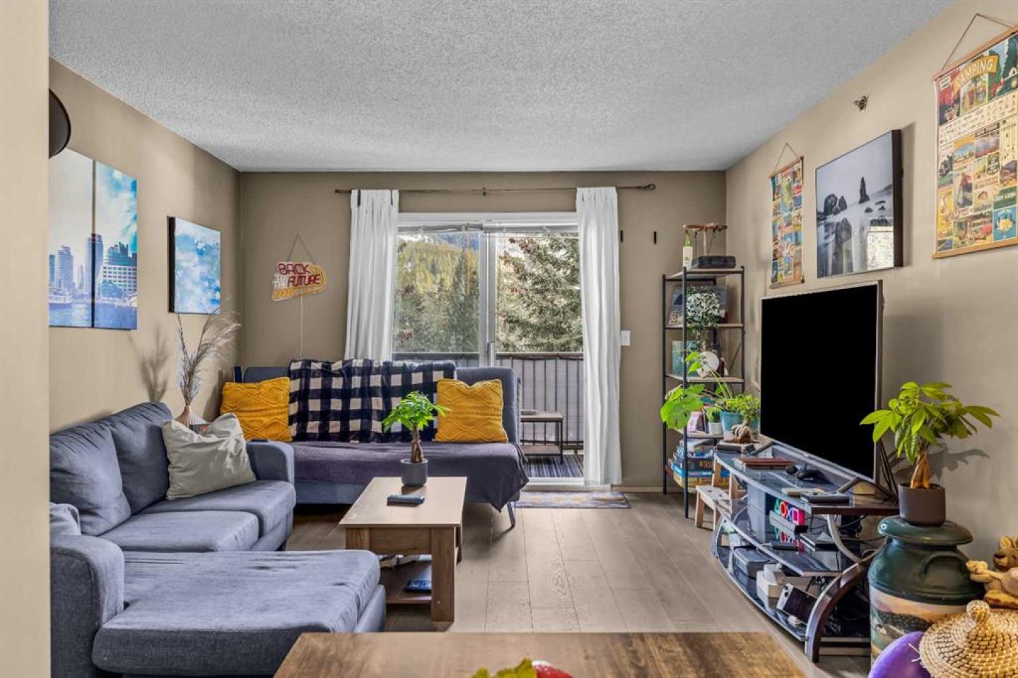 This Point of View condo delivers exceptional value for anyone looking to enter the Canmore market—whether as a first home or a smart investment. This 2-bed, 2-bath top-floor unit sits in a quiet, family- and pet-friendly community and offers over 800 sq ft of inviting, functional living space. Recent flooring updates complement the open-concept layout, with seamless flow into the kitchen and living area. The ideal split-bedroom design places each bedroom on opposite sides of the unit, creating privacy for owners, guests, or roommates. The primary suite features a generous walk-through closet and a full ensuite. A standout feature is the large in-suite laundry and storage room, providing secure space for all your mountain gear. Step outside to a comfortable patio with partial mountain views and natural shade from mature trees—perfect for warm summer days. The complex includes 2 outdoor parking stalls, ample visitor parking, and an on-site playground framed by stunning mountain scenery. With its thoughtful layout, peaceful setting, and attractive price point, this condo truly checks all the boxes. Book your showing today.