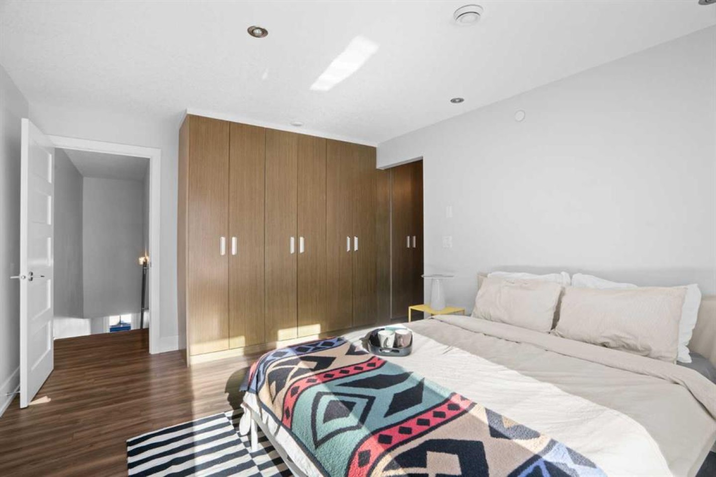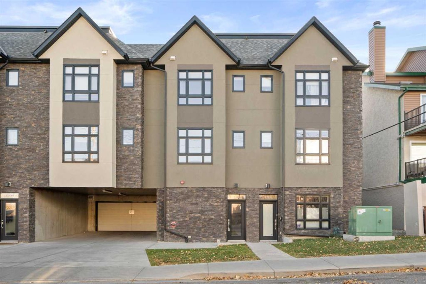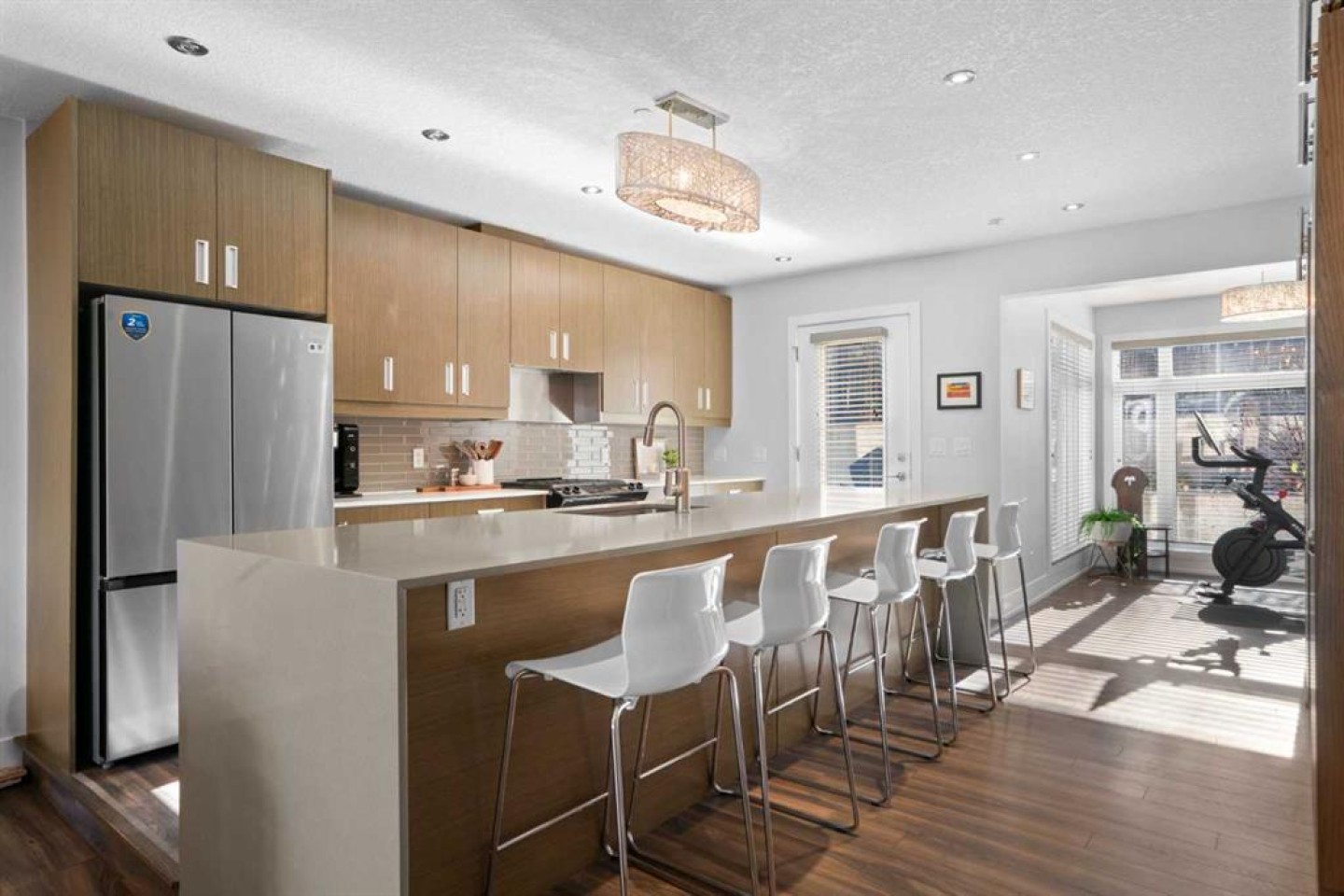 This stylish and sun-filled townhouse in Bankview offers the perfect blend of modern design, functional space, and unbeatable value. Featuring two heated and secure underground parking stalls, this home stands out with thoughtful upgrades and a layout ideal for both everyday living and entertaining. The open-concept main floor is anchored by soaring 9-foot ceilings and durable laminate flooring throughout. A spacious living room offers plenty of room to relax or host guests, while the kitchen is a true showpiece with a large waterfall quartz island, undermount sink, stainless steel appliances, gas range, and a deep pantry with both open and closed storage. The adjacent dining area is surrounded by two walls of south-facing windows, filling the space with natural light. Just outside, a shared patio with gas hookup creates a perfect spot for summer evenings and weekend lounging. A convenient two-piece bathroom completes the main level. Upstairs, both bedrooms are generously sized and feature their own private ensuite bathrooms and built-in wardrobes. The primary suite is oversized with excellent storage and a sleek 4-piece bath. The secondary bedroom features a five-piece ensuite, additional closet space, and its own private south-facing balcony overlooking the courtyard. The upper level also includes the laundry machines, conveniently located near both bedrooms for added ease and efficiency. With secure underground parking, modern finishes, and a location close to transit, shopping, parks, and the university, this home is the total package. Monthly condo fees include everything except electricity, offering true peace of mind in this turnkey property.