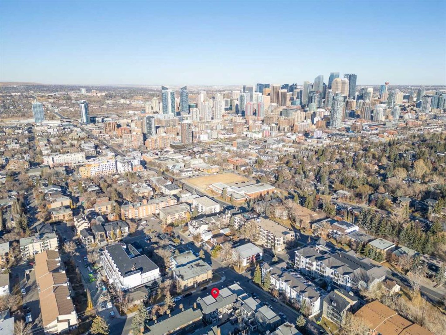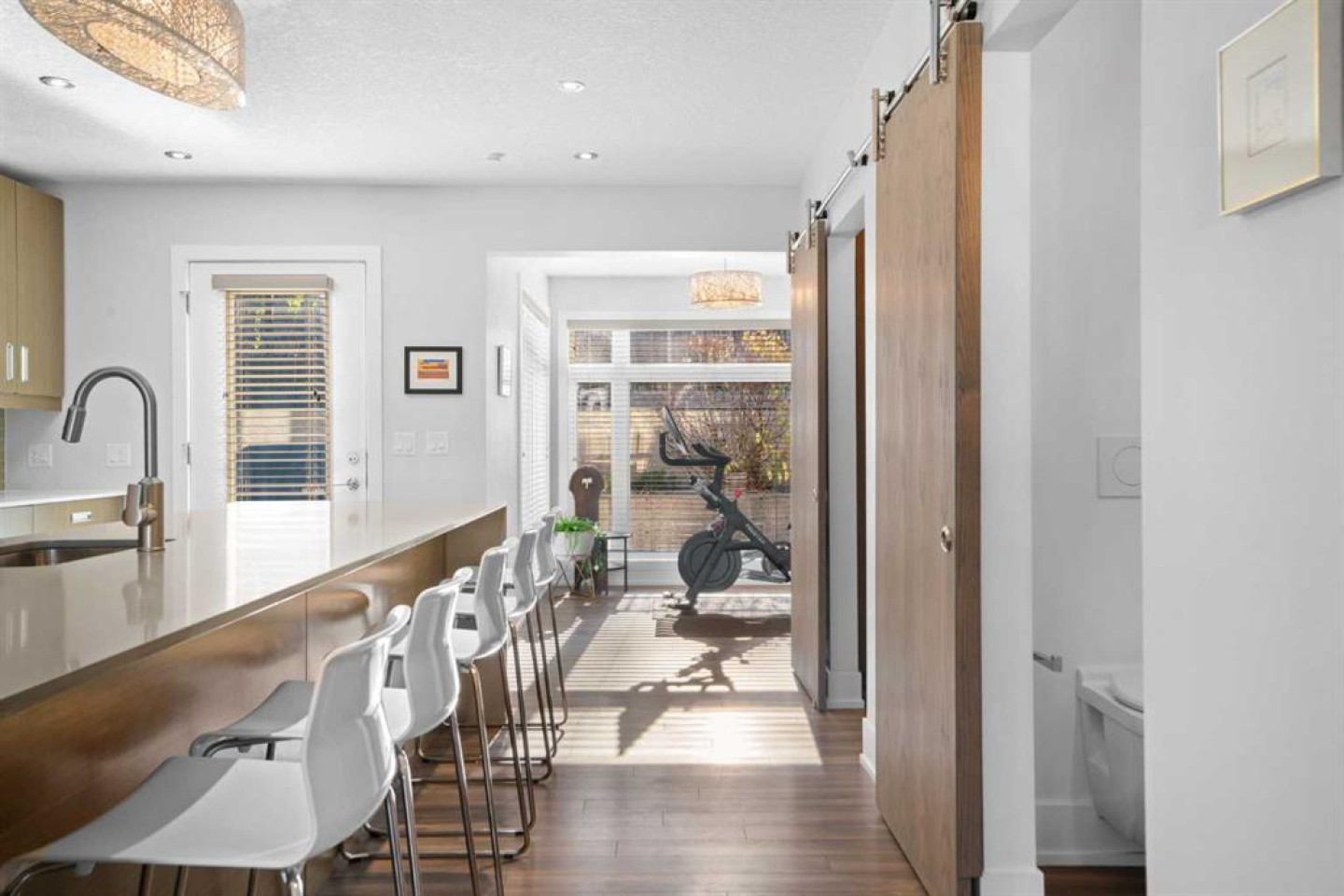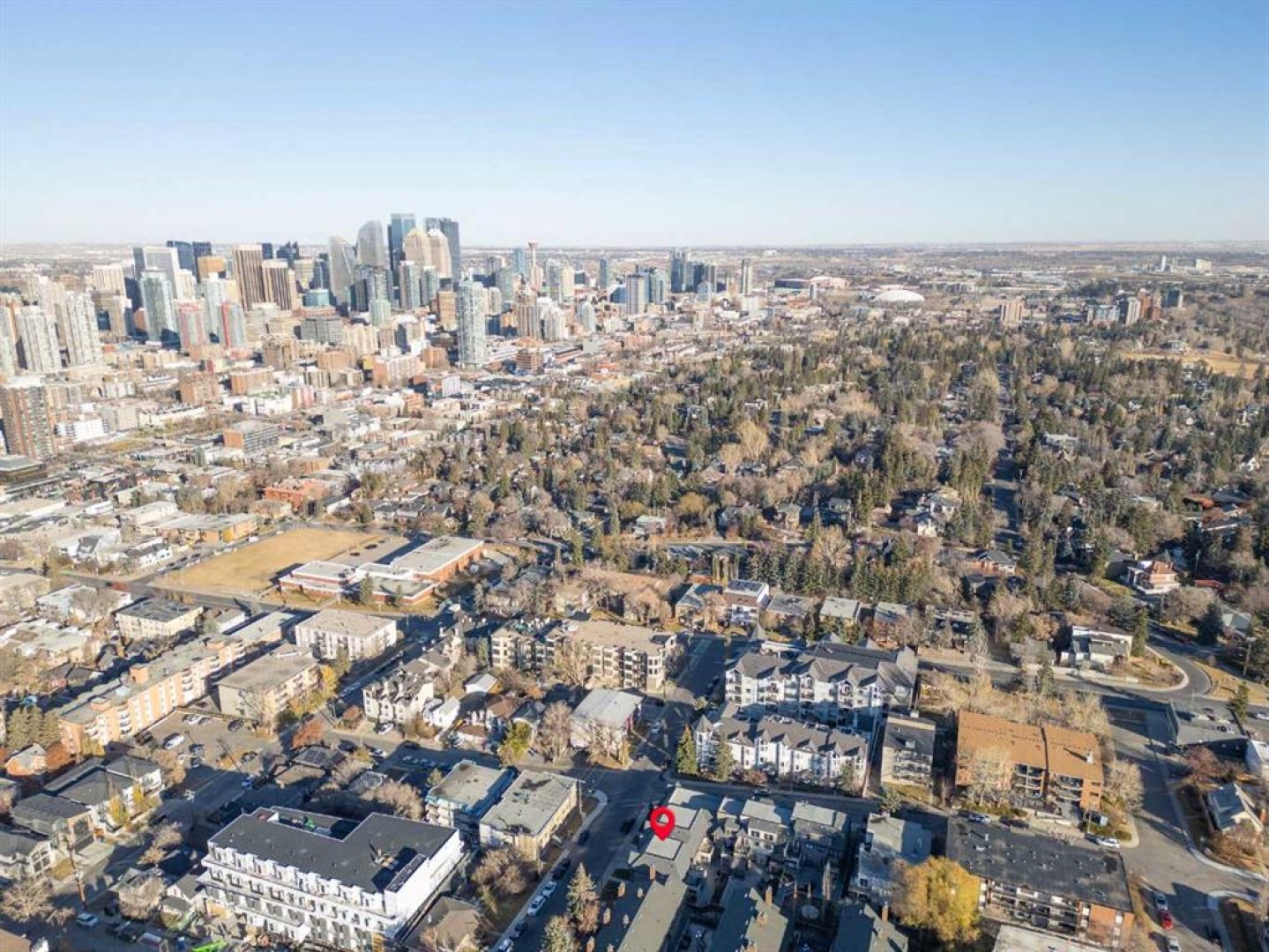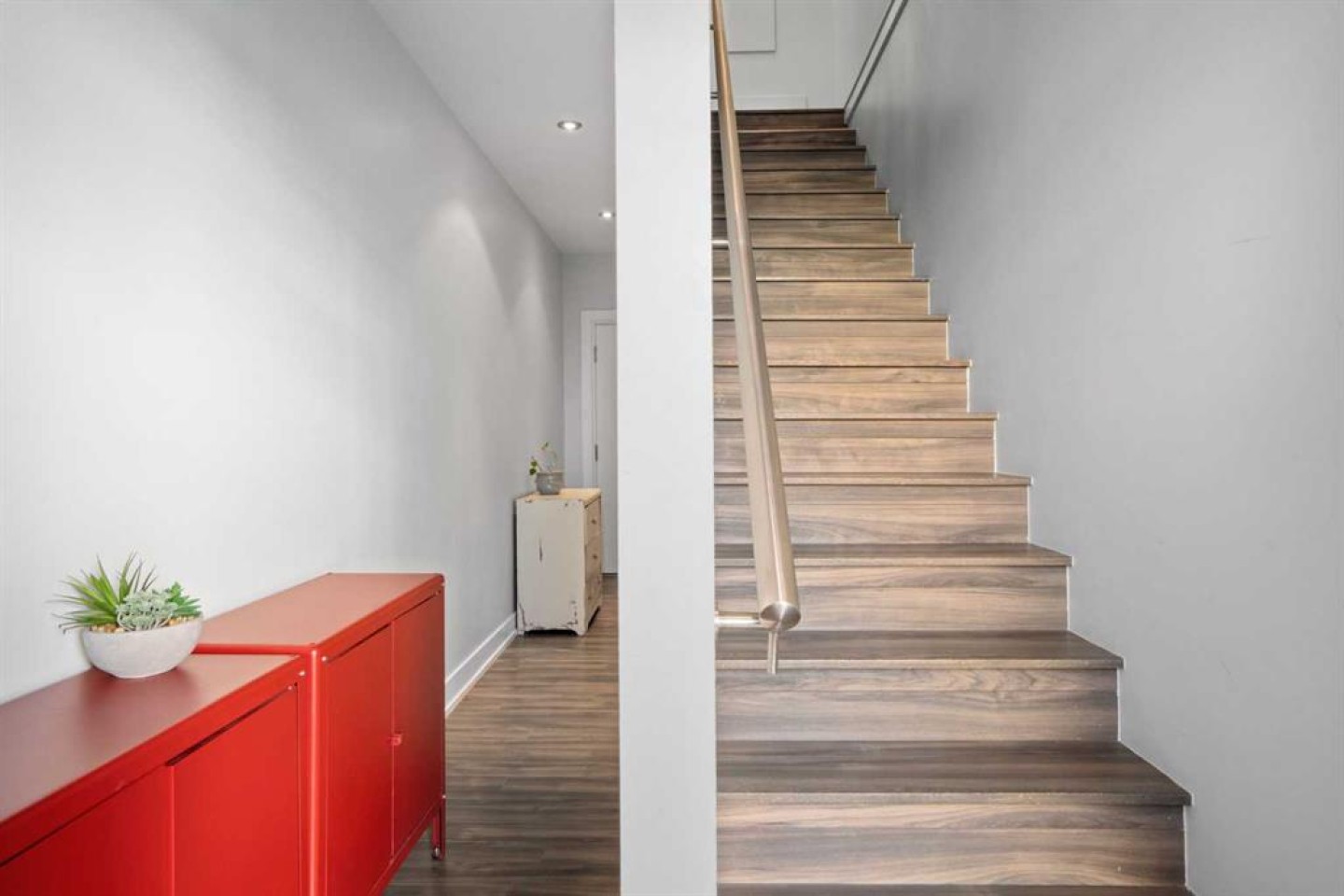 This stylish and sun-filled townhouse in Bankview offers the perfect blend of modern design, functional space, and unbeatable value. Featuring two heated and secure underground parking stalls, this home stands out with thoughtful upgrades and a layout ideal for both everyday living and entertaining. The open-concept main floor is anchored by soaring 9-foot ceilings and durable laminate flooring throughout. A spacious living room offers plenty of room to relax or host guests, while the kitchen is a true showpiece with a large waterfall quartz island, undermount sink, stainless steel appliances, gas range, and a deep pantry with both open and closed storage. The adjacent dining area is surrounded by two walls of south-facing windows, filling the space with natural light. Just outside, a shared patio with gas hookup creates a perfect spot for summer evenings and weekend lounging. A convenient two-piece bathroom completes the main level. Upstairs, both bedrooms are generously sized and feature their own private ensuite bathrooms and built-in wardrobes. The primary suite is oversized with excellent storage and a sleek 4-piece bath. The secondary bedroom features a five-piece ensuite, additional closet space, and its own private south-facing balcony overlooking the courtyard. The upper level also includes the laundry machines, conveniently located near both bedrooms for added ease and efficiency. With secure underground parking, modern finishes, and a location close to transit, shopping, parks, and the university, this home is the total package. Monthly condo fees include everything except electricity, offering true peace of mind in this turnkey property.