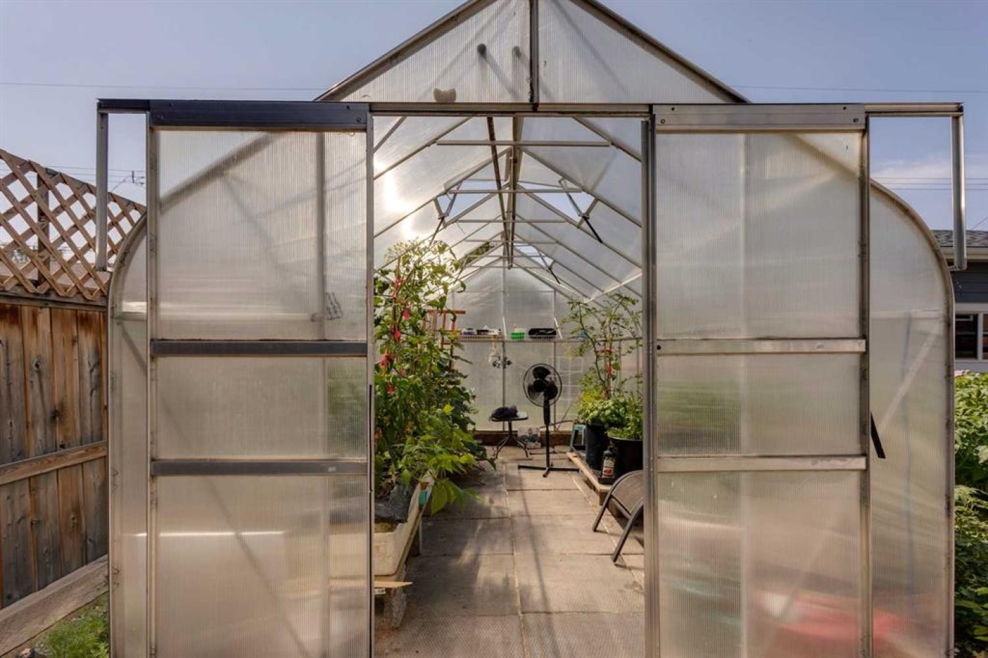 Additional refrigerator in pantry, green shelving unit in utility room, shed in yard, firewood, raised garden beds, greenhouse, rain barrel(s)
