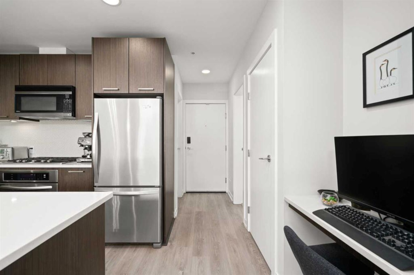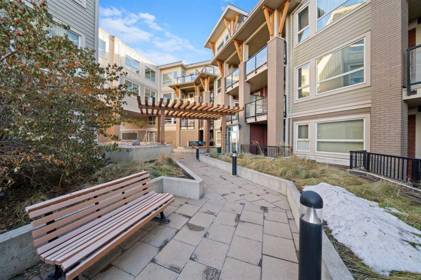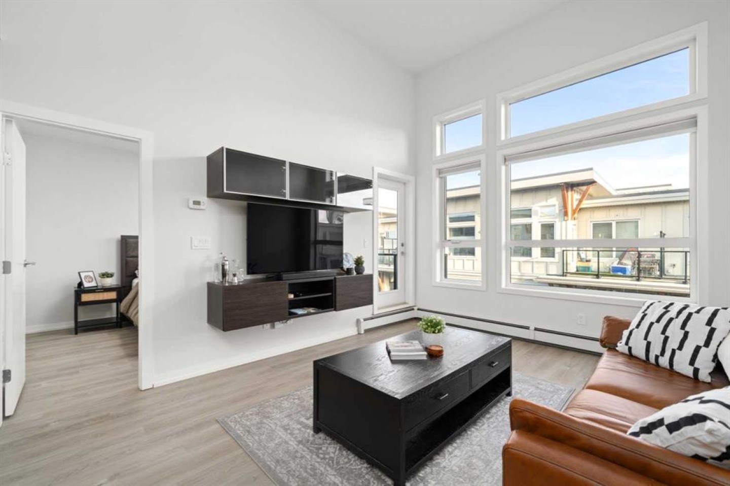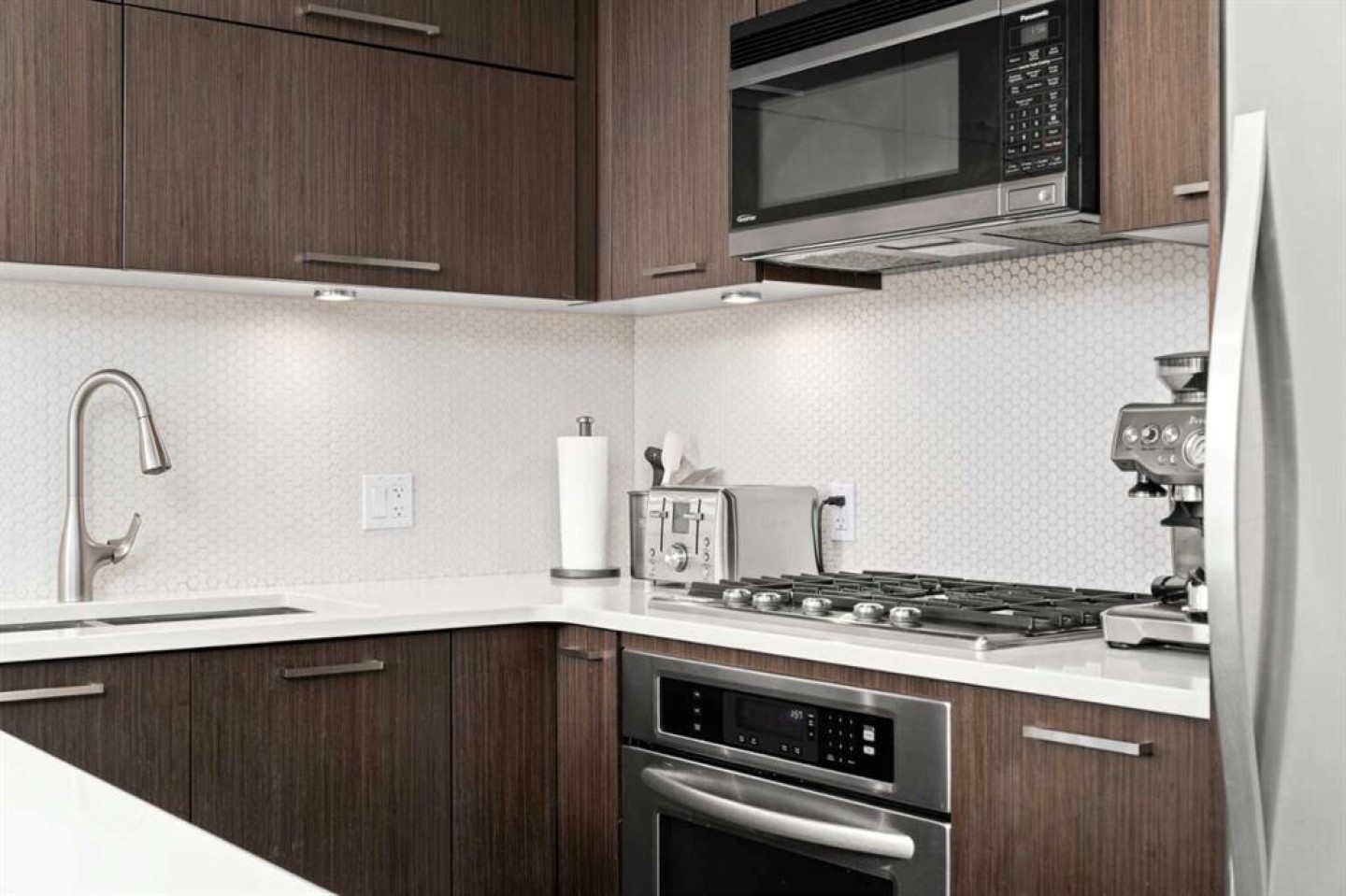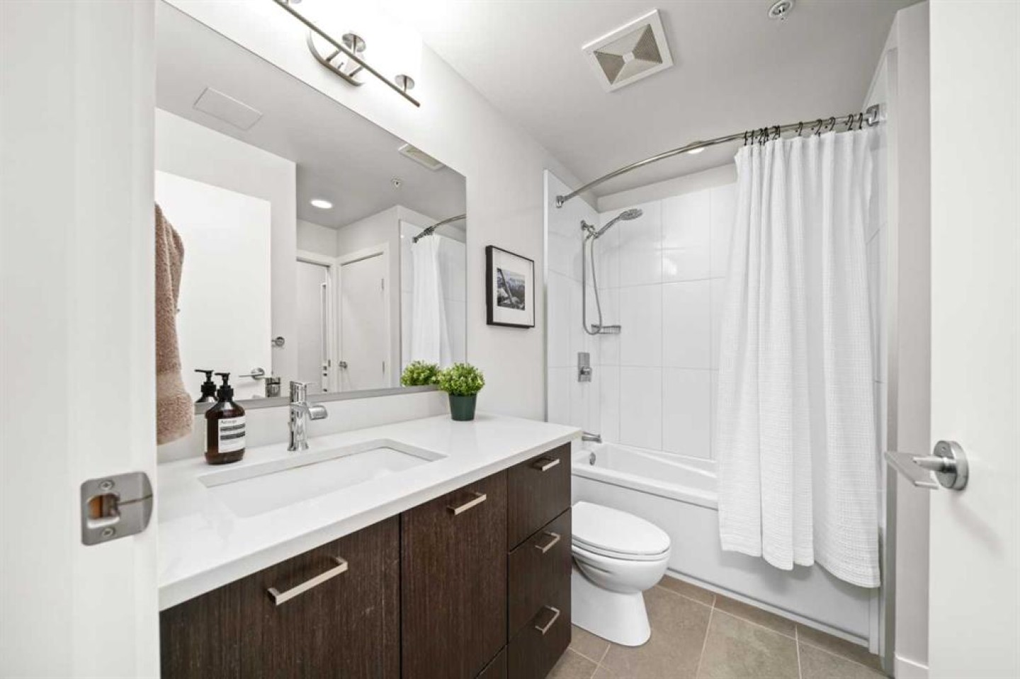 Located on the top floor of the NEXT building, this bright and stylish 1-bedroom home is defined by soaring 13-foot ceilings and an abundance of natural light that immediately sets it apart. Recently painted and refreshed, the unit is move-in ready and thoughtfully designed for both comfort and functionality, featuring an open-concept layout anchored by a sleek kitchen with stainless steel appliances including a built-in oven and gas cooktop, quartz countertops, a functional eating bar, and generous cabinetry for smart storage. Luxury vinyl plank flooring throughout offers a clean, modern look while being exceptionally durable and low maintenance. The living and dining areas feel open and inviting, enhanced by the dramatic ceiling height and custom entertainment built-ins—ideal for entertaining or unwinding at the end of the day—while the private, sun-filled balcony with BBQ gas hookup is perfect for summer evenings. The spacious bedroom connects seamlessly to a walk-in closet and 4-piece cheater ensuite, complemented by in-suite laundry with a front-load washer and dryer. Storage is well covered with an in-suite storage room, assigned storage locker, and a titled underground parking stall. Residents enjoy excellent building amenities including a fully equipped fitness centre, secure bike storage, car wash, and pet wash station. Just minutes from downtown and steps from transit, this location offers easy access to the restaurants, cafés, and shops along Edmonton Trail and Centre Street, with the charm and energy of Bridgeland nearby, plus river pathways, parks, and everyday amenities all within easy reach—making this an excellent opportunity for downtown professionals.