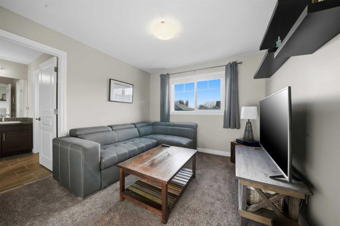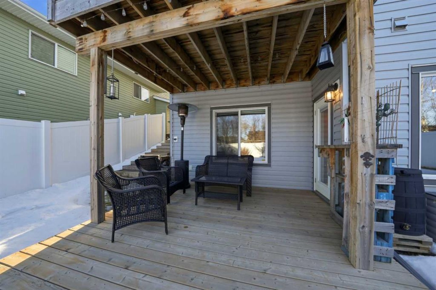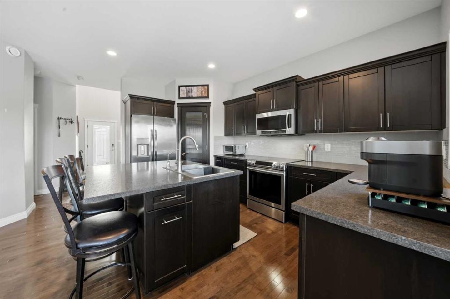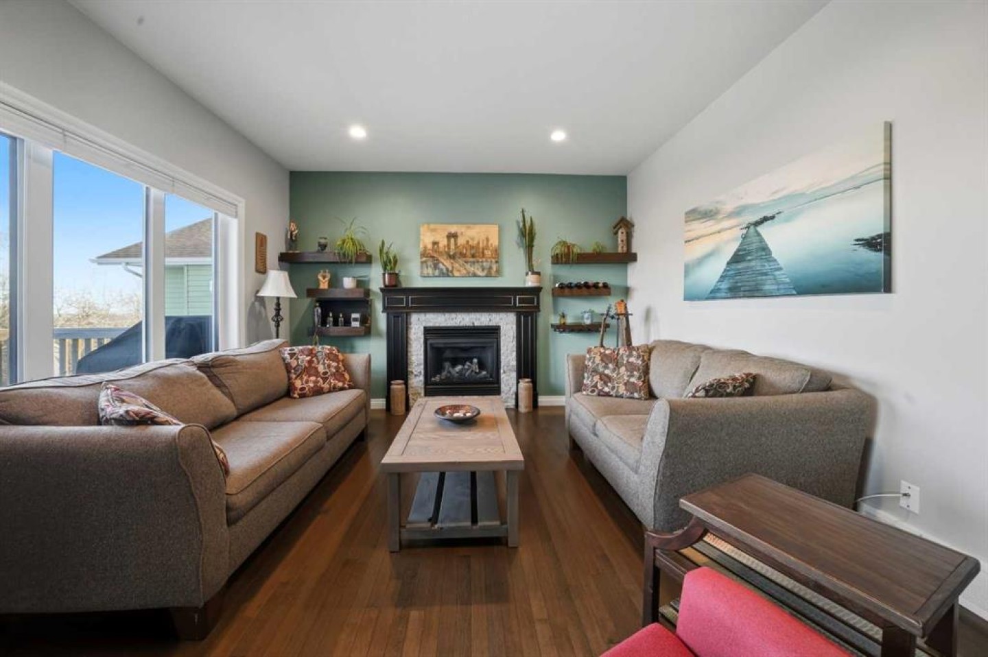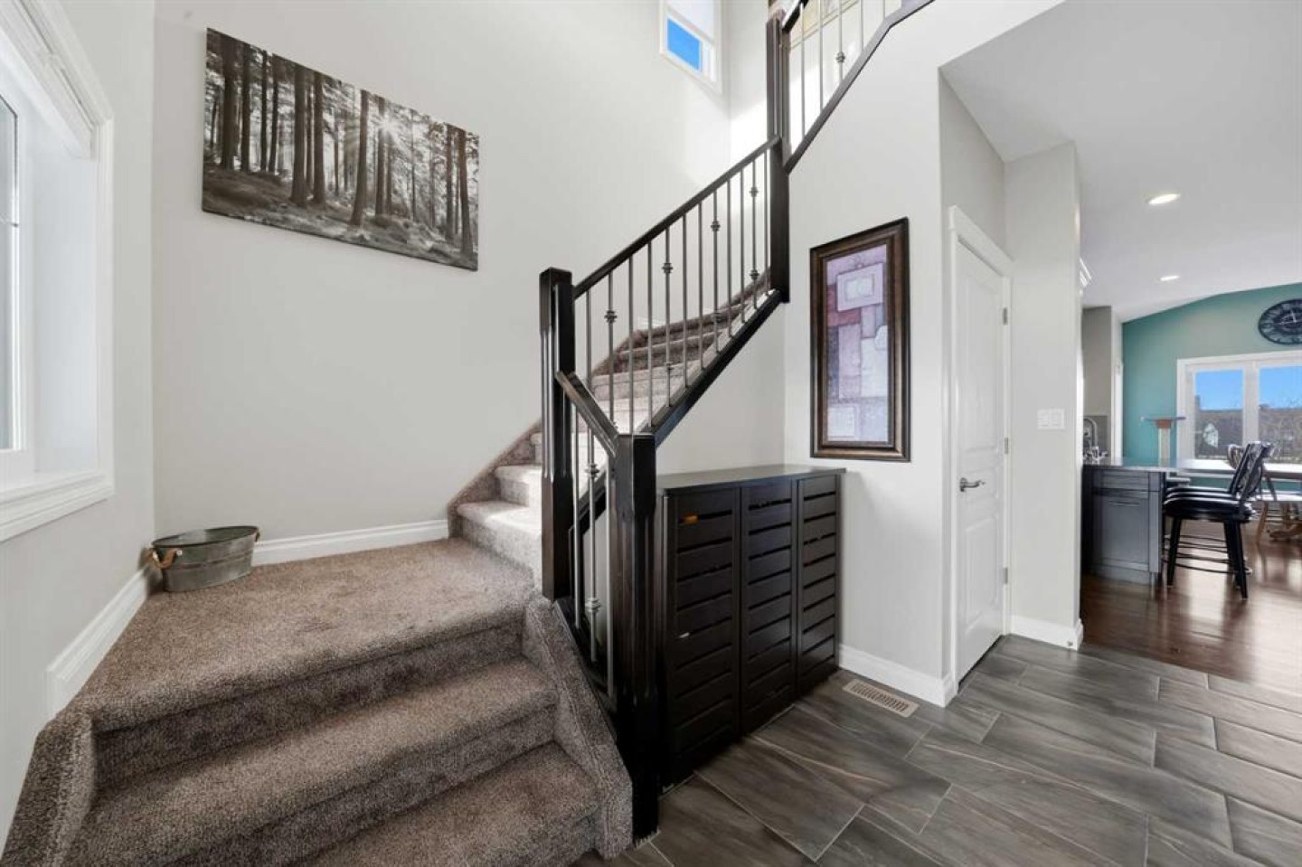 Live at the lake with a lake view! This beautiful walkout two-storey home captures scenic glimpses of the lake and surrounding trees from the upper floors. From the moment you step inside, the spacious entry and open staircase create a grand first impression. The main floor features an open-concept layout with the kitchen, dining, and living areas flowing seamlessly together—ideal for everyday living and entertaining. The kitchen offers ample cabinetry, a large island with seating, corner pantry, stainless steel appliances which include a newer fridge (2023) with water and ice. Hardwood flooring extends through the kitchen, dining, and living room, where you’ll also find a cozy gas fireplace with TV hook ups above and a large window that fills the space with natural light. The dining area opens onto the upper deck through the garden door. A convenient powder room and access to the attached garage complete the main level. The garage is generously sized at 22' x 28'2" and features in-floor heat. Upstairs, the spacious primary bedroom showcases lake views and includes a 5-piece ensuite with double vanity, soaker tub, and separate shower, along with a walk-in closet. The additional upper bedrooms share a Jack-and-Jill bathroom with a separate water closet. A dedicated laundry room completes the upper floor. The walkout basement is partially finished and includes a bedroom and full bathroom completed in 2024. It opens onto a lower deck and a fenced yard backing onto mature trees—offering privacy and a peaceful outdoor setting. Additional highlights include a in-floor heat in the basement (and garage) new hot water tank in 2025, a stone fire pit, fruit trees, and garden beds. This home offers the perfect blend of space, comfort, and lake-area living.