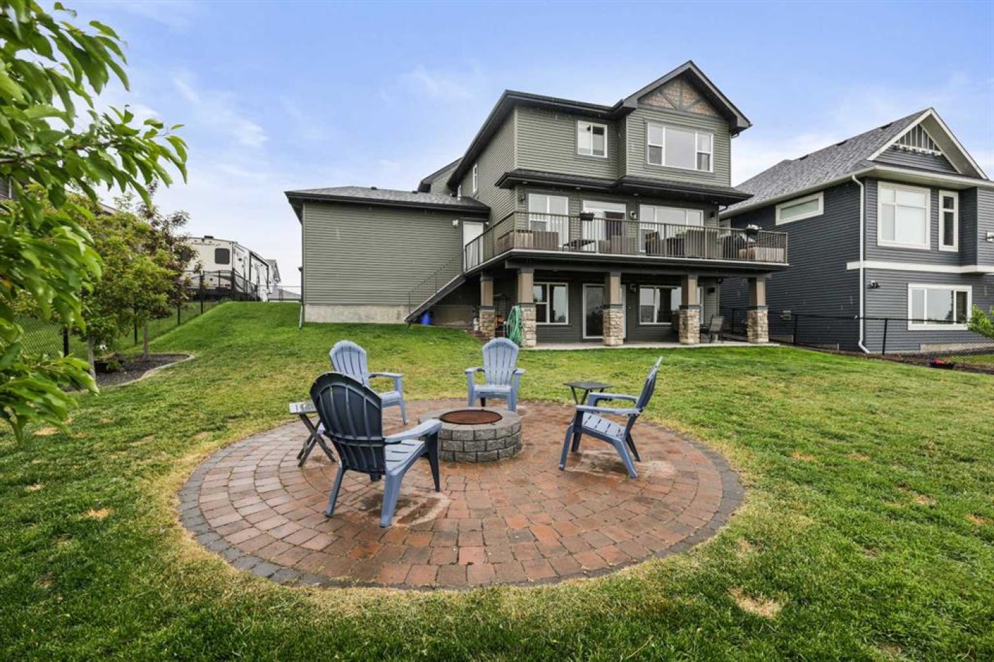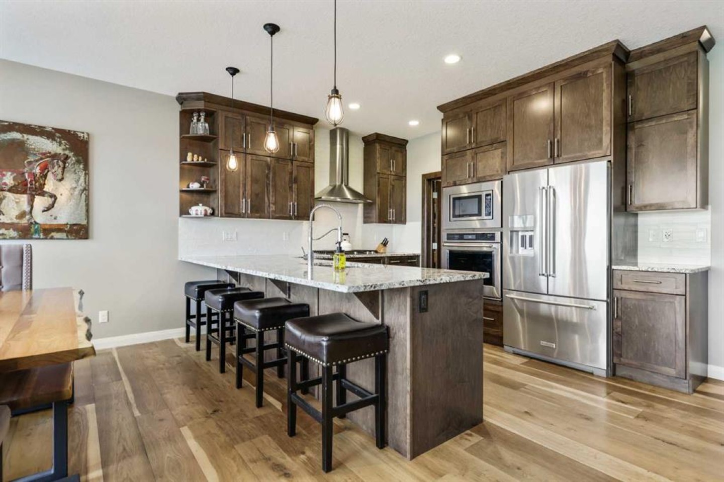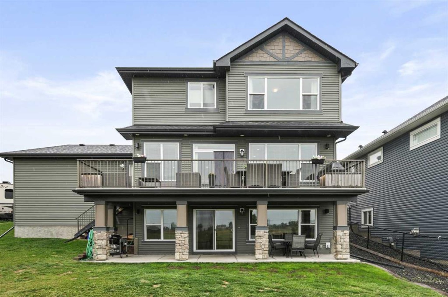 Location, luxury and lifestyle in this fully finished 2 story walkout backing onto hole #3 of the Track Golf Course in beautiful Boulder Creek Estates of Langdon. This exceptional home features water views, almost 2,800 sq ft of living space, central air conditioning and an incredible 5 car heated garage. A designated home office just off the front entrance is the perfect place to work or study away from the main living space. The main living area is a spacious open concept design with an entire wall of windows showcasing your stunning views. Enjoy all the bells and whistles in the chef’s kitchen. Ceiling height cabinetry, granite counters, high end stainless steel appliances including a gas range, wall oven and built-in microwave plus a walk through pantry that even has a coffee bar / butler’s pantry make this your dream kitchen come true. Between the dining room and kitchen is an expansive peninsula with seating perfect for friends and family to gather. The gas fireplace in the living room is both practical and elegant. Gorgeous wide plank hardwood floors and farmhouse inspired lighting throughout add to the charm of this home. The huge upper deck just off the dining room is perfect for outdoor dining, grilling and lounging while taking in your magnificent views. The large mudroom is the perfect place to keep the clutter of outerwear and gear out of your main living space. A 2 pc powder room rounds out this main level. Heading upstairs you’ll find a nice bonus room with a tray ceiling. It’s the perfect place for the family to curl up with a good book or to watch a movie together. The spacious primary bedroom has a large window overlooking your beautiful golf course & water views. Indulge yourself in the spa inspired 5 pc ensuite bath with freestanding soaker tub, large glass shower, heated floors and dual sinks. The oversized walk in closet is another luxury you’re sure to appreciate. The other 2 bedrooms share the main bath which has a door separating the sink from the rest of the bathroom making busy mornings a little less chaotic. You’re going to love entertaining with friends and family in the fully finished walk out basement. A rustic wood burning fireplace adds a warm and cozy vibe, and the wet bar, 4 pc bath and luxury vinyl plank flooring offer every convenience you could need. Step out to your covered patio area that leads to your huge outdoor living area. There is tons of lawn space for kids and pets to play, a stone fire-pit area for friends to gather plus manicured flower beds, raised planters and plenty of trees. Don’t miss your chance to call this home in the charming community of Langdon yours.