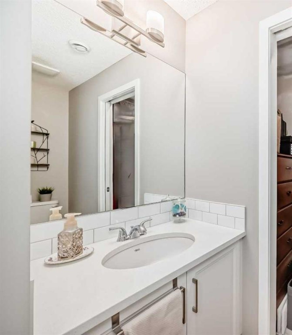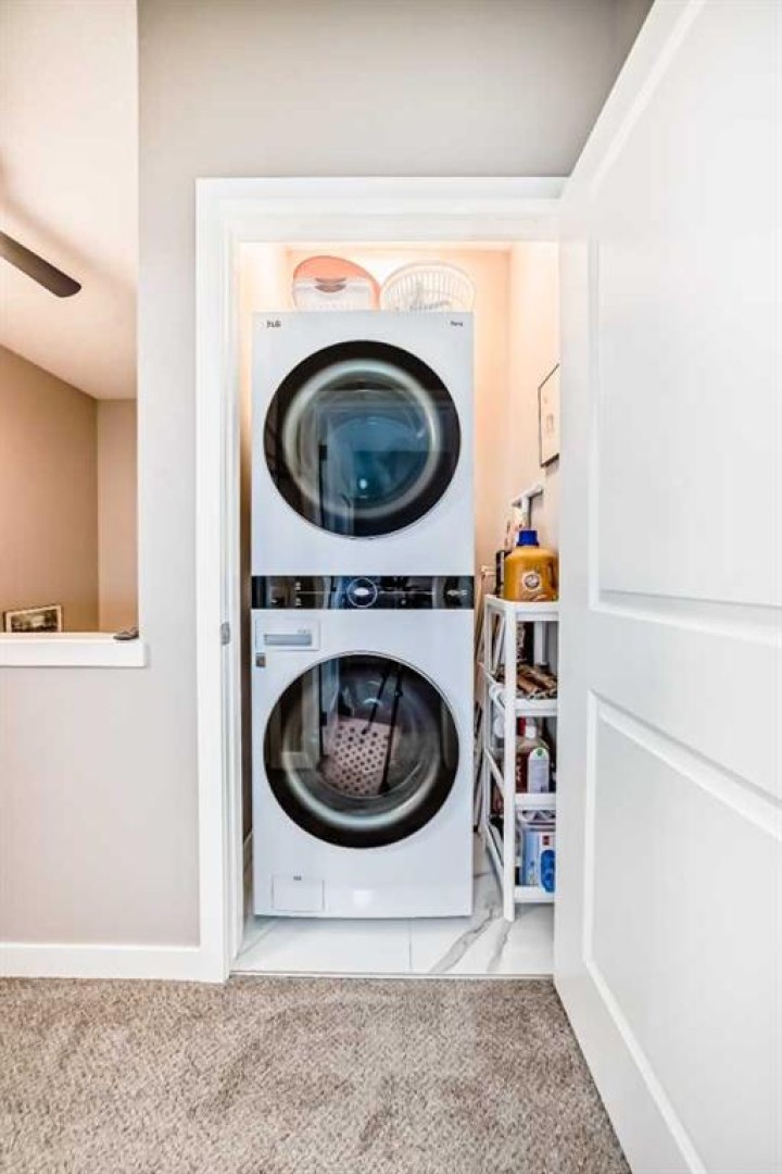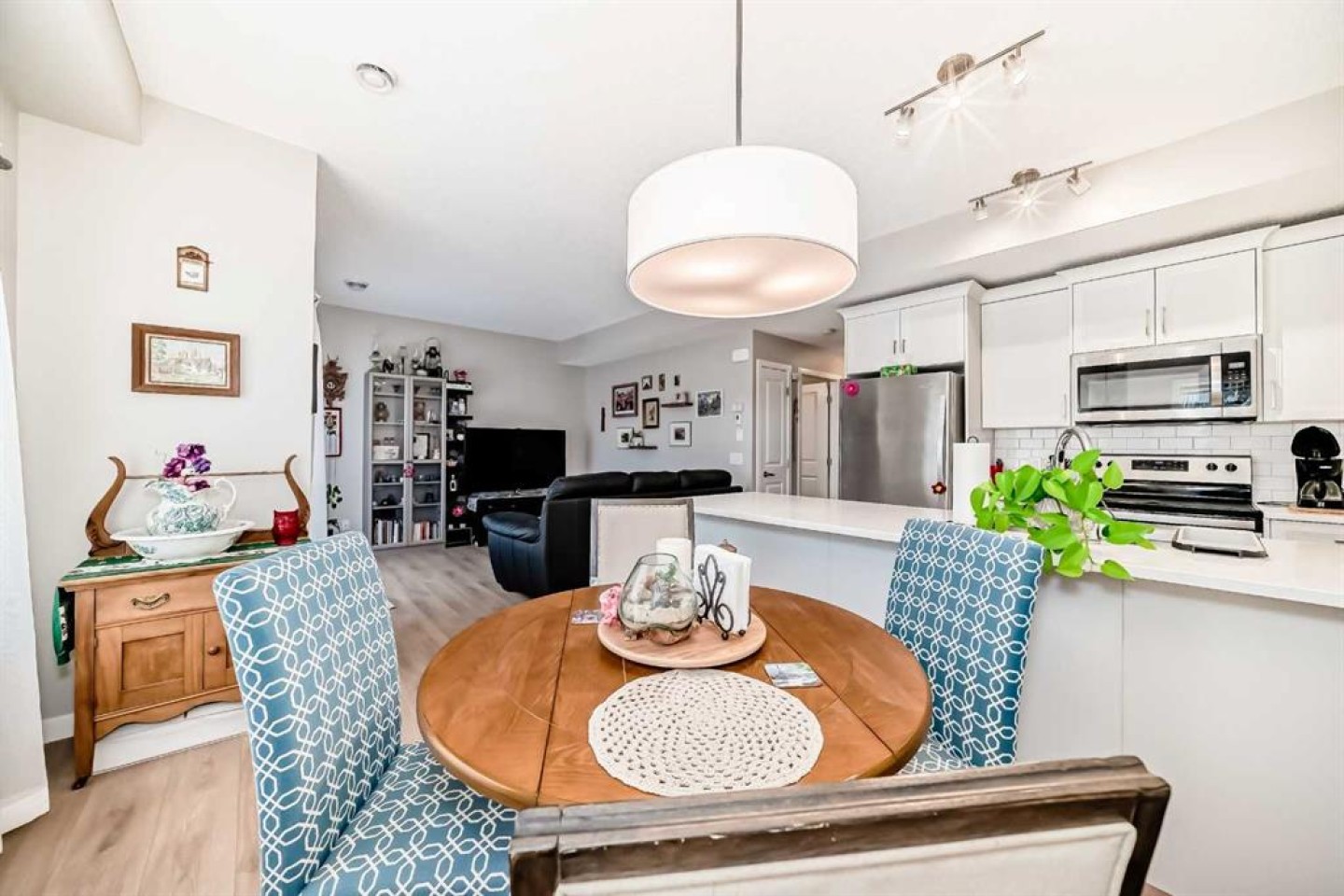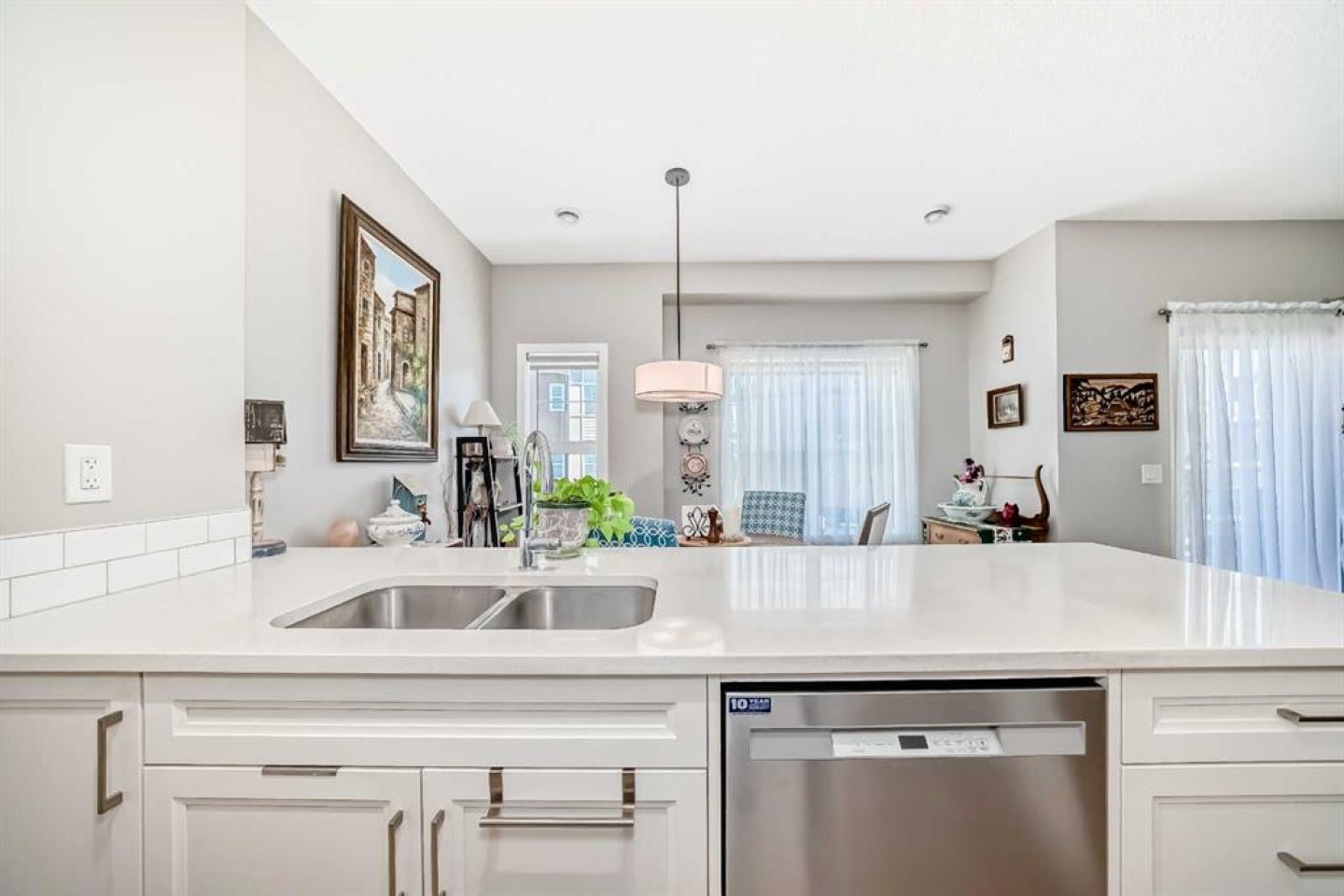 Welcome to this immaculate, upgraded townhome in the desirable community of Fireside, Cochrane, featuring peaceful pond and green space views that create a tranquil, nature-inspired setting. The bright, open-concept layout showcases a modern kitchen with quartz countertops, white shaker-style cabinetry with pull-out drawers, stainless steel appliances, and breakfast bar; other upgrades include wide plank flooring, plush carpets, 9-foot ceilings, quartz counters throughout, and energy-efficient LED lighting. Large windows and patio doors open to two private balconies with views of the pond, ideal for morning coffee or evening relaxation. The home offers two spacious bedrooms, including a primary bedroom with a walk-in closet; a full bathroom and a stylish powder room, upper-floor laundry, ample storage, as well as a separate storage unit, and a titled parking at the side of the front door, just perfect for off loading groceries and everyday errands. Located in a well-managed, family-friendly complex close to schools, parks, walking paths, shopping, and recreation, with easy access to Calgary and approximately one hour from Banff and Canmore, this home delivers exceptional value and lifestyle.