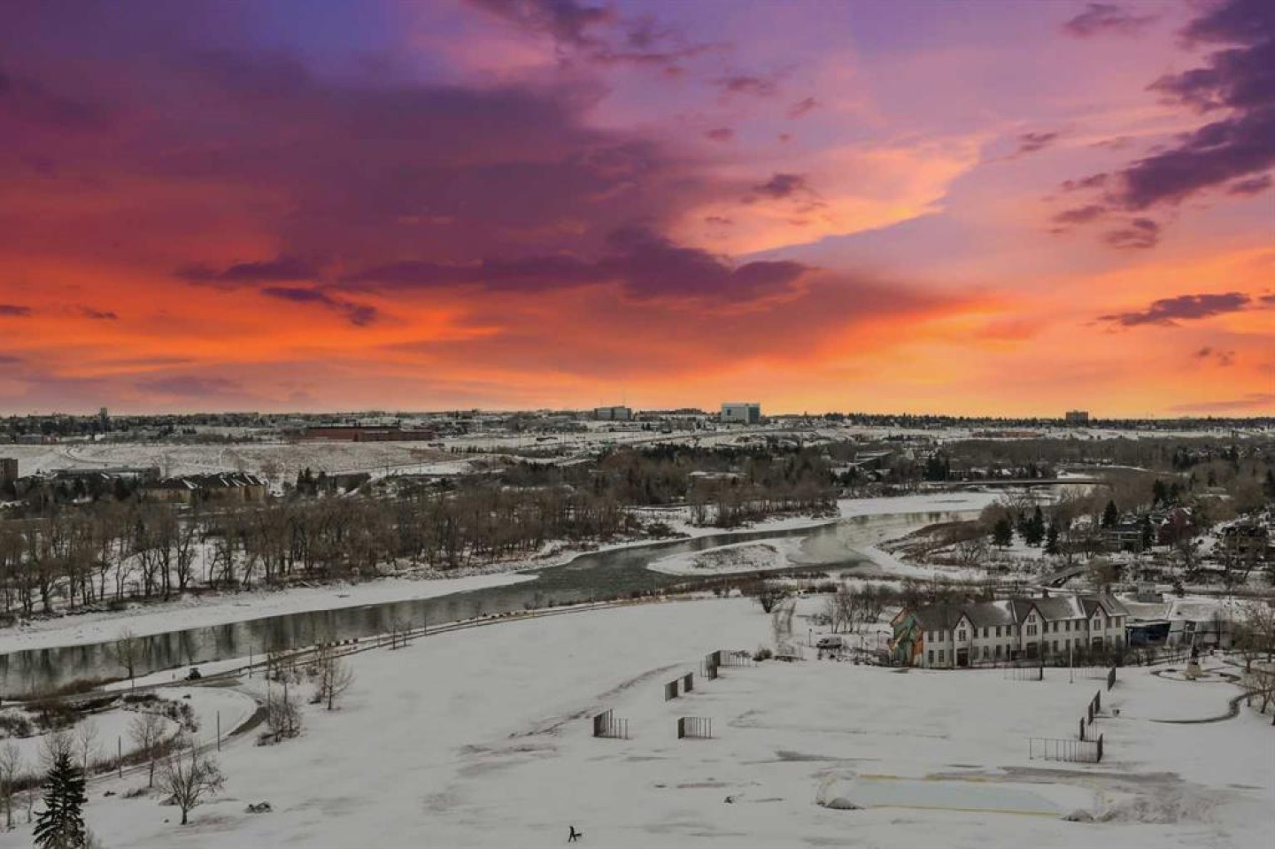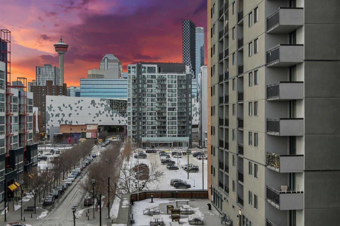 Welcome to this stunning 2-bedroom, ultra-modern corner condo offering breathtaking panoramic views and an unbeatable inner-city lifestyle. Designed with both style and functionality in mind, this bright and spacious home features 9-foot ceilings, floor-to-ceiling windows, and a spectacular balcony perfect for enjoying Calgary’s skyline and unforgettable sunsets. From the moment you enter, you’re greeted by unobstructed views of the Calgary Tower, Central Library, and Stampede Grounds, creating an instant wow factor. The open-concept layout is flooded with natural light and showcases contemporary finishes throughout, including a sleek kitchen, modern bathroom, and thoughtful design that maximizes both space and comfort. The southwest exposure enhances the airy feel, while the partially covered balcony allows for year-round enjoyment. Additional highlights include concrete construction for superior soundproofing, in-suite laundry, a spacious foyer, central storage closet, titled heated underground parking, and assigned storage. The building offers exceptional amenities, including a rooftop social lounge and patio ideal for watching Stampede fireworks or enjoying views of the Bow River and downtown skyline, as well as a bike storage room with repair station and a dedicated dog wash. Ideally located on a quiet, low-traffic street yet steps from downtown, transit, river pathways, shops, restaurants, and entertainment, this move-in-ready home delivers the perfect blend of modern living, walkability, and vibrant urban lifestyle.