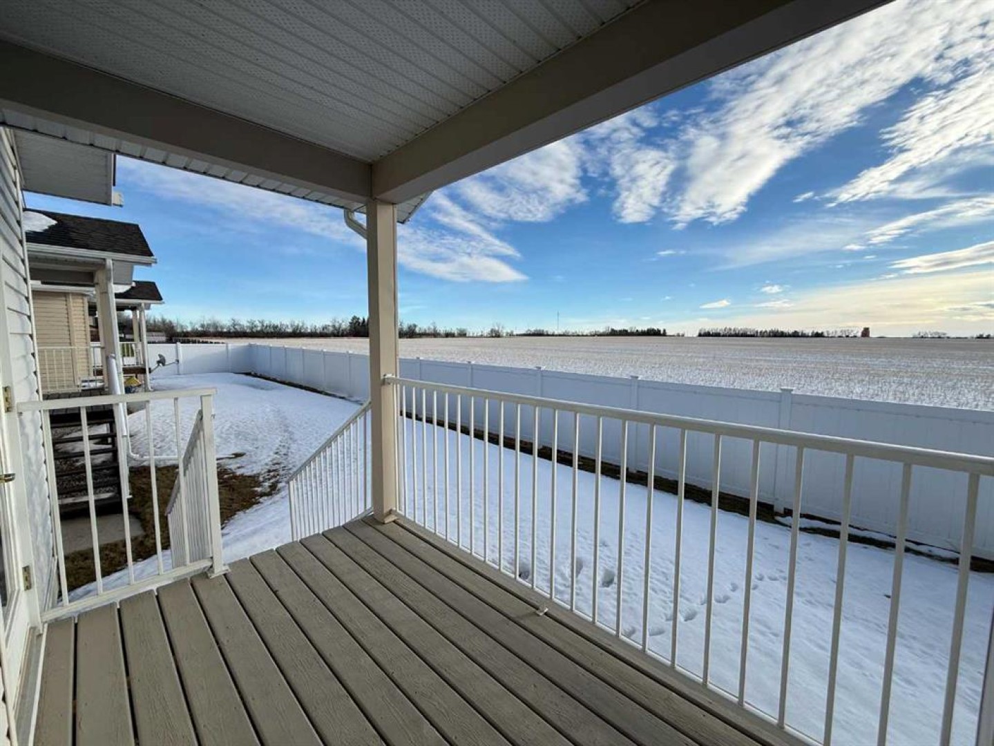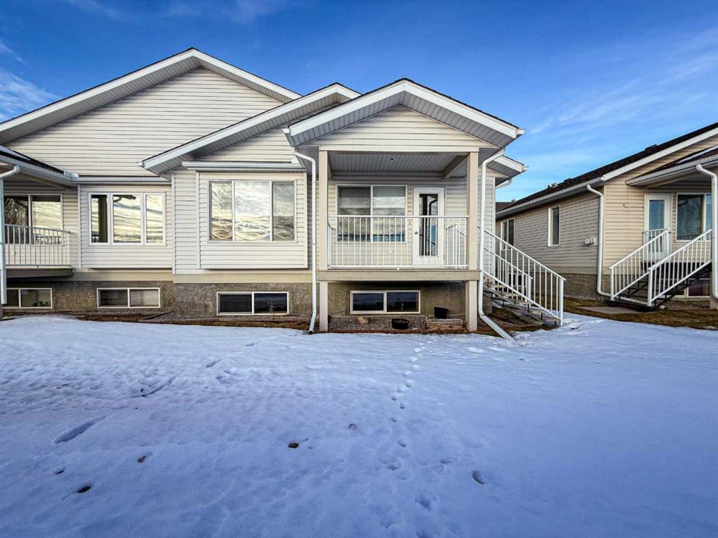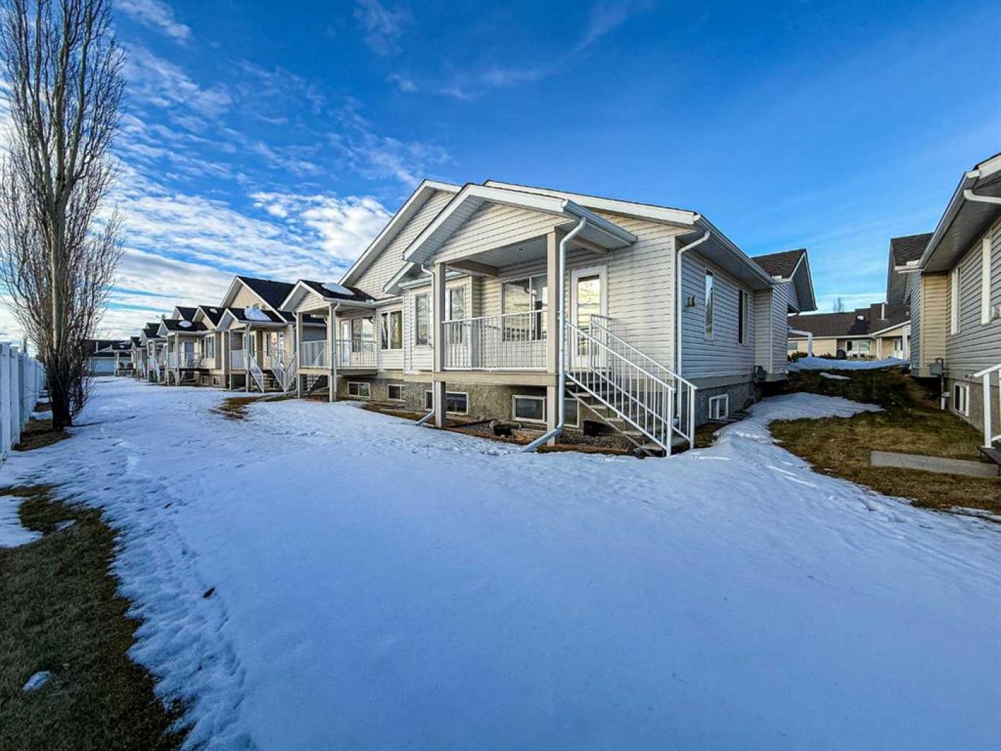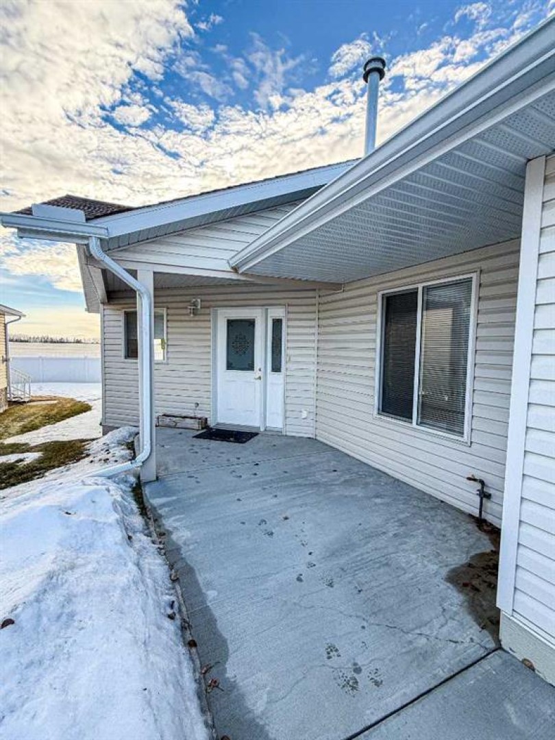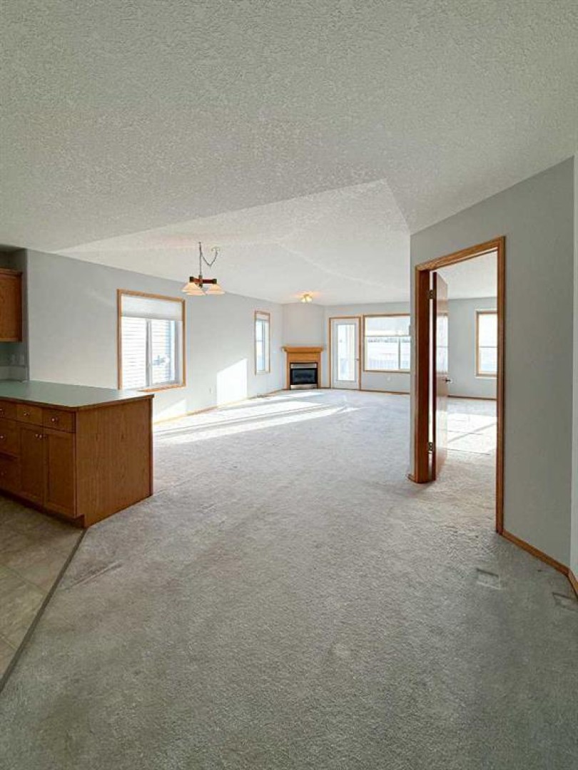 Half duplex condo with a beautiful view. Enjoy unobstructed southwest views overlooking open fields and the mountains. This unit is one of the most desirable locations in the adult 55+ community of The Meadows. The thoughtfully designed floor plan features a spacious open concept with vaulted ceilings, corner gas fireplace, three-piece bathroom and main floor laundry with a sink and access to the double attached garage. The south facing living room captures the stunning view and offers a door to the covered rear deck. The kitchen and eating area is open and generous in size, offering abundant counter, cupboard and storage space. The large primary bedroom features, a walk-in closet and a three-piece ensuite. A second bedroom on the main floor can be used as a guest bedroom or office. The fully developed basement offers a spacious family room and additional large bedroom, two-piece bathroom (shower or bath could be added) and tons of storage. This home offers level entry from both the front door and the garage. Condo fees include use of the clubhouse, snow removal, lawn care, exterior building insurance, and RV parking if available. For those seeking a virtually maintenance-free lifestyle in a well-maintained community, this property is an excellent choice. Call today to book a tour!!