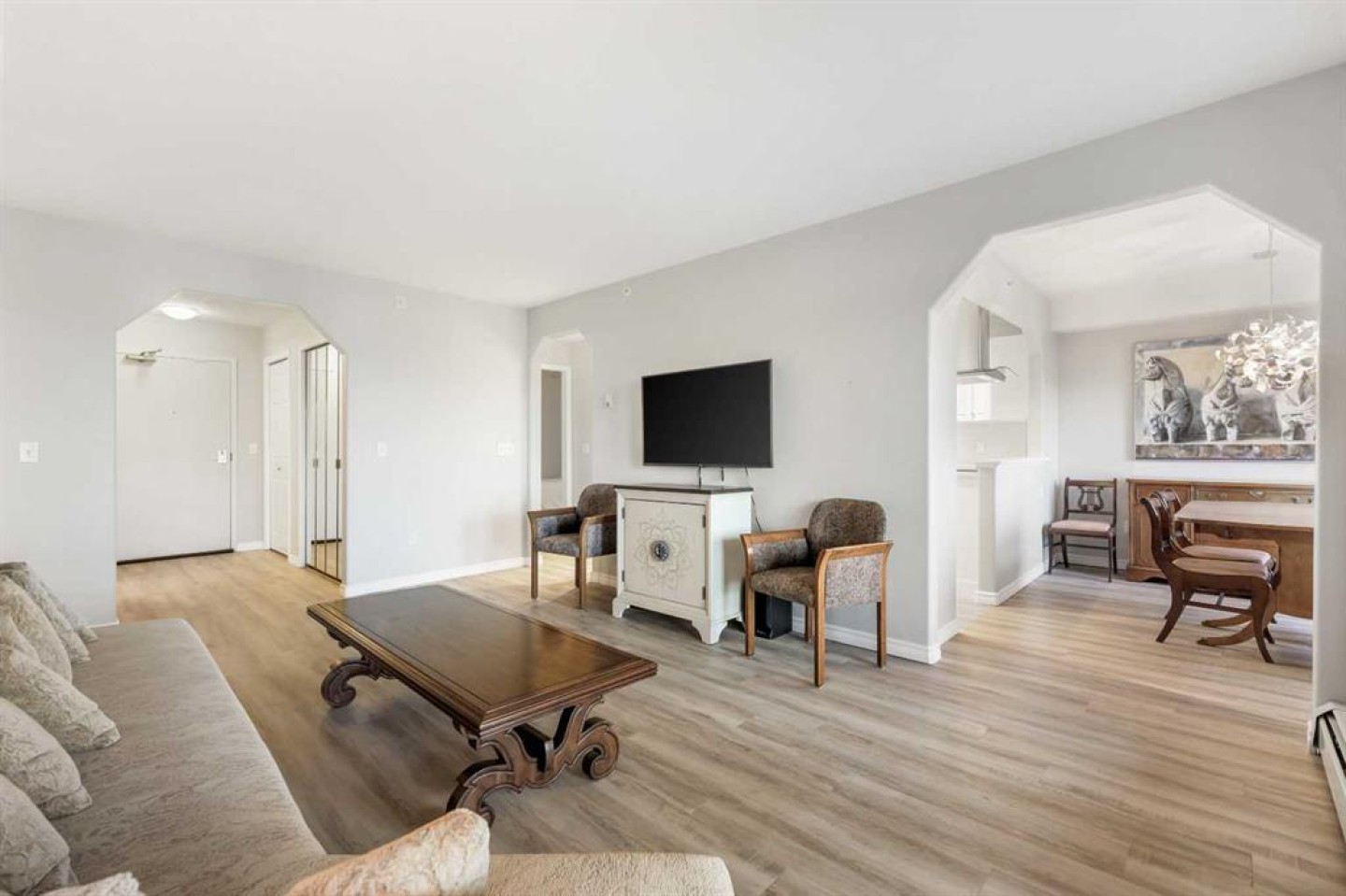 Welcome to #404, 7239 Sierra Morena Boulevard SW – a bright and spacious 1 bedroom plus flex room, 2 bathroom condo located on the 4th floor (top floor) of the desirable Sierras of Richmond Hill, a welcoming 55+ adult community in the heart of Richmond Hill. Very bright and open with updated flooring throughout, this beautifully updated unit features a well-equipped gourmet kitchen with lots of cabinetry, open to a dining room – perfect for cooking, entertaining, and gathering with friends. The generous open-concept great room flows seamlessly into a private sunroom with stunning mountain views – ideal for enjoying your morning coffee or peaceful sunsets. The primary bedroom includes a built-in portable air conditioner for year-round comfort and an updated 4-piece ensuite that showcases double sinks and an oversized shower, followed by a large walk-through closet for excellent storage. An updated 2-piece powder room off the entrance adds convenience for guests. The flex room off the kitchen features built-in desk space and cabinetry, offering the versatility of a home office, sewing room, hobby room, or guest area. In-suite laundry adds everyday convenience. Pride of ownership is shown throughout – this home is truly move-in ready and waiting for you to enjoy. This pet-friendly building (with board approval) offers exceptional amenities, including a Car Wash, Elevator, Fitness Center, Guest Suite, Party Room, Picnic Area, Recreation Room, Workshop, Visitor Parking, and Secured Underground Parking. Includes one underground heated parking stall with a storage locker. Condo fees are all-inclusive, covering electricity, heat, water, sewer, recycling, and garbage, offering truly worry-free living in a professionally managed, beautifully maintained complex. Ideally situated within walking distance to Westhills Towne Centre, grocery stores, restaurants, transit options, and medical services – with quick and easy access to Stoney Trail for seamless travel across the city. This top-floor gem combines comfort, convenience, and community — the perfect place to call home!