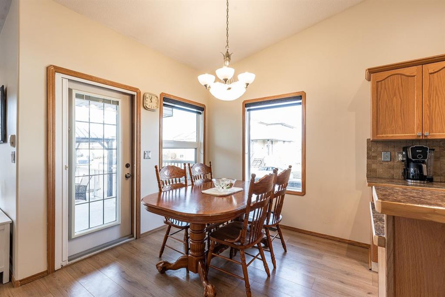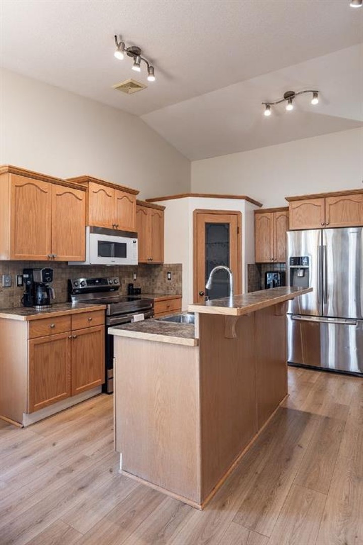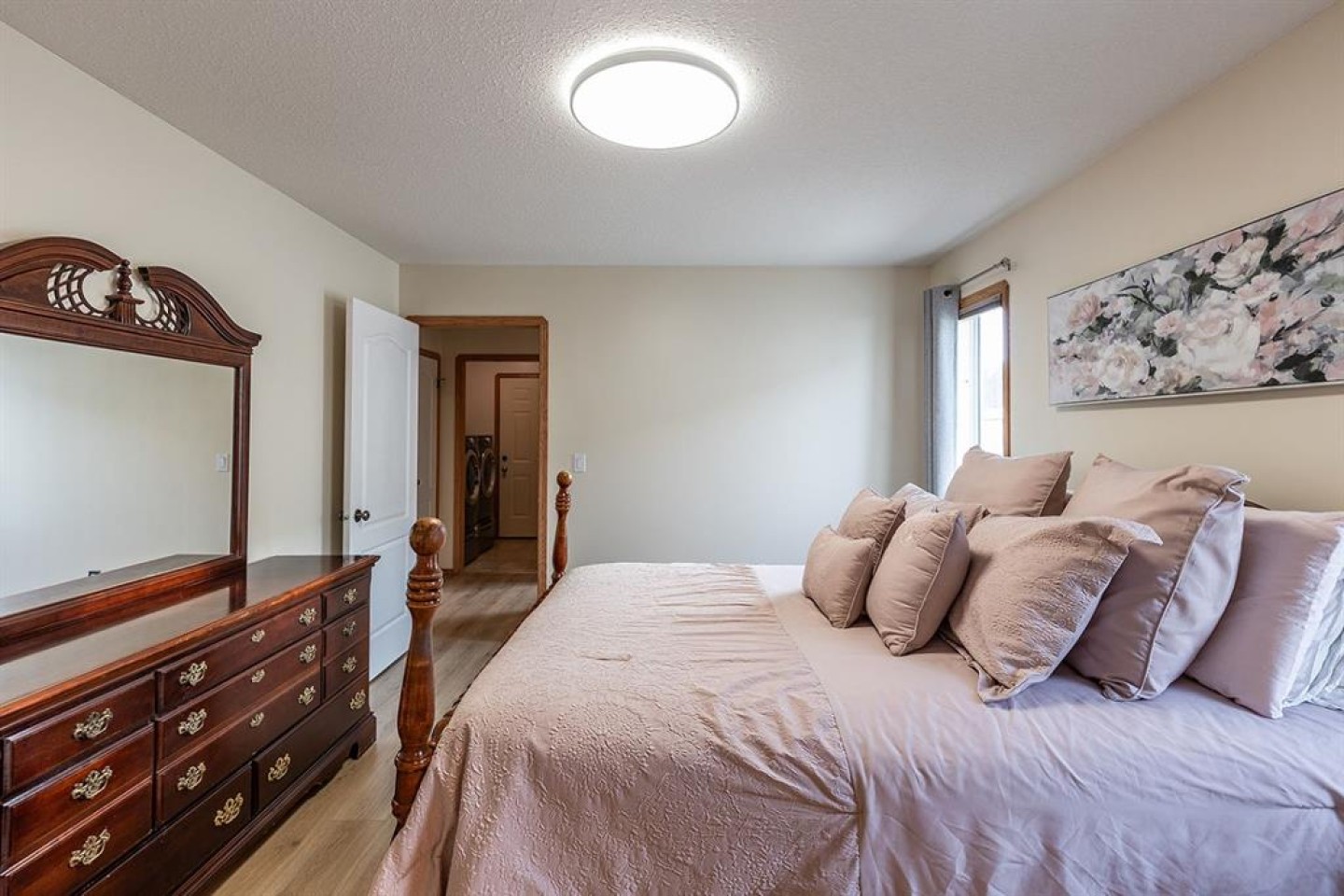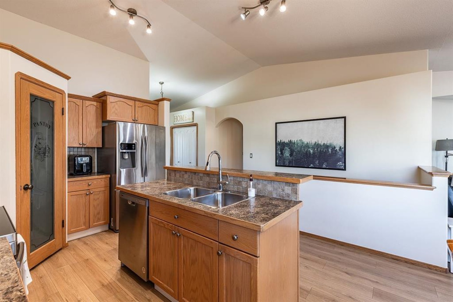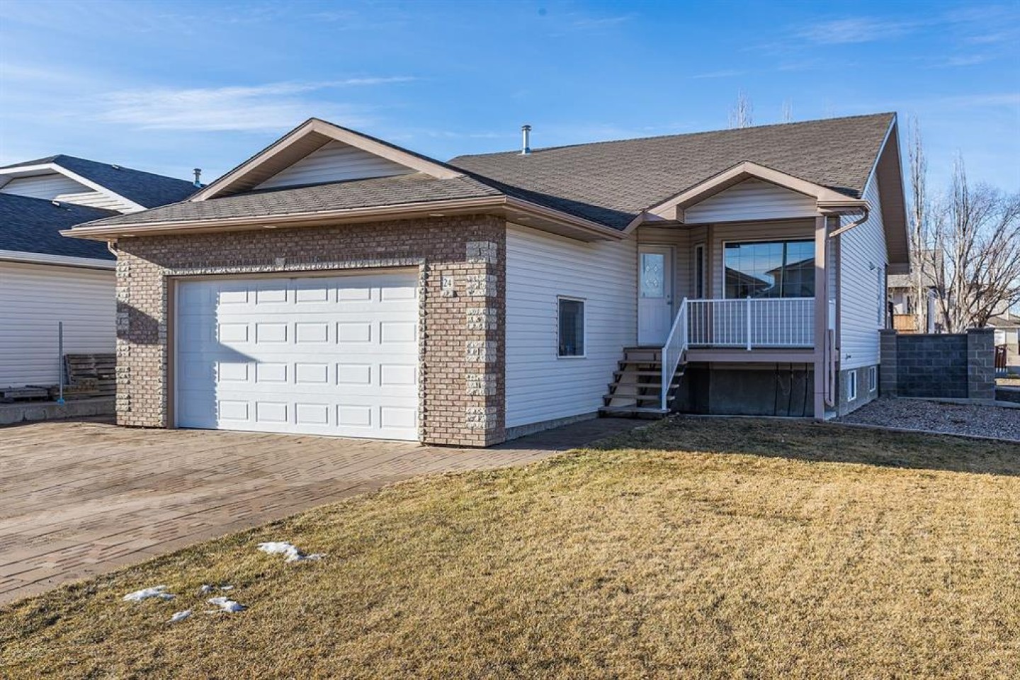 This beautifully designed 1,200+ sq ft bungalow is ideally positioned on a corner lot, showcasing a timeless brick front exterior, masonry fencing, and a thoughtfully planned low-maintenance yard complete with a storage shed. From the moment you enter, you’ll appreciate the bright, open layout enhanced by vaulted ceilings and vinyl plank flooring throughout the main level. The heart of the home is the spacious kitchen, featuring stainless steel appliances, a large island with seating, ample cabinetry, and seamless flow into the dining and living areas—perfect for both everyday living and entertaining. The inviting living room is anchored by a cozy gas fireplace, creating a warm and welcoming atmosphere year-round. Just off the main living space, step onto the oversized deck, ideal for summer barbecues, outdoor dining, or relaxing evenings. The main floor offers two generous bedrooms, including a primary suite with its own ensuite, along with a dedicated office—perfect for remote work or a quiet study space. Main floor laundry adds everyday convenience and completes the highly functional layout. Downstairs, the fully finished basement expands your living space with two additional bedrooms, a modern 3-piece bathroom with walk-in shower, and a well-appointed bar and entertainment area, making it an ideal space for hosting guests, movie nights, or accommodating family and visitors. Additional highlights include a double attached garage, ample storage options, and a layout that offers comfort, style, and practicality. This move-in-ready bungalow combines quality finishes, versatile living spaces, and an excellent location—perfect for families, professionals, or those seeking single-level living with room to grow.